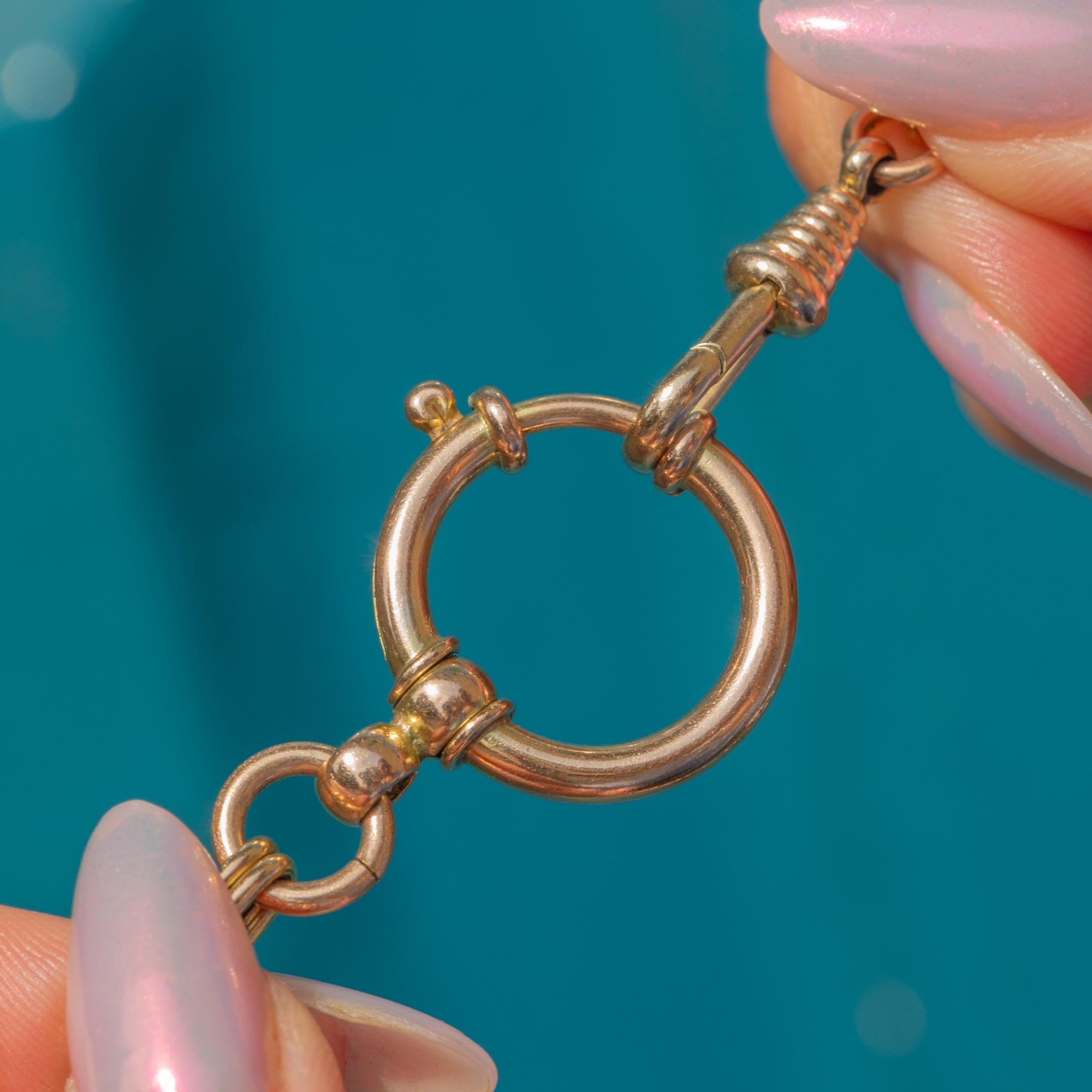 This 9ct Gold cased Victorian chain extender is a gorgeously buttery piece! Chubby, graduating curb links make up the 10" length, and the chain comes complete with a large bolt-ring and dog clip, making it a versatile addition to your collection.