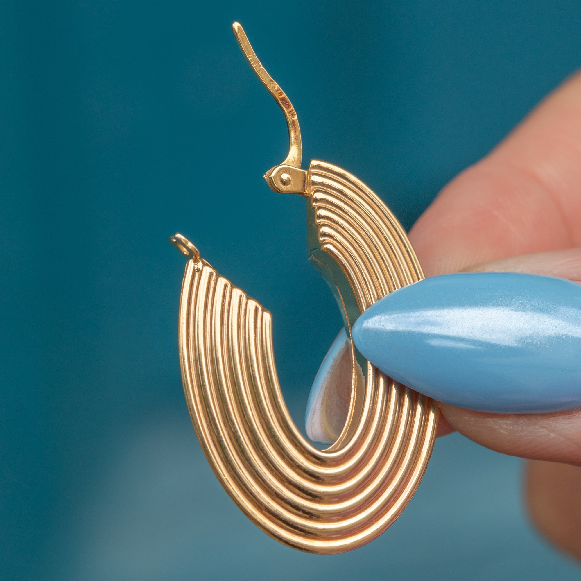 EXCELLENT: The Gold is bright and buttery and the ridged texture is free from surface wear. The levers slot into place securely, so you can wear these vintage hoop earrings with confidence!