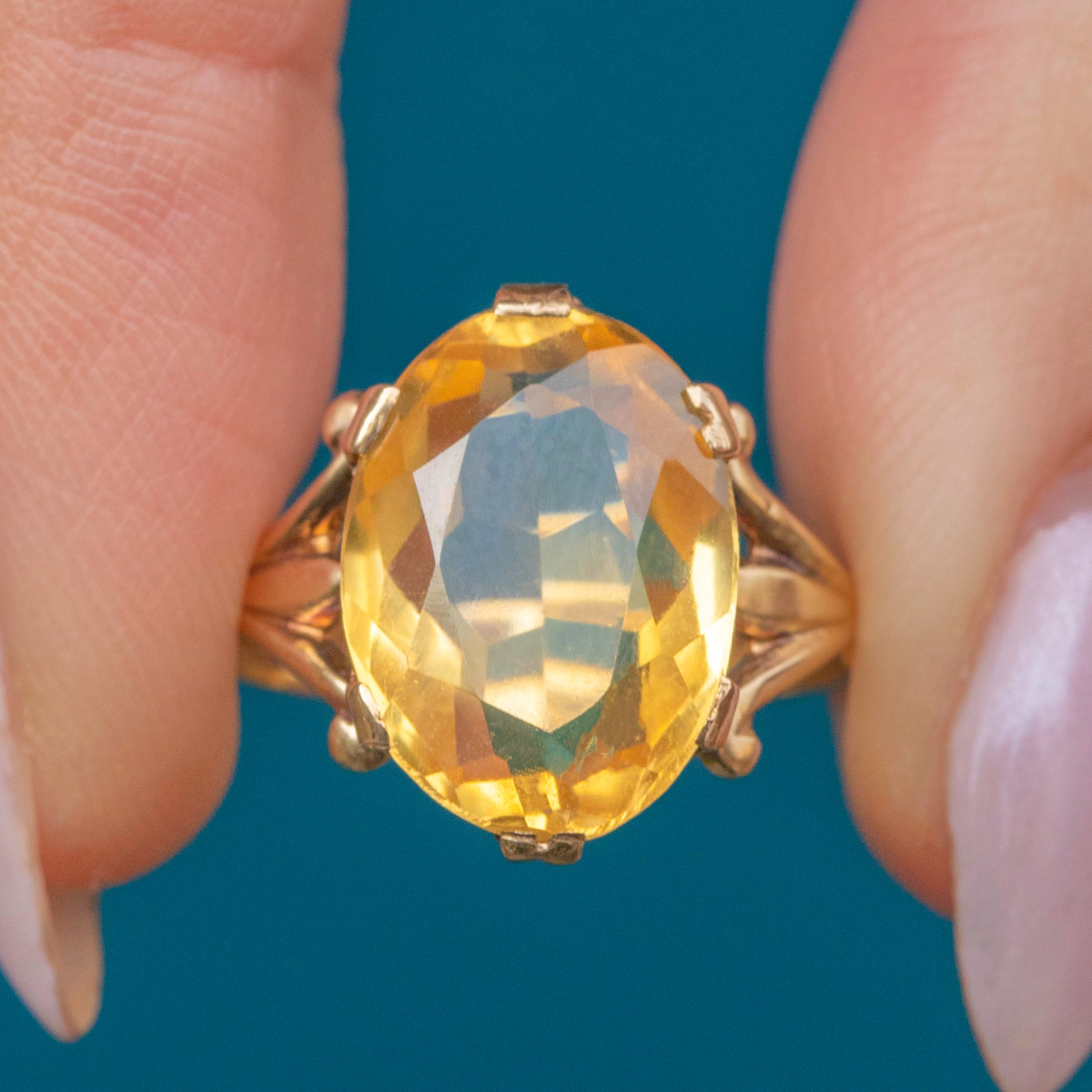 EXCELLENT. This 9ct Gold Citrine dress ring is in excellent condition. The Citrine is secure within its settings and free from chips or abrasions. The ring has lovely split shoulders that lead out onto a gorgeously smooth band, stamped and dated to 1961. You will love wearing this ring!