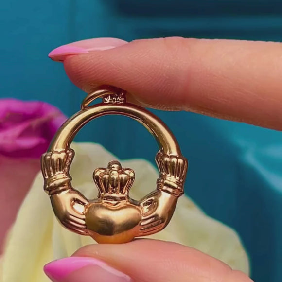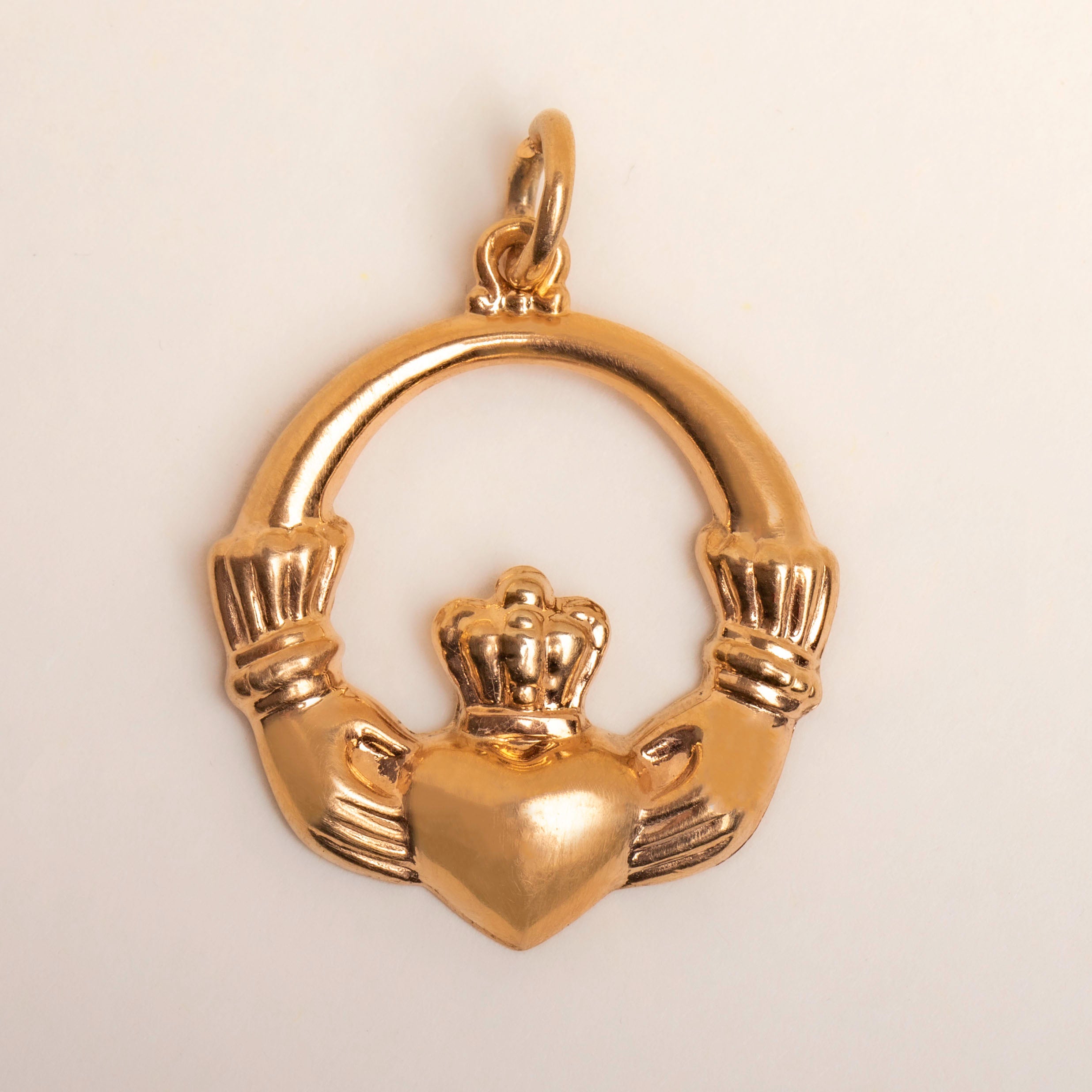 Bring sentimentality to your jewellery box with this 9ct Gold Claddagh pendant! An Irish design, the Claddagh motif is steeped in symbolism: the heart love, the crown loyalty and the hands friendship.