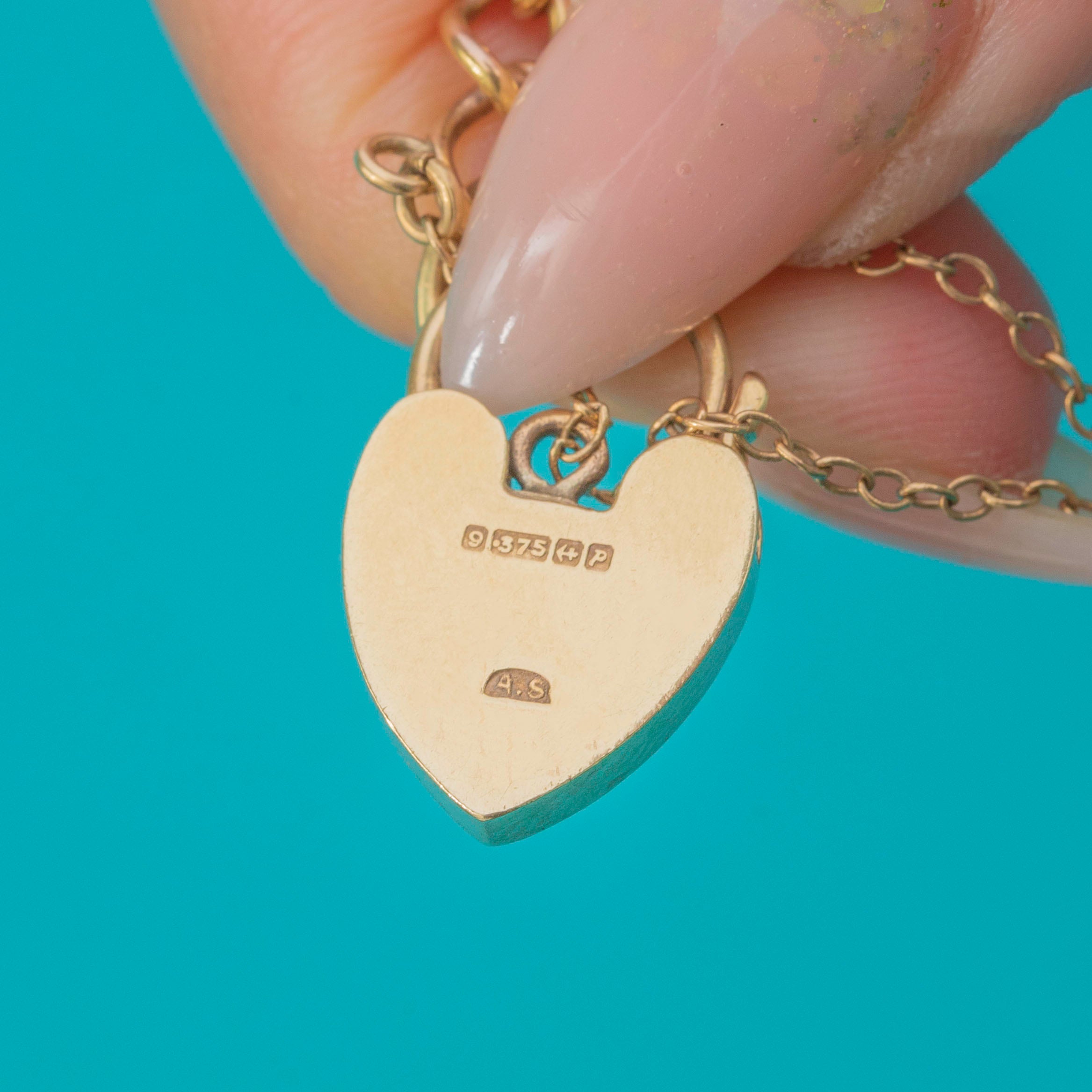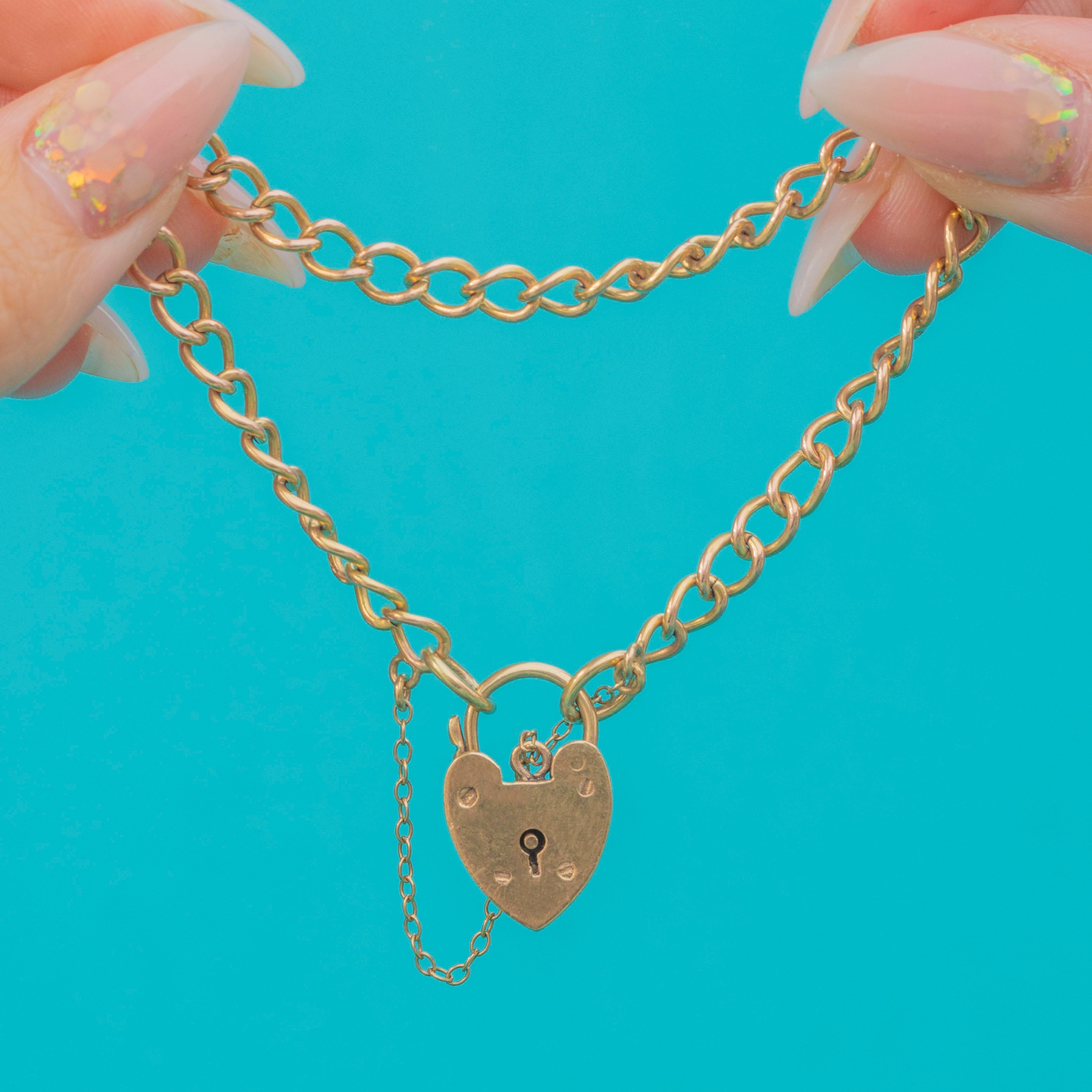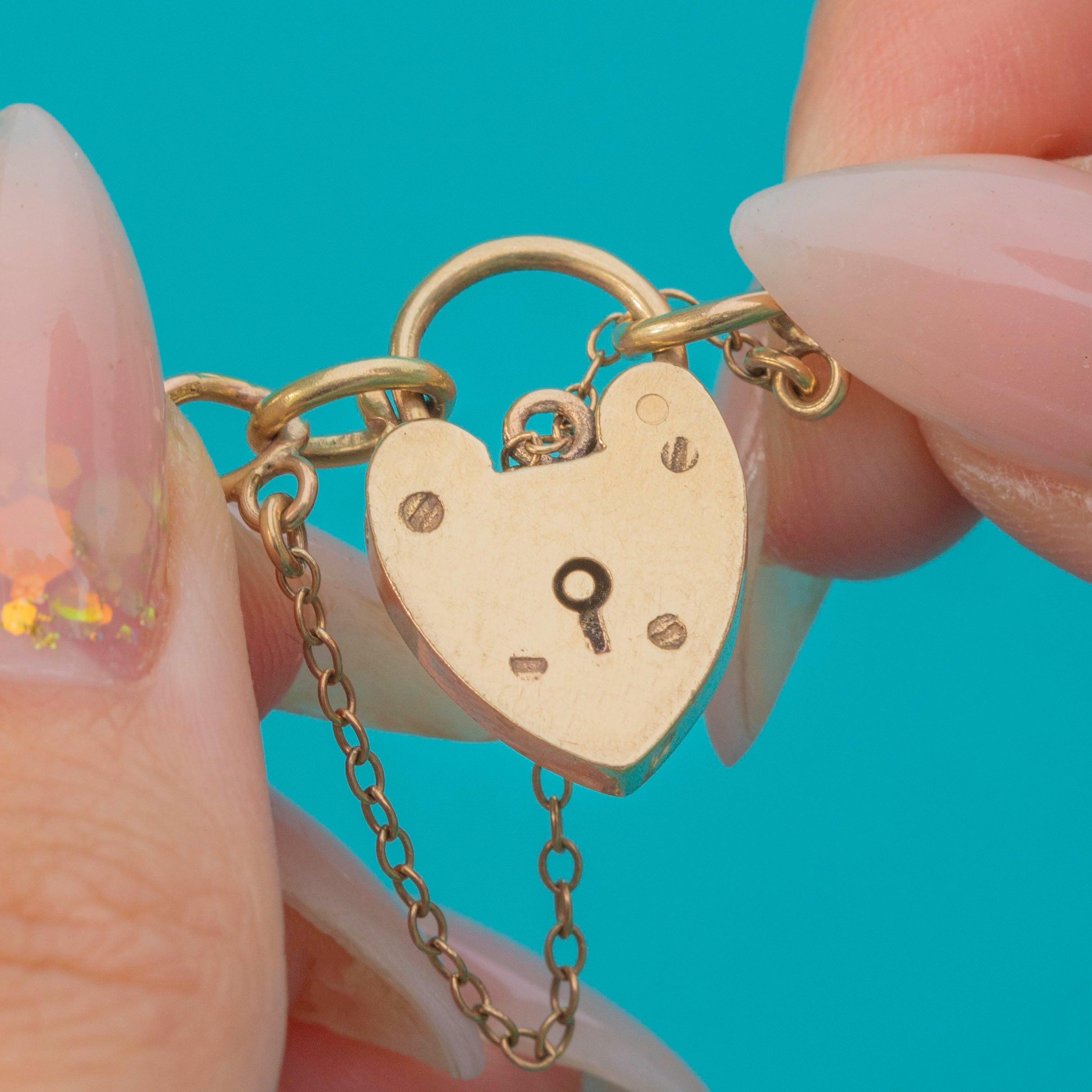 This charming Vintage bracelet is crafted in 9ct Gold with classic curb links and a romantic heart padlock clasp. A safety chain adds extra security, making it as practical as it is stylish.