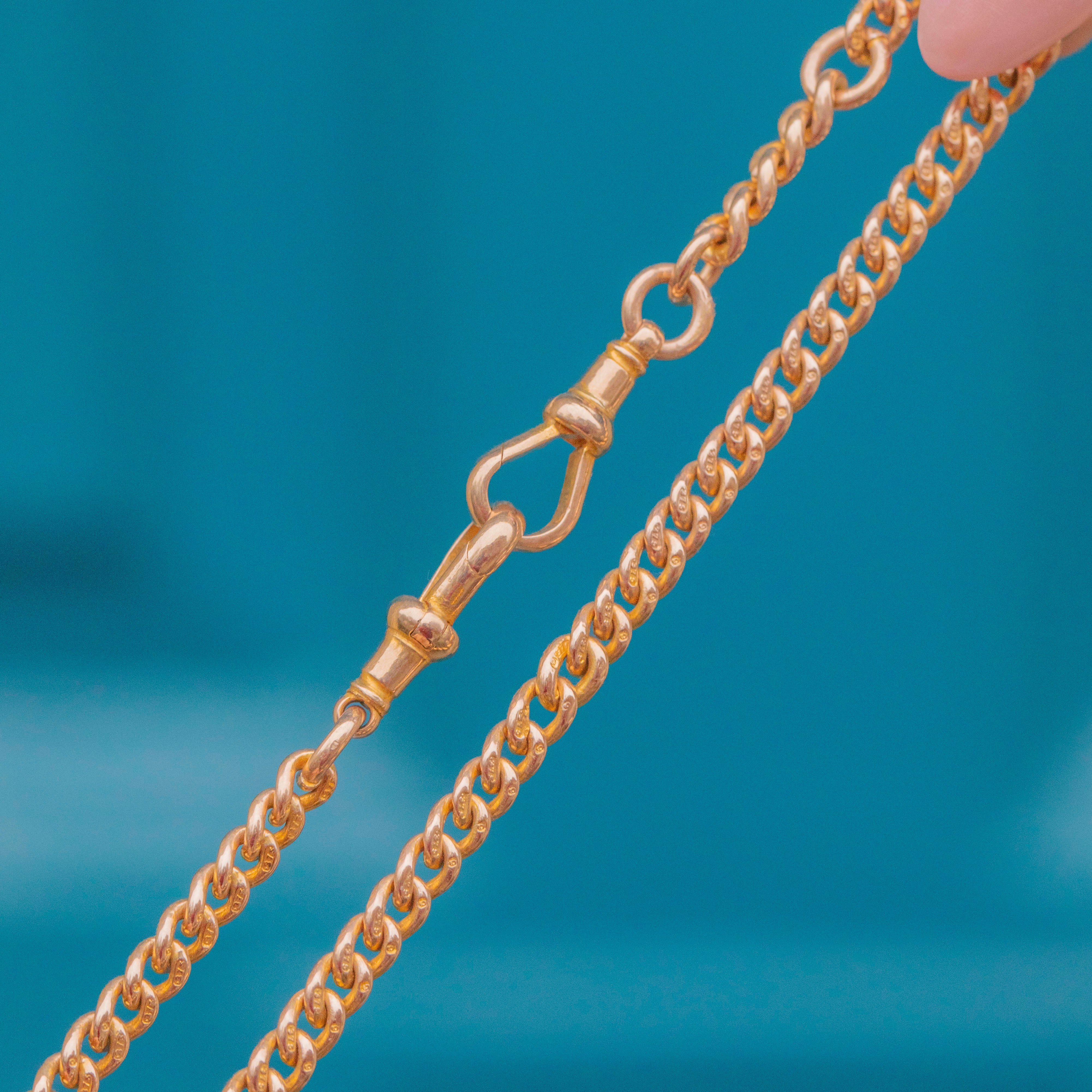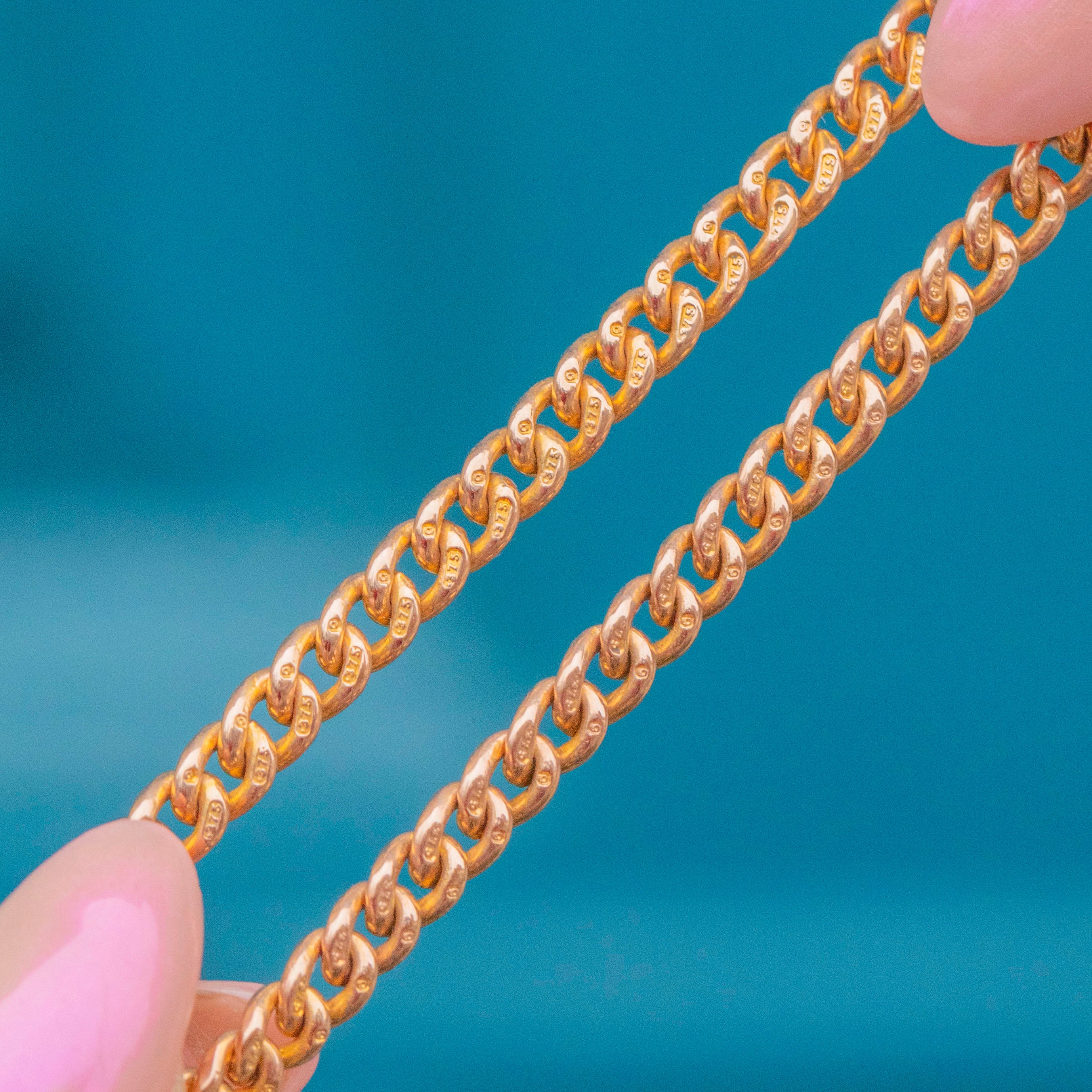 EXCELLENT. This 9ct Gold Albert chain is in excellent condition. The dog-clips function perfectly, the t-bar runs smoothly across it and every link has retained its crisp stamps. A lovely choice for your collection.