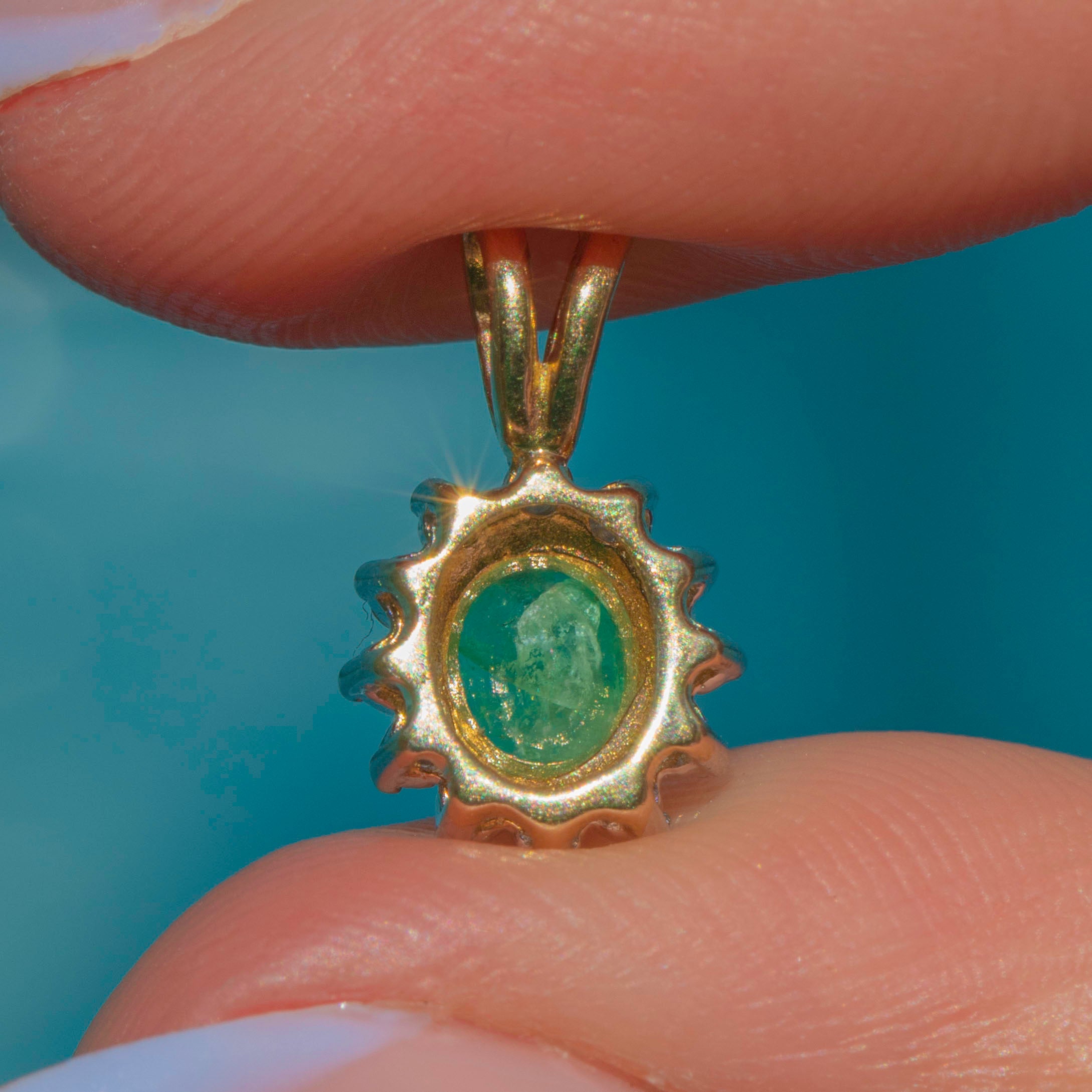 EXCELLENT: This 9ct Gold Emerald Diamond cluster charm is in excellent condition. Each of her gemstones is radiant, with no chips or abrasions, and set securely within its setting. With a secure bale, you can wear this vintage charm with confidence!