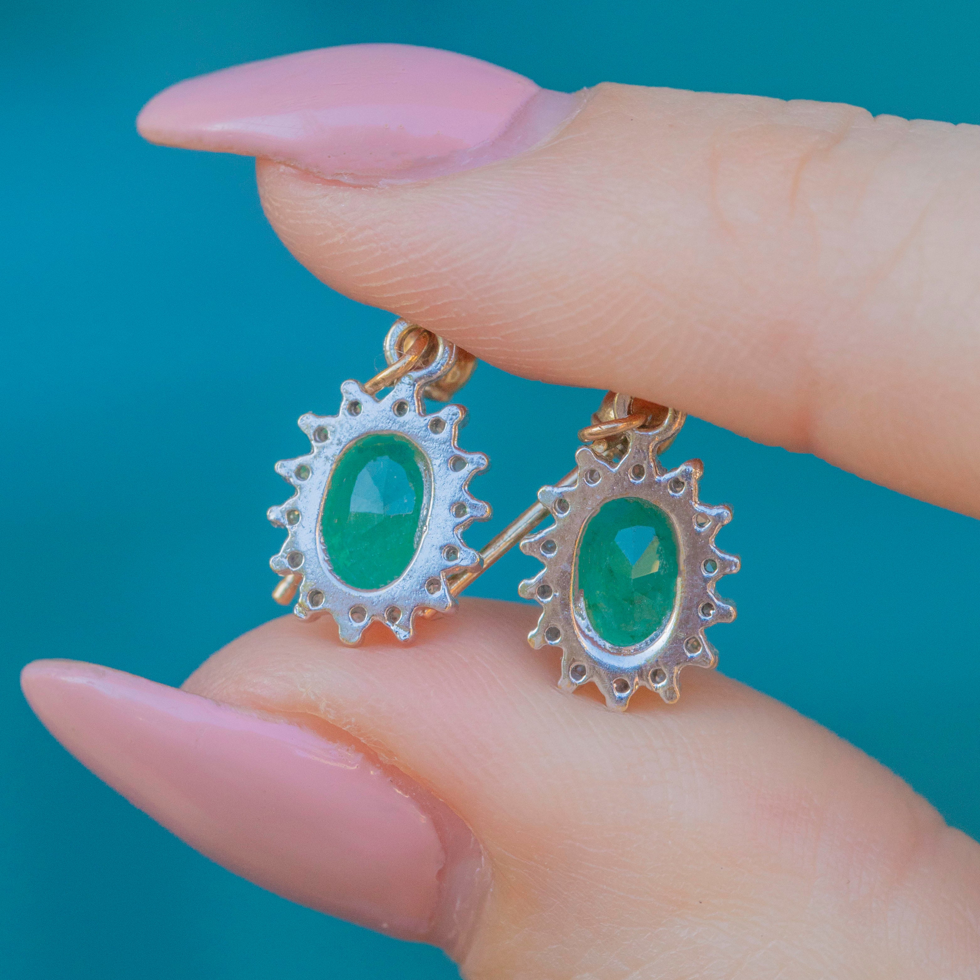 EXCELLENT. These 9ct Gold Emerald Diamond cluster earrings are in excellent condition. The Emeralds and Diamonds are rich and vibrant and free from any nibbles or scuffs. They sit securely within their white Gold settings and have a gorgeous swing. In such wonderful condition, they promise many more years of wear and enjoyment!