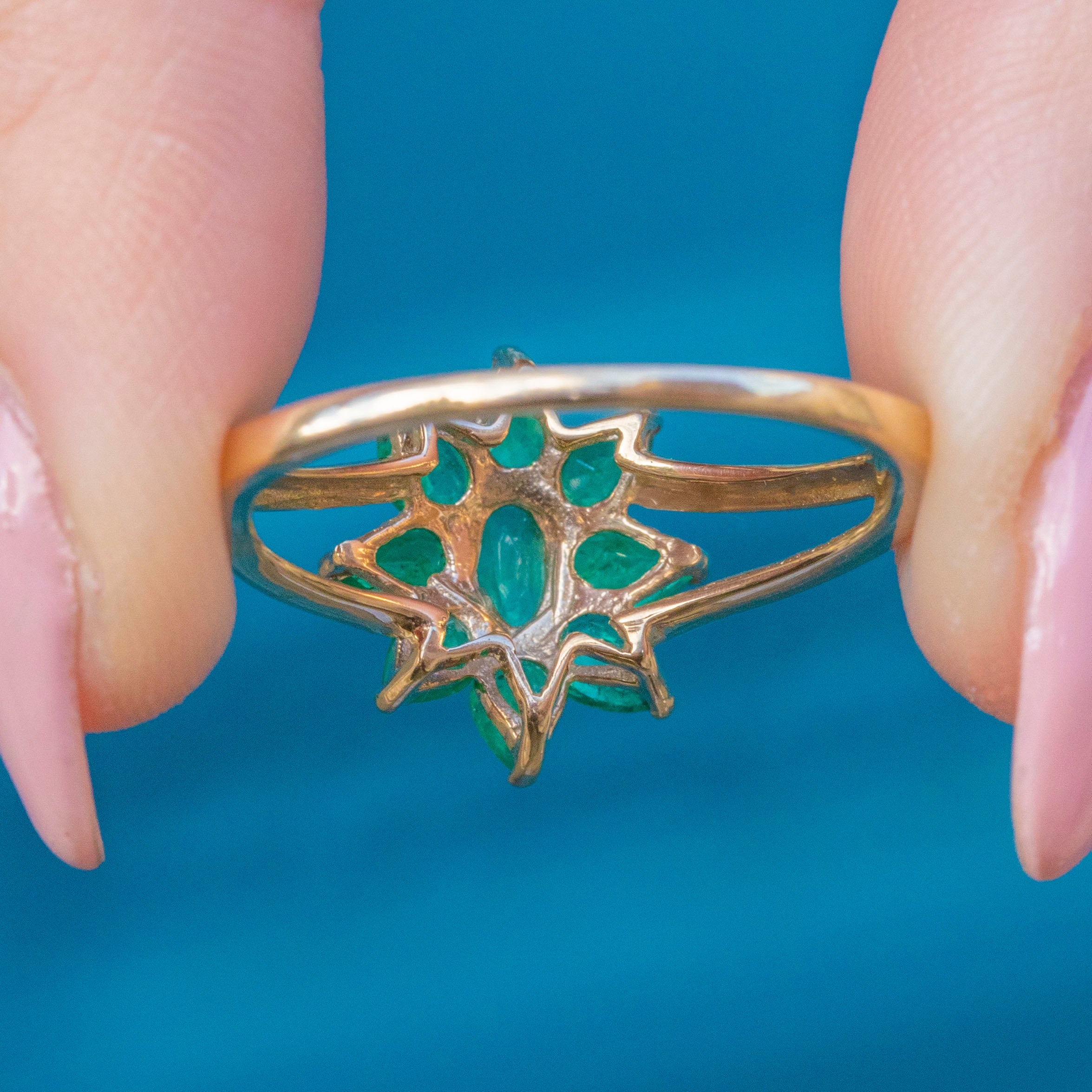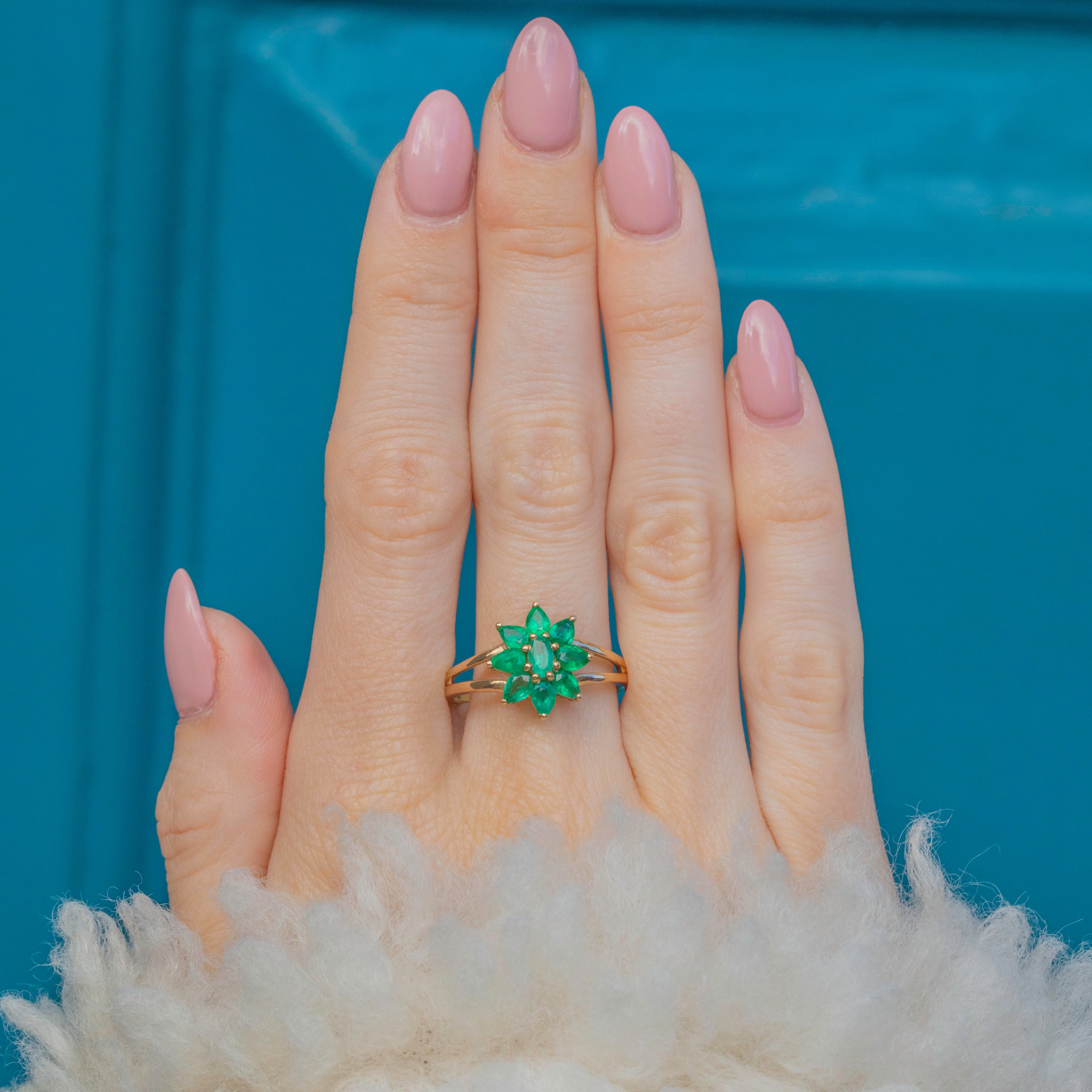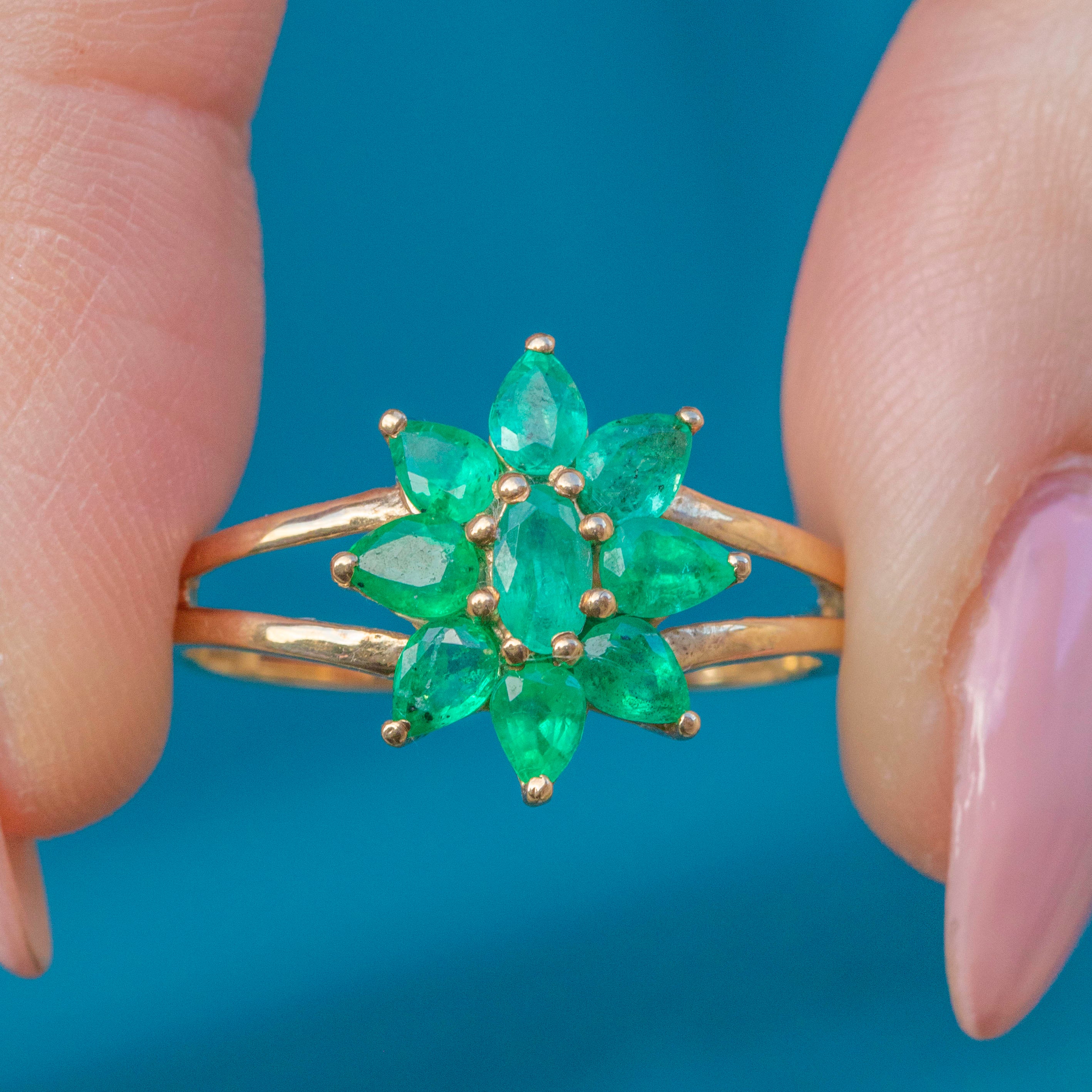 We are pleased to introduce this captivating 9ct Gold Emerald flower cluster ring! Her bold, impactful design features a vibrant cluster of lush green Emeralds, beautifully arranged in an enchanting floral pattern.