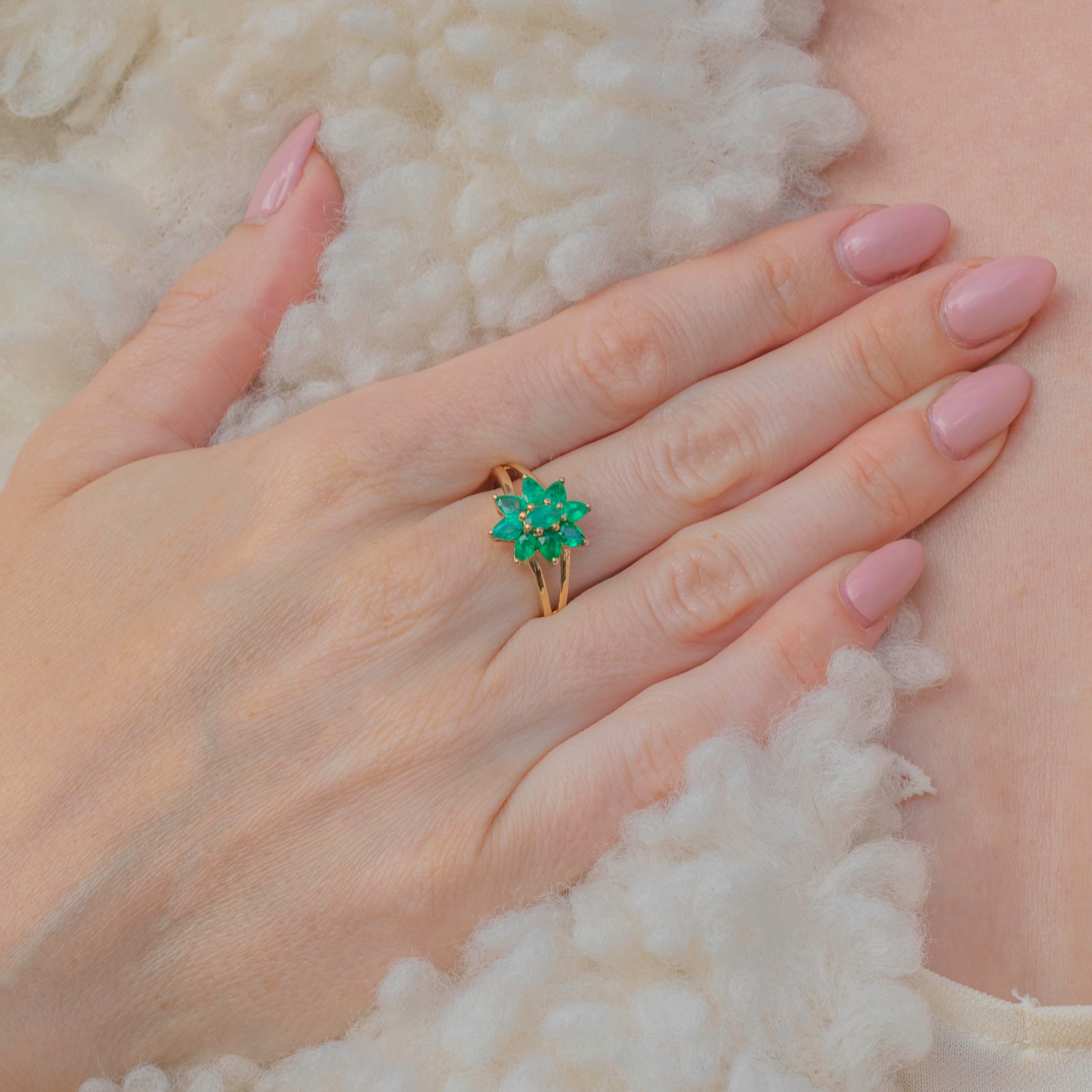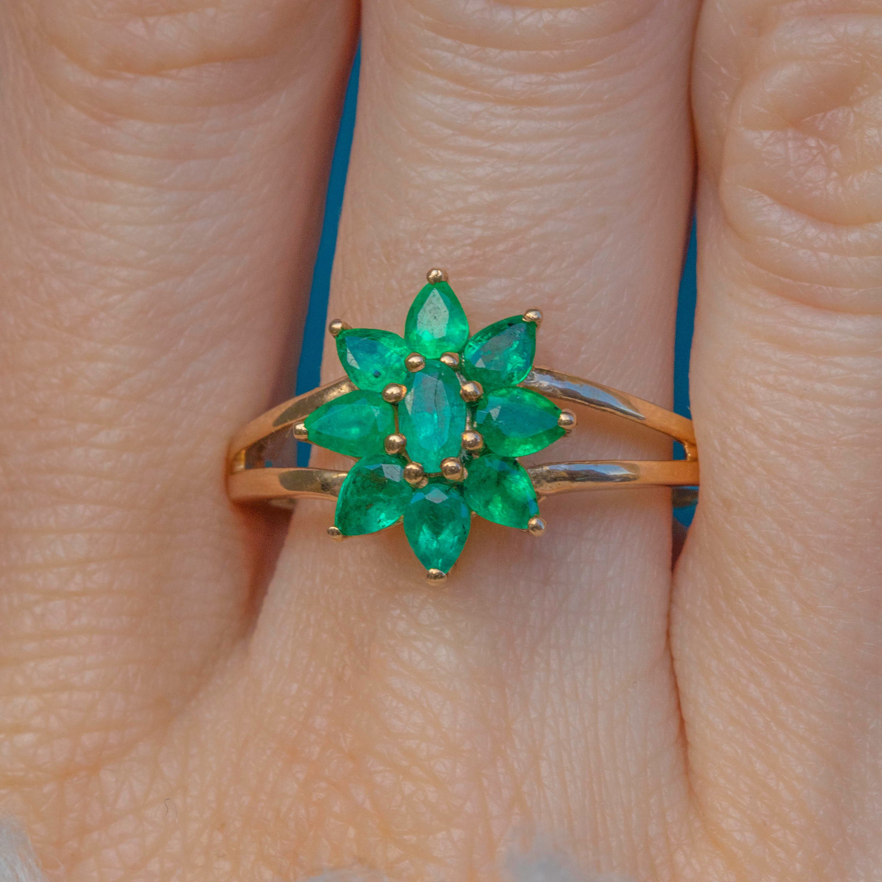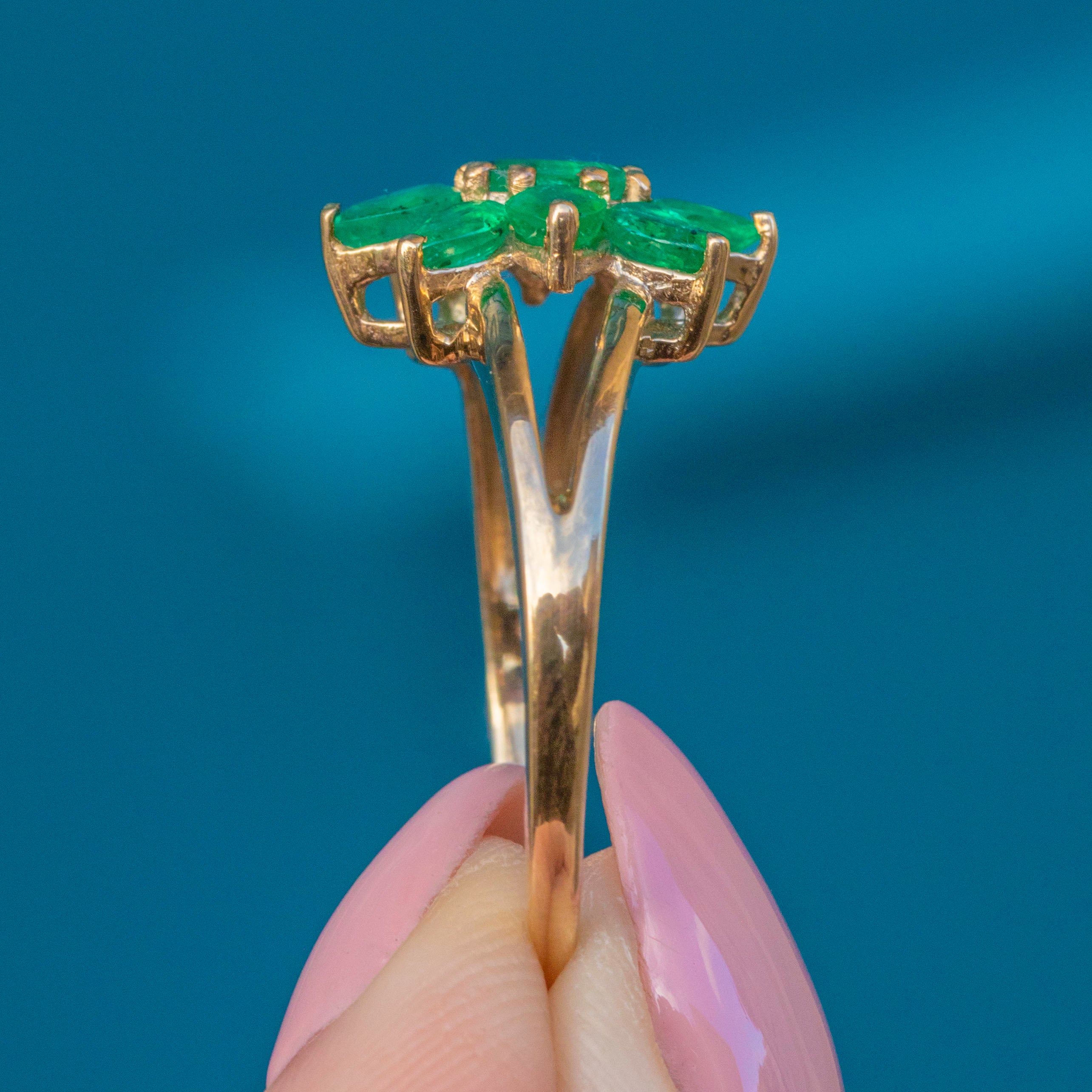 We are pleased to introduce this captivating 9ct Gold Emerald flower cluster ring! Her bold, impactful design features a vibrant cluster of lush green Emeralds, beautifully arranged in an enchanting floral pattern.