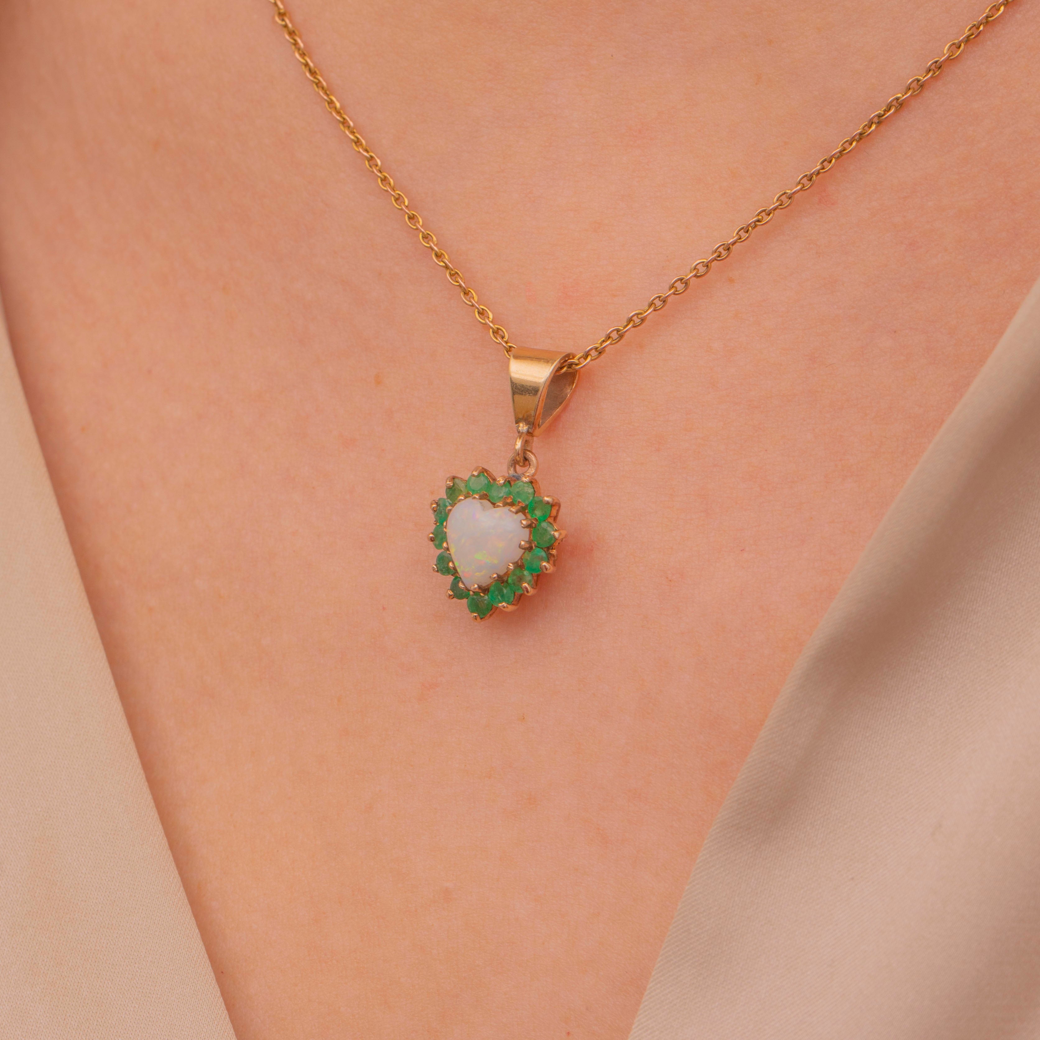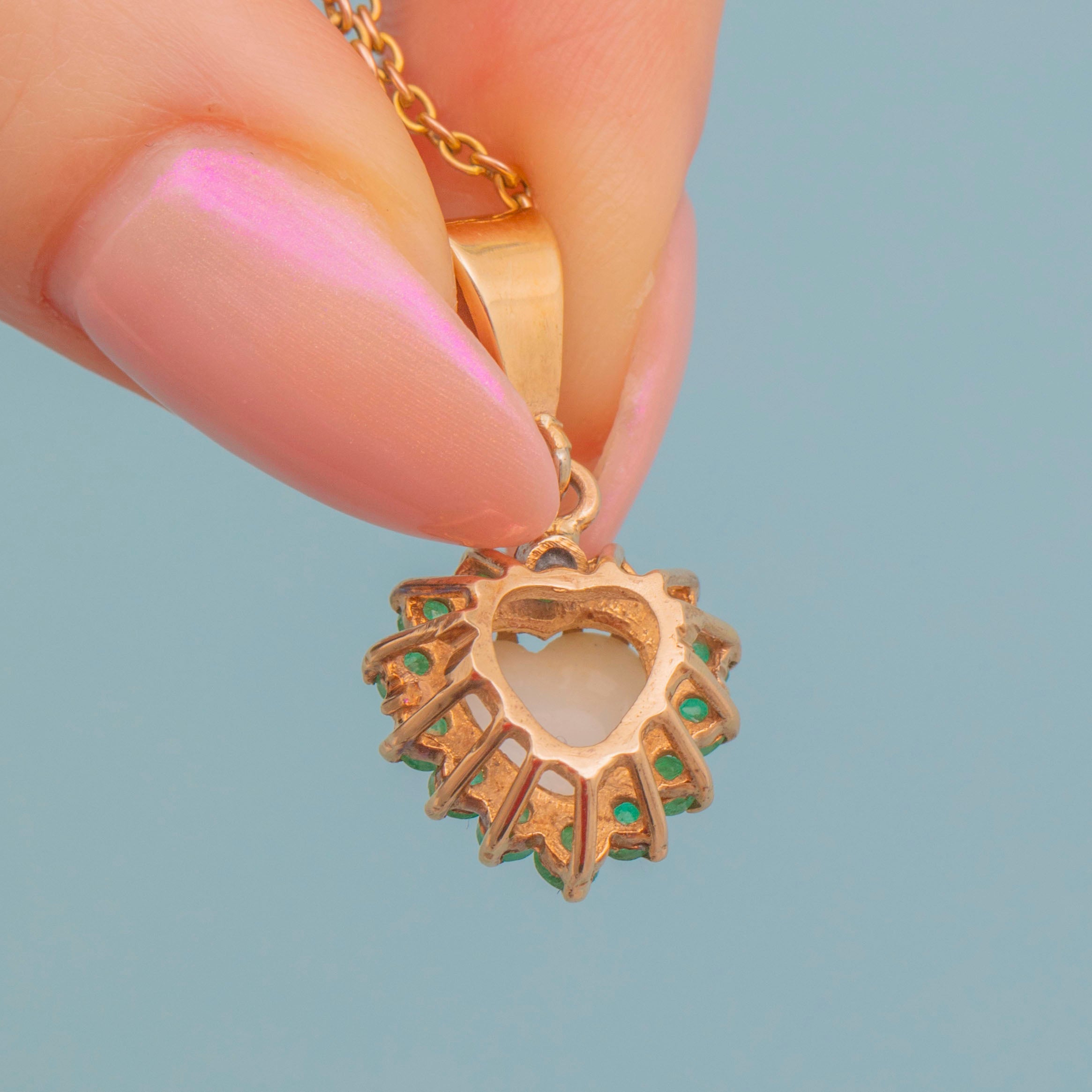 EXCELLENT This 9ct Gold Emerald Opal Heart Cluster charm is in excellent condition, with both the Opal and Emeralds retaining their vibrant, natural beauty. The 9ct Gold setting shows minimal surface wear, maintaining a polished and radiant finish. Her craftsmanship is impeccable, and the charm loop is secure and ready for wear.