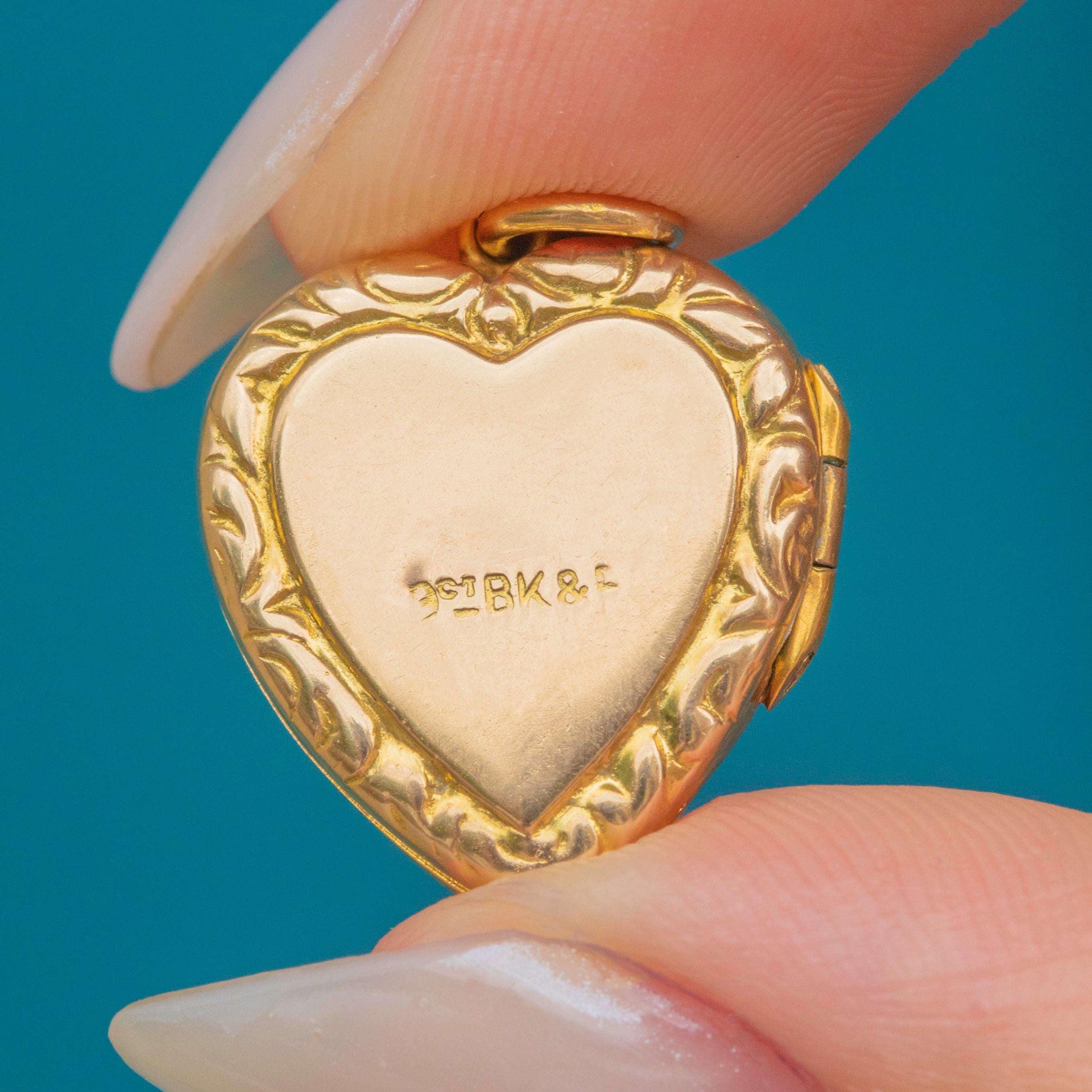 VERY GOOD. The locket's exterior is gorgeous, with pretty engravings and only slight wear to note on the back. Inside, there is some discolouration towards the rims of the locket, but your photos can be safely stored within the two frames that are present and the locket closes securely.