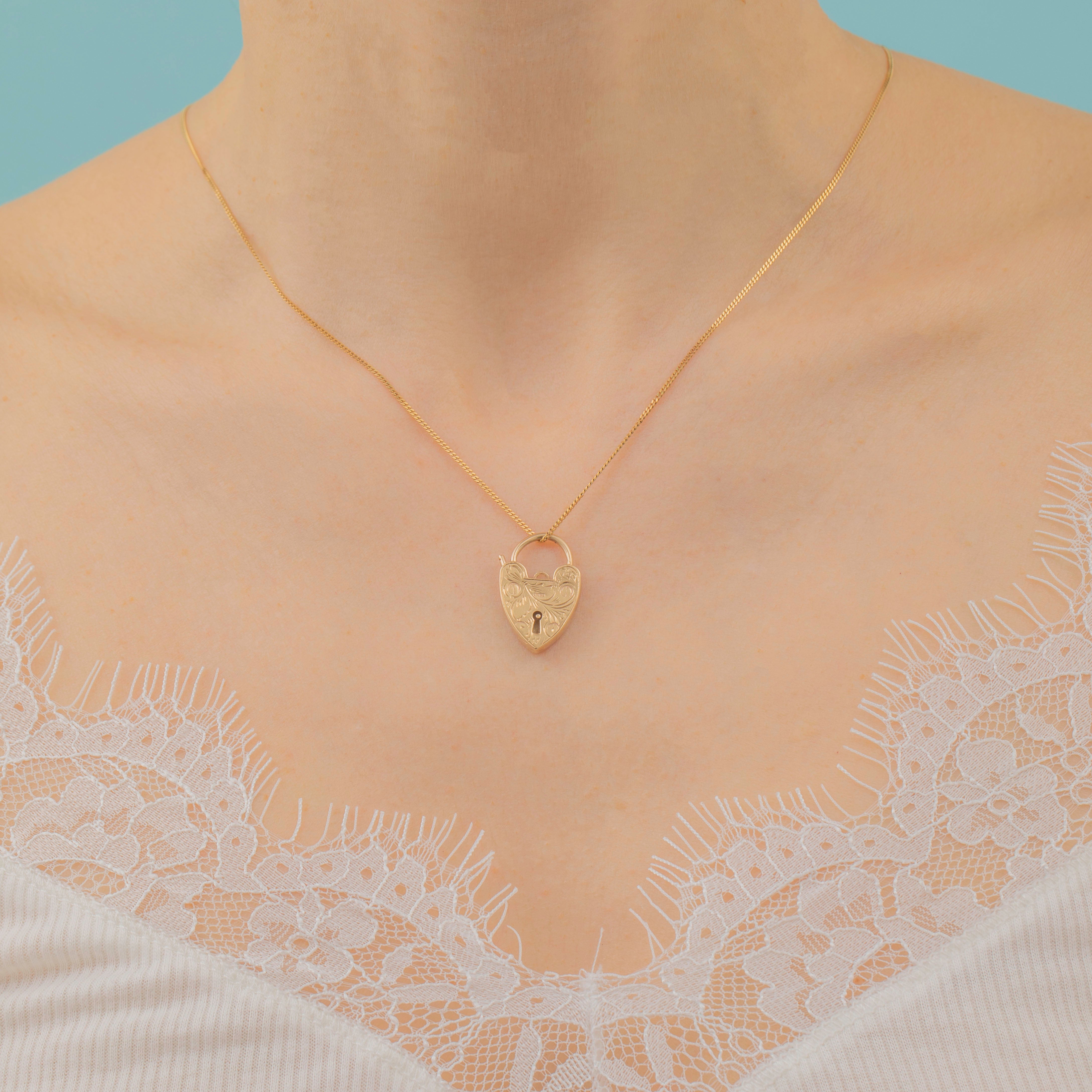 Steeped in romantic sentiment, heart padlocks were gifted as an indication of love and lifelong commitment. This Victorian pendant is adorned by ornate swirled engravings, giving her a quintessentially romantic allure.