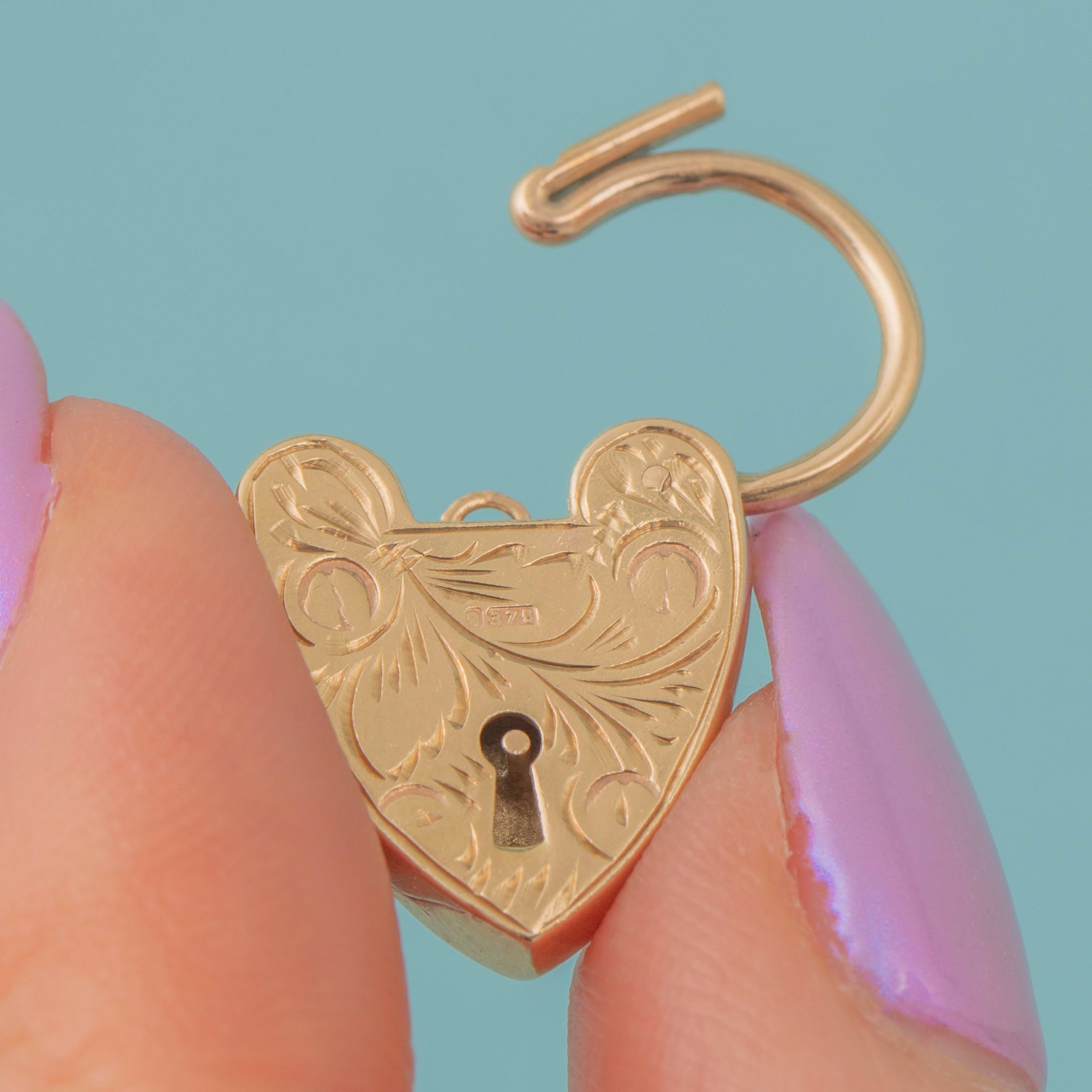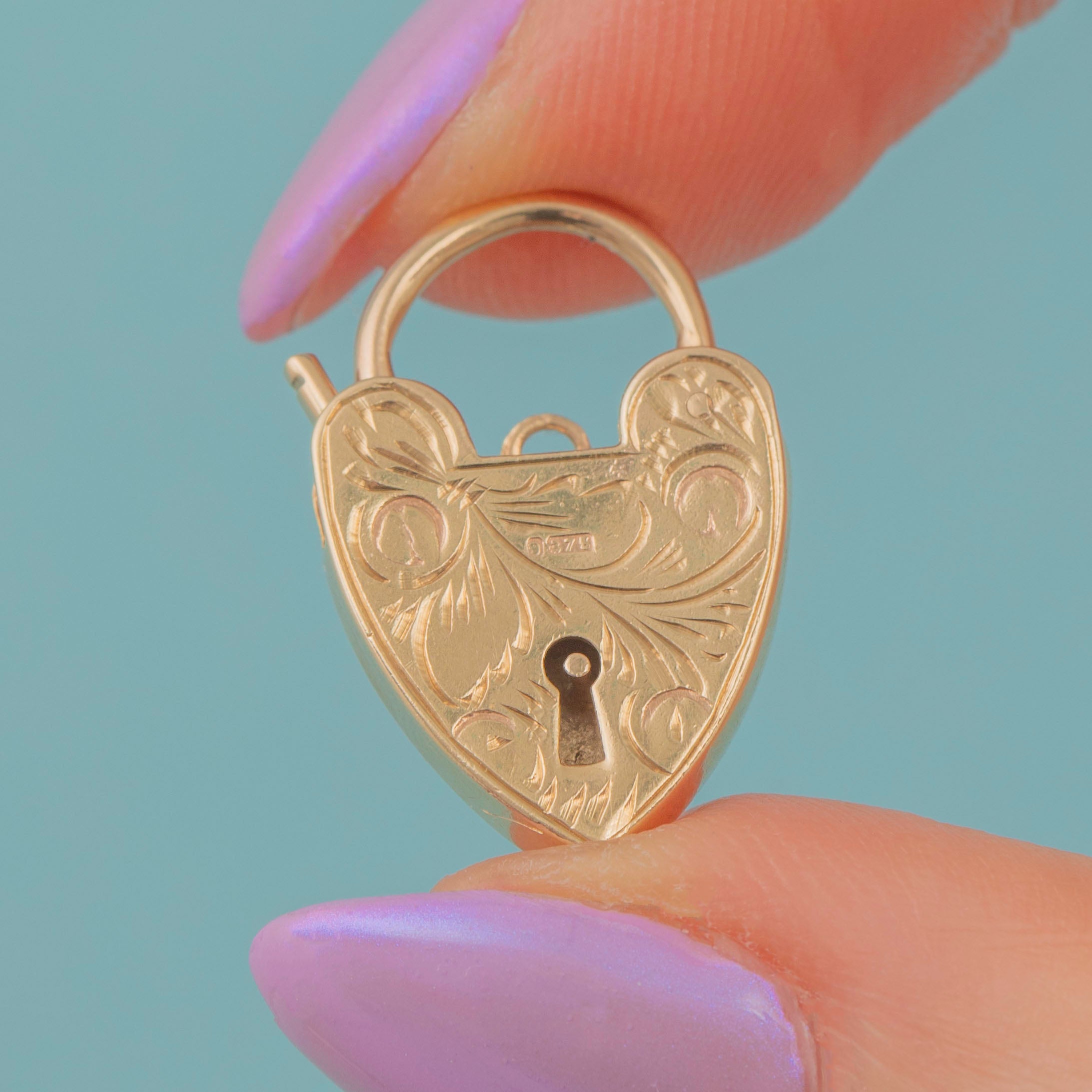 VERY GOOD-EXCELLENT. This Victorian 9ct Gold engraved heart padlock pendant is in wonderful condition. Her Gold is lustrous and her engravings are crisp, with only slight wear on the back where the hallmarks have lost their definition. The lever requires a firm push to open but is fully functioning, meaning you can wear her with the utmost confidence!