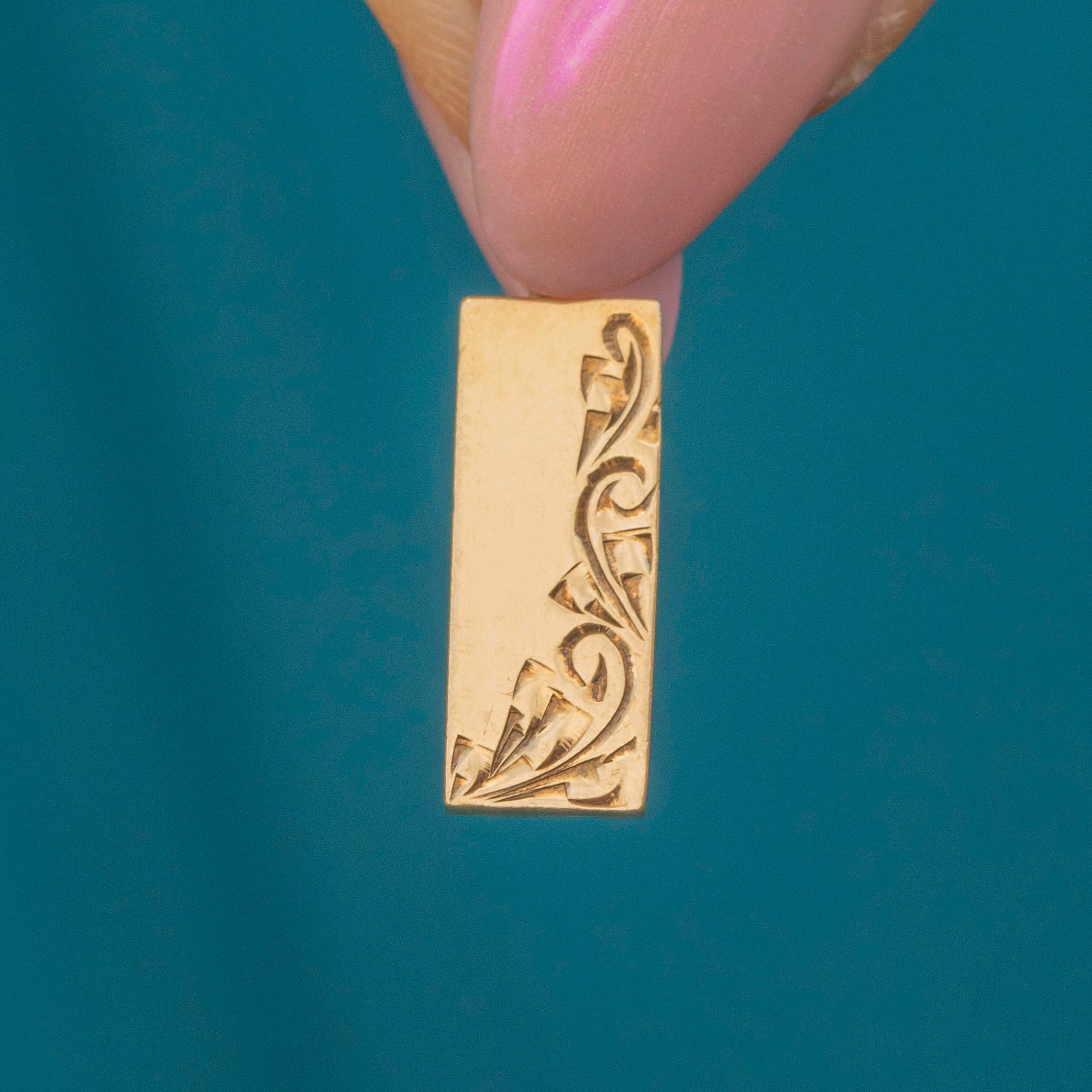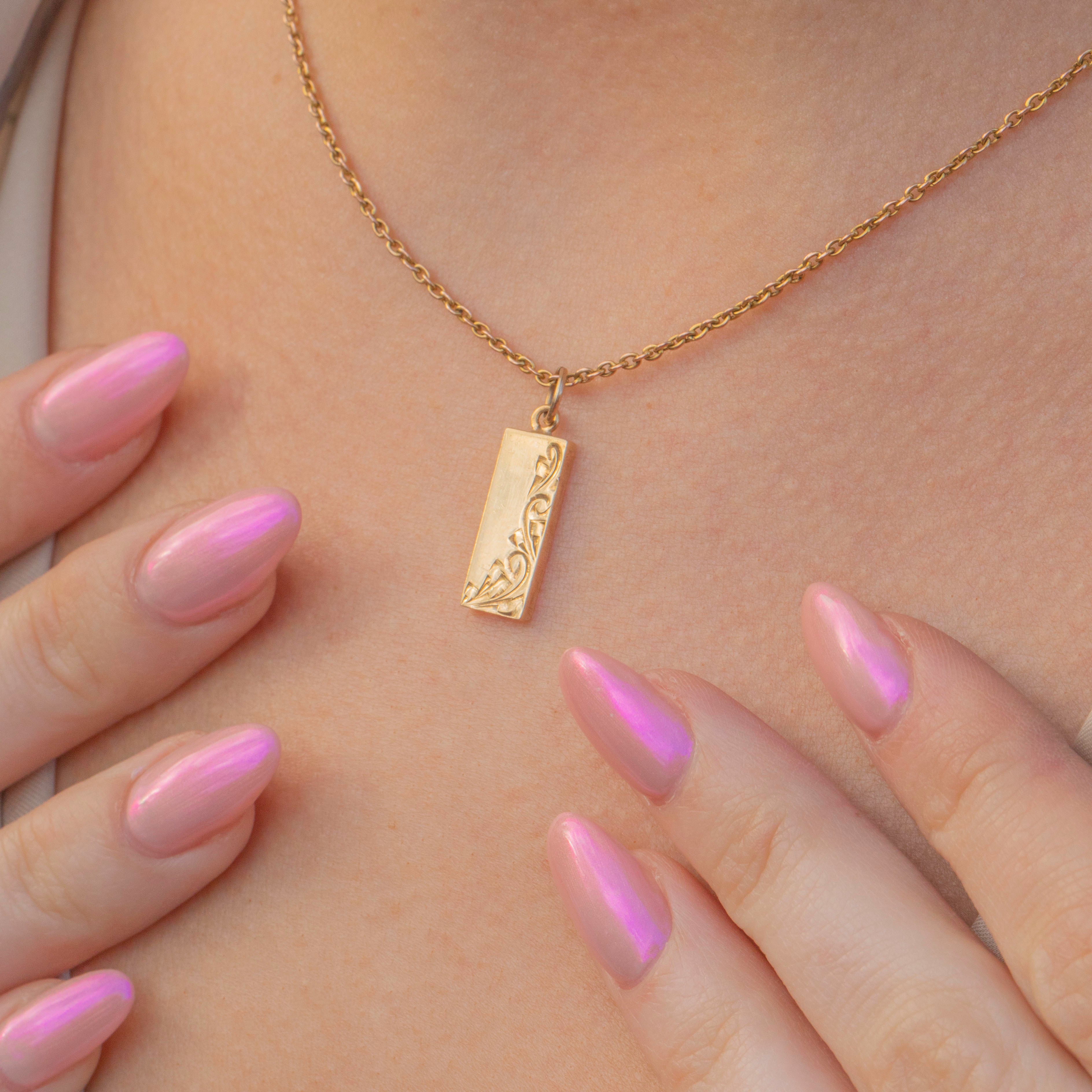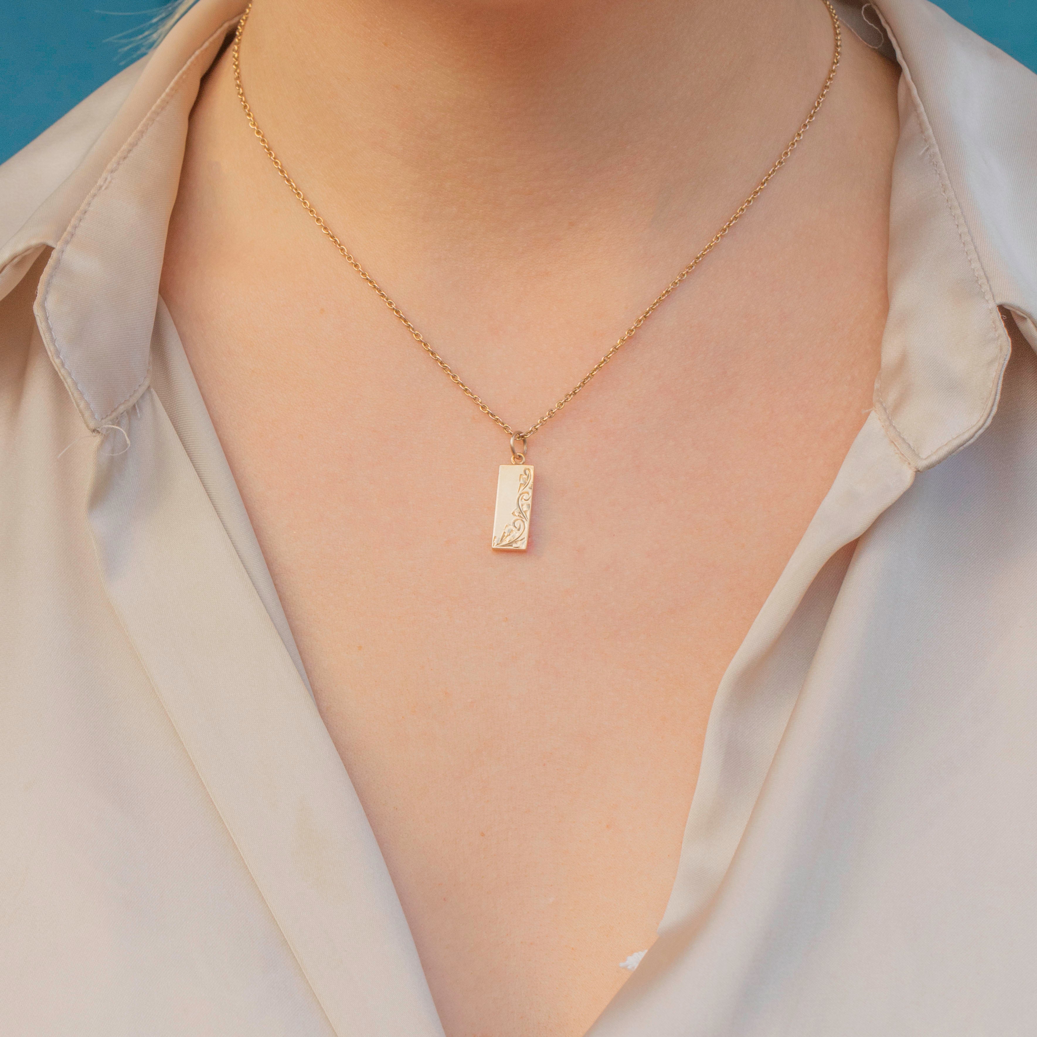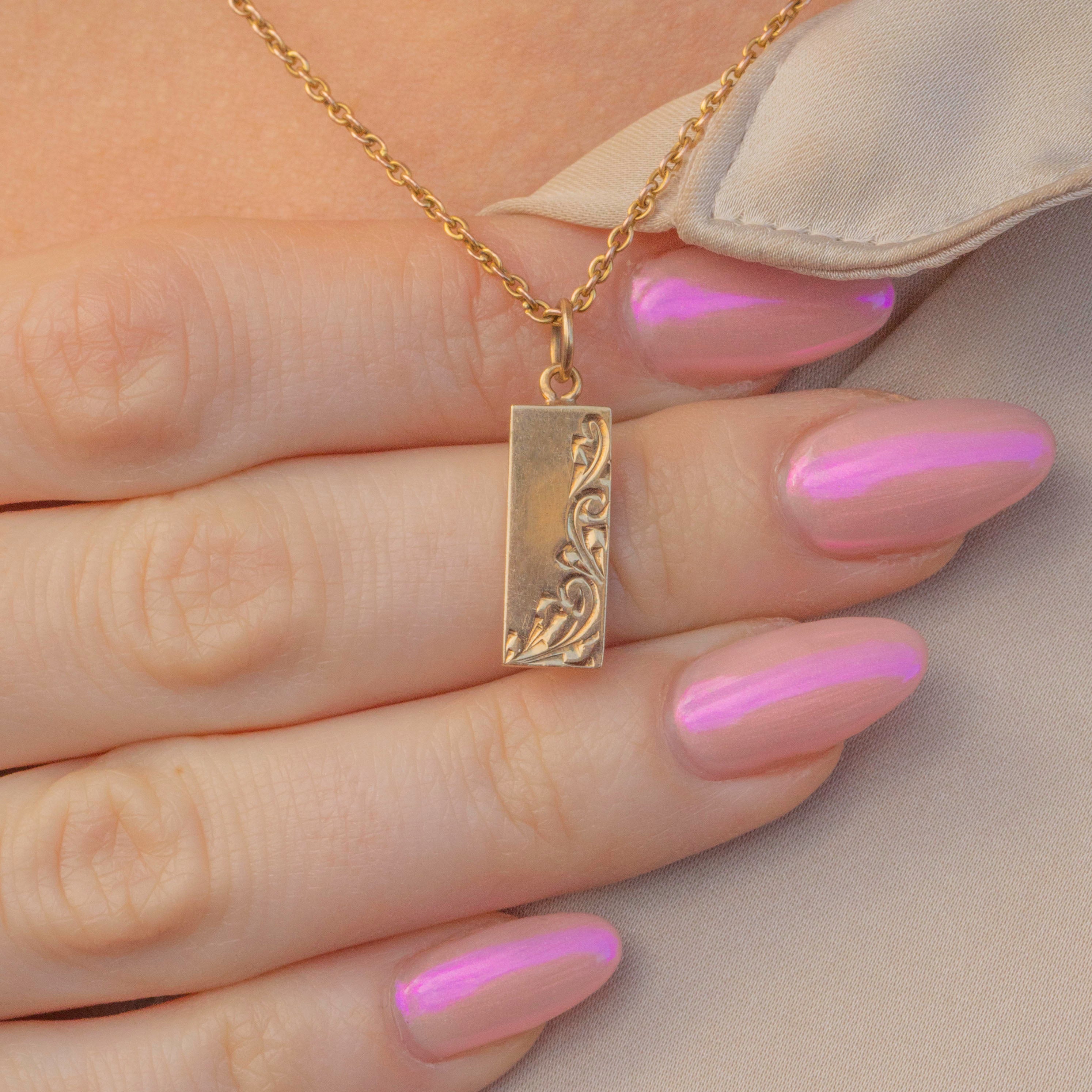 This 9ct Gold engraved ingot pendant is the perfect piece to add a touch of vintage luxury to your outfit! The solid slab of Gold has a lovely sumptuous buttery hue with sweeping engravings across the front and chunky English hallmarks on the back, dating her to 1987.