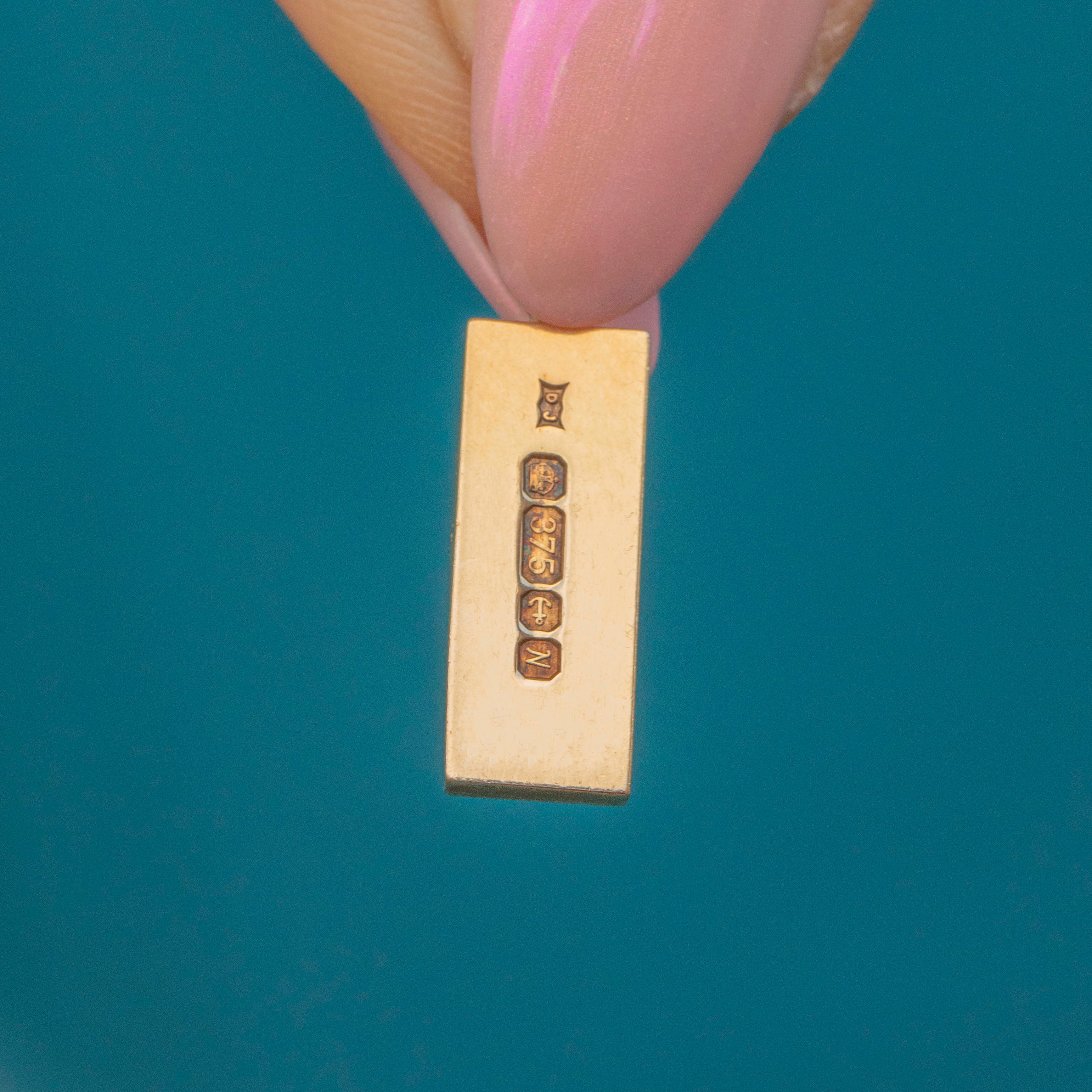 EXCELLENT. This 9ct Gold engraved ingot pendant is in excellent condition. The Gold has an even saturation throughout with wonderful reflective qualities. The engraved details have remained defined and the hallmarks are crisp, allowing us to accurately date her to 1987!