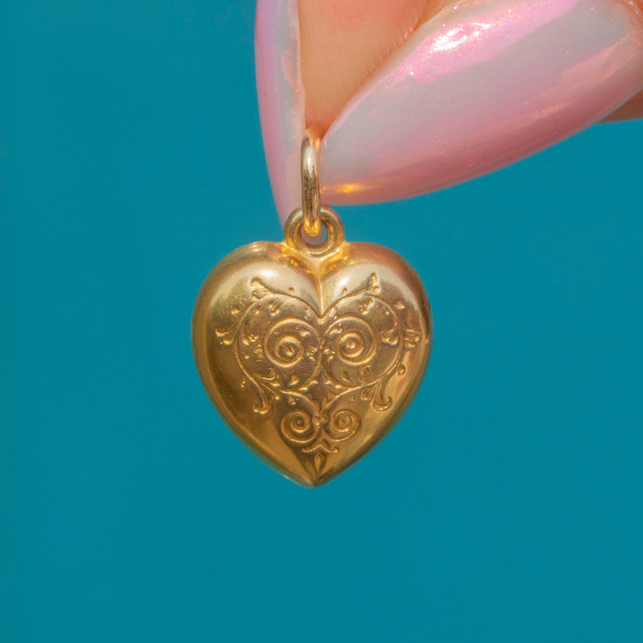 EXCELLENT: This 9ct Gold engraved puffy heart charm is in excellent condition. The Gold is buttery and her engraved details are defined with no signs of surface wear. With so much wear potential, this vintage Gold heart pendant can be worn and enjoyed every day!