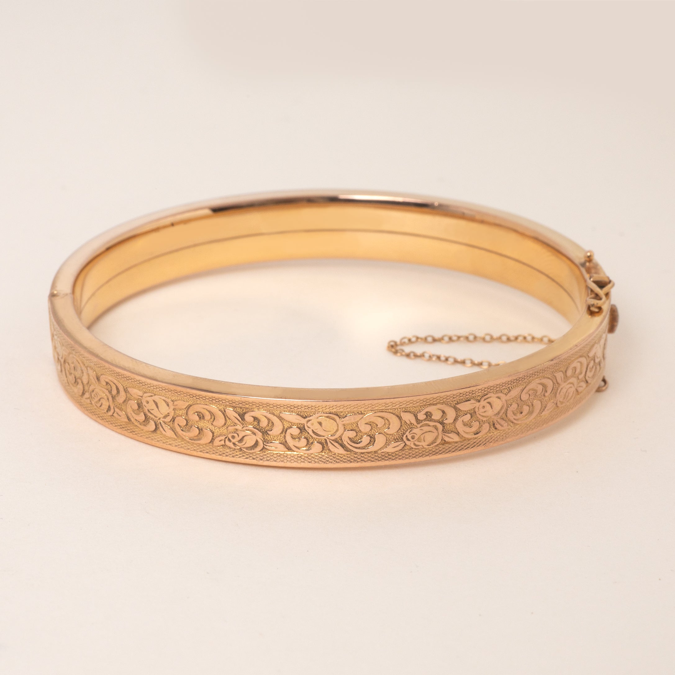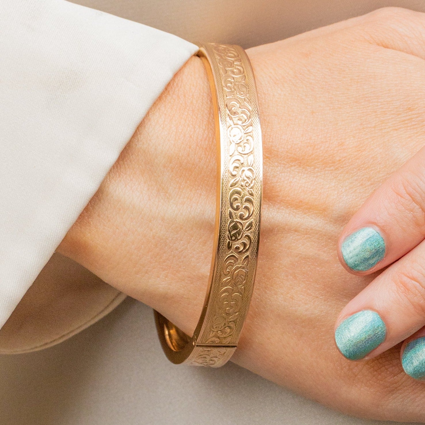 How divine is this 9ct Gold engraved rolled Gold bangle! Every inch of her circumference is adorned with delicate rose details, bordered by a cross hatch finish, with the light bouncing off of her champagne hued finish.