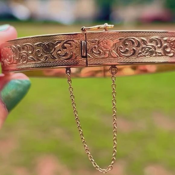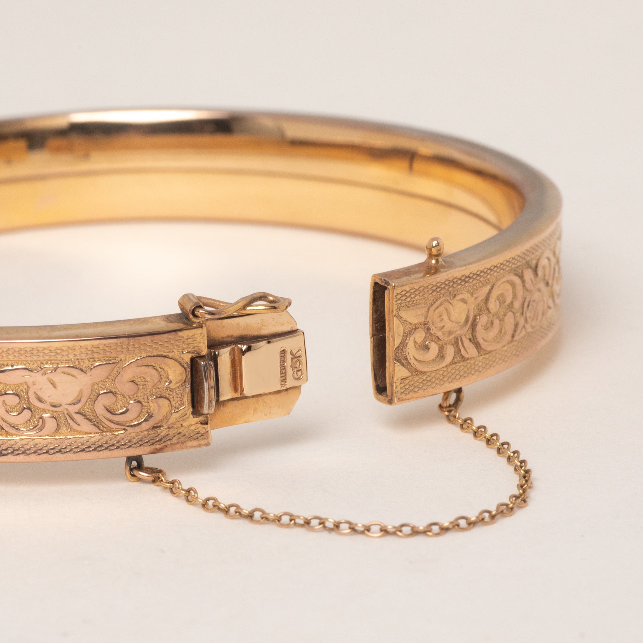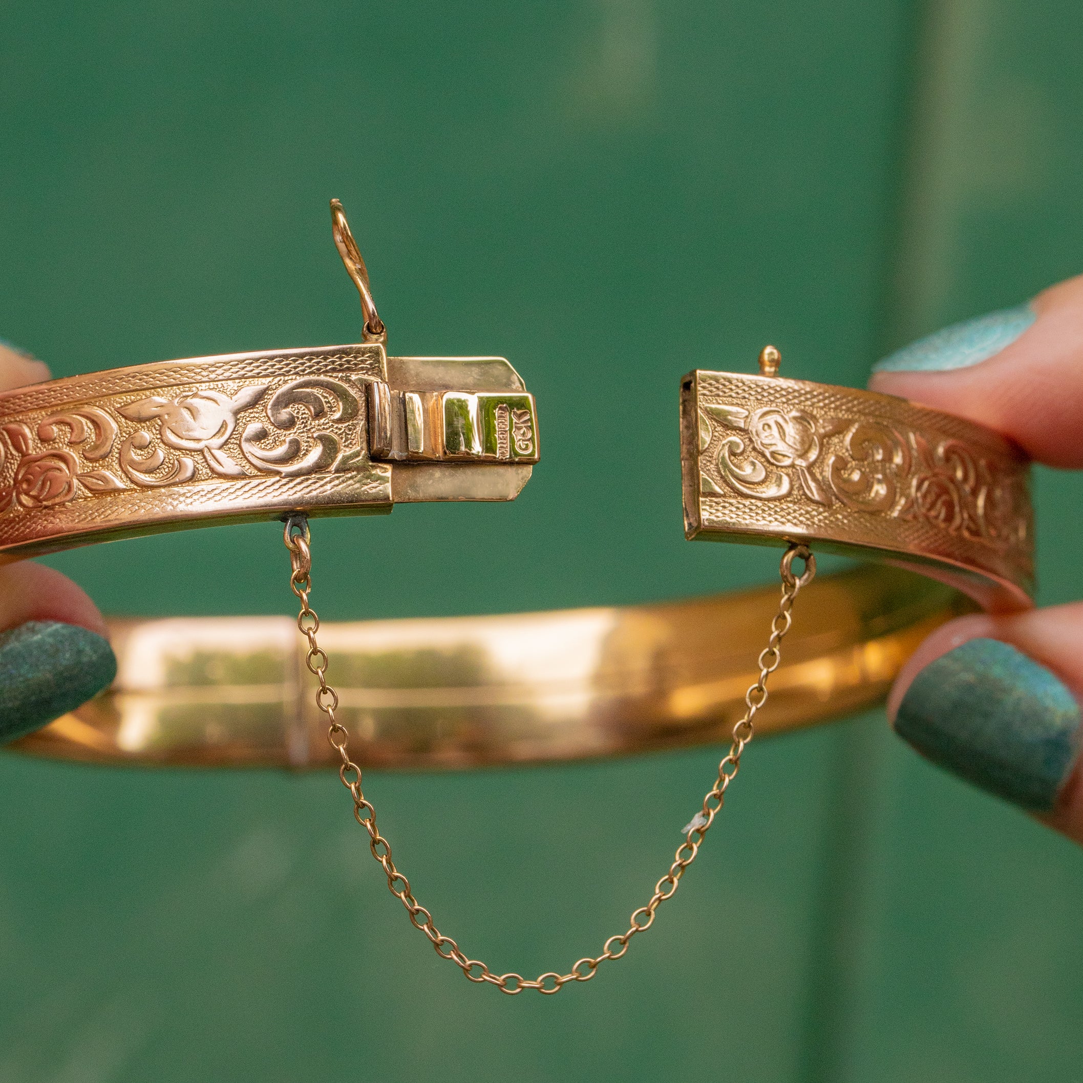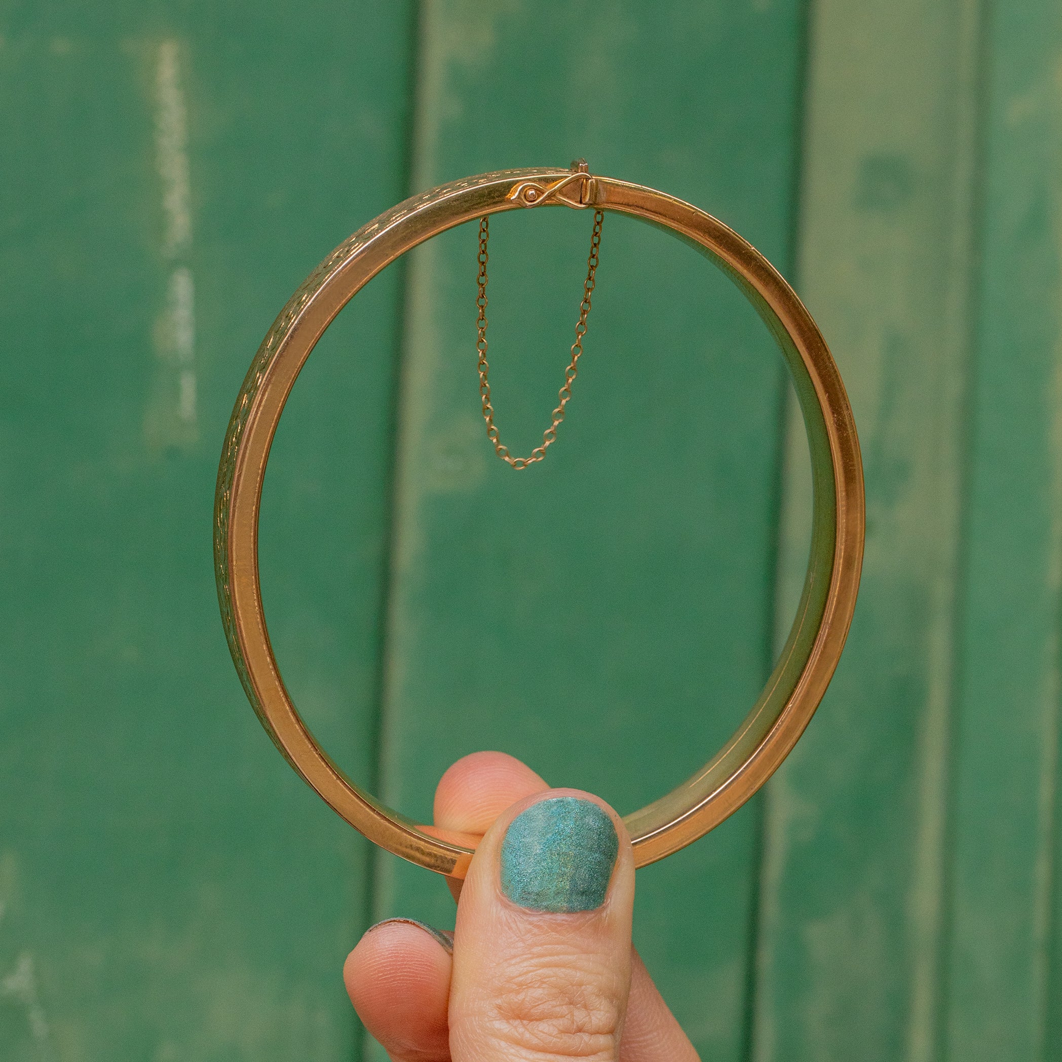 VERY GOOD. This 9ct Gold engraved rolled Gold bangle is in very good condition! The engravings are crisp throughout and bring a lovely texture to the Vintage bangle. The sun-kissed Gold tone is harmonious throughout, thriving beneath the light. Although there are a few dings to the inside of the bangle, externally there is nothing to note. With a secure clasp and added safety chain, you can wear this engraved bangle with confidence!