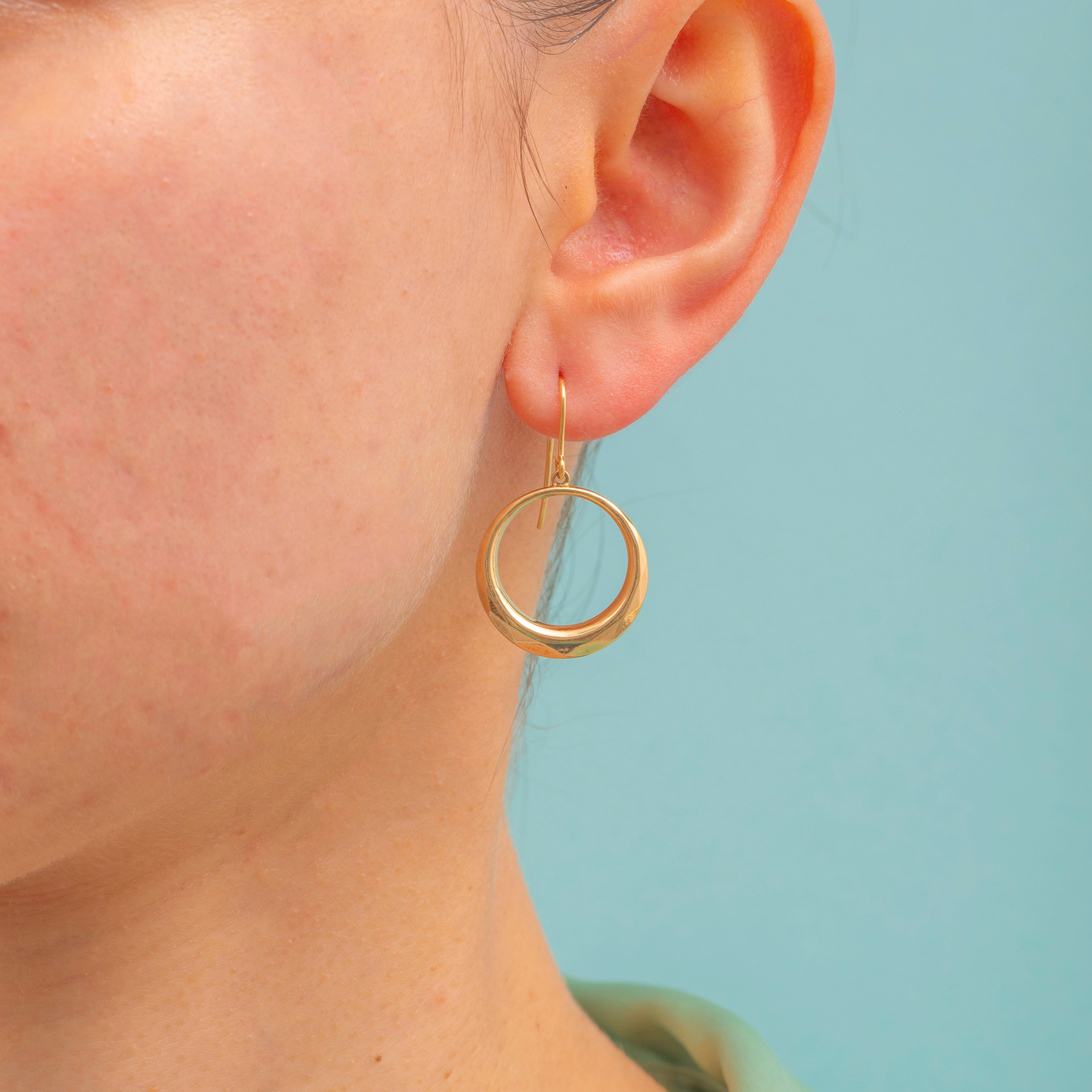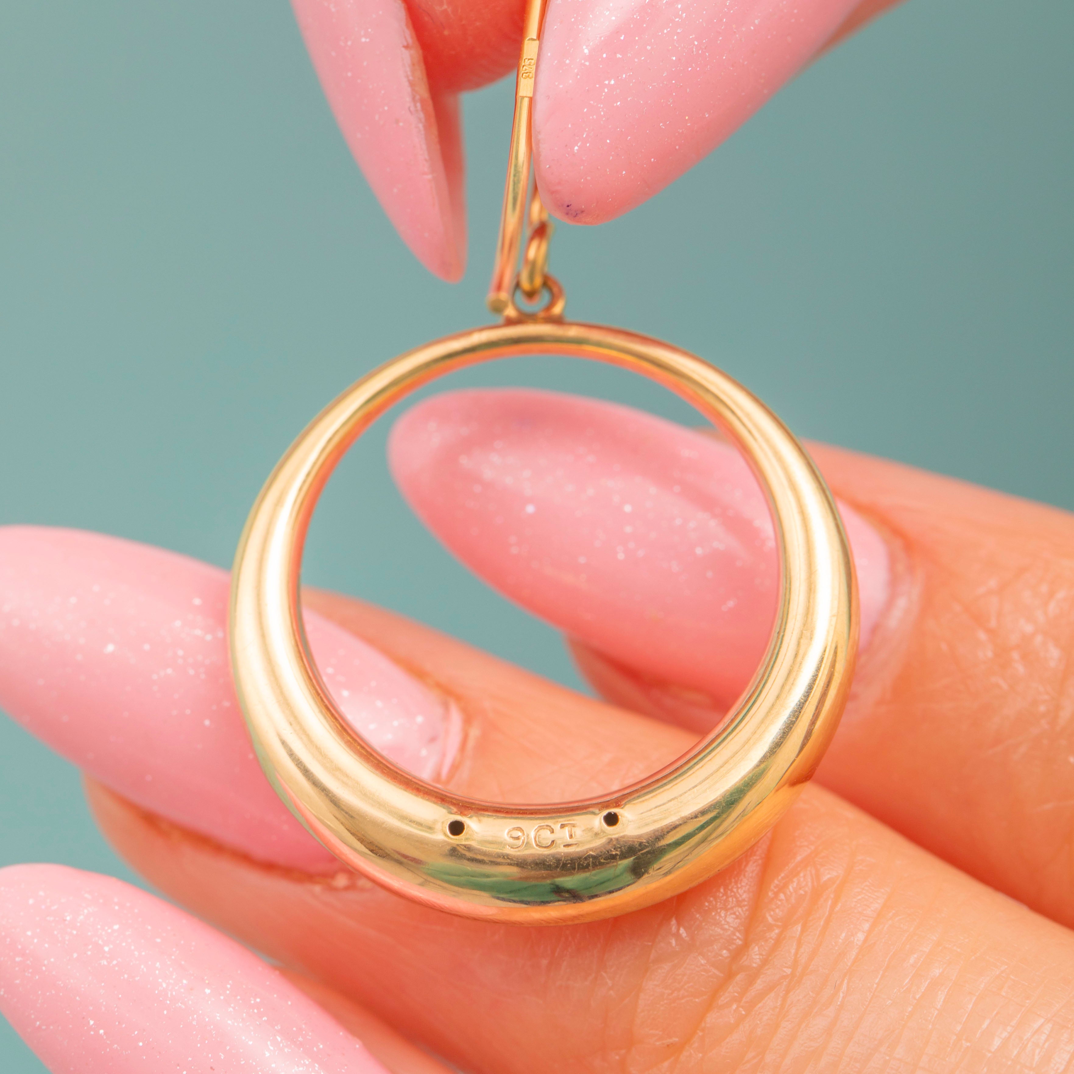 Crafted from glossy 9ct Gold, each drop earring suspends a plump Gold hoop, giving these earrings lovely movement. The hoops are subtly faceted, providing texture and depth, glinting wonderfully as they catch the light.