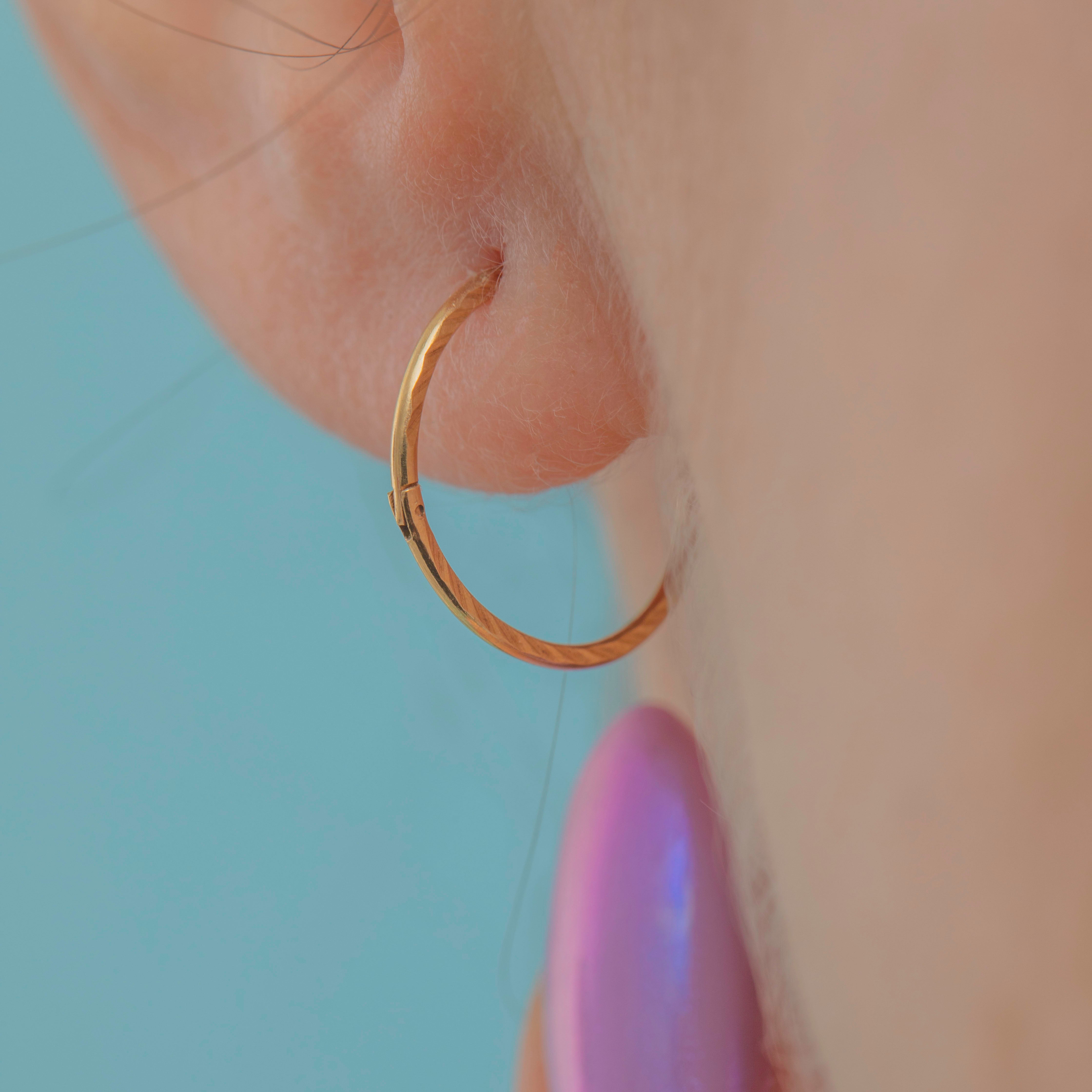 EXCELLENT. These 9ct Gold faceted sleeper hoop earrings are in excellent condition. The earrings are smooth on one side and faceted on another, with no signs of surface wear. Slotting comfortably into place and closing securely, you can enjoy wearing these vintage sleeper hoops all day and all night long!
