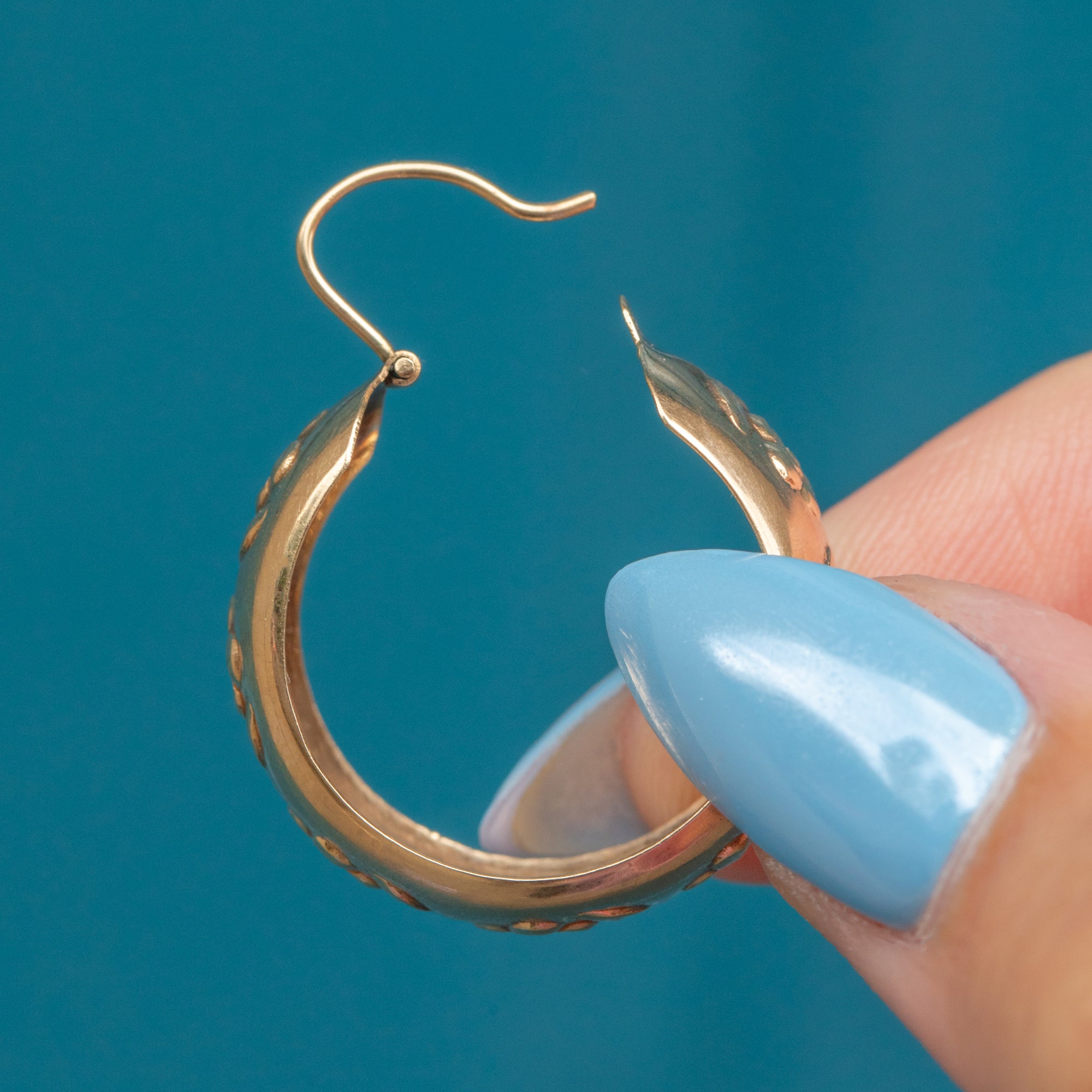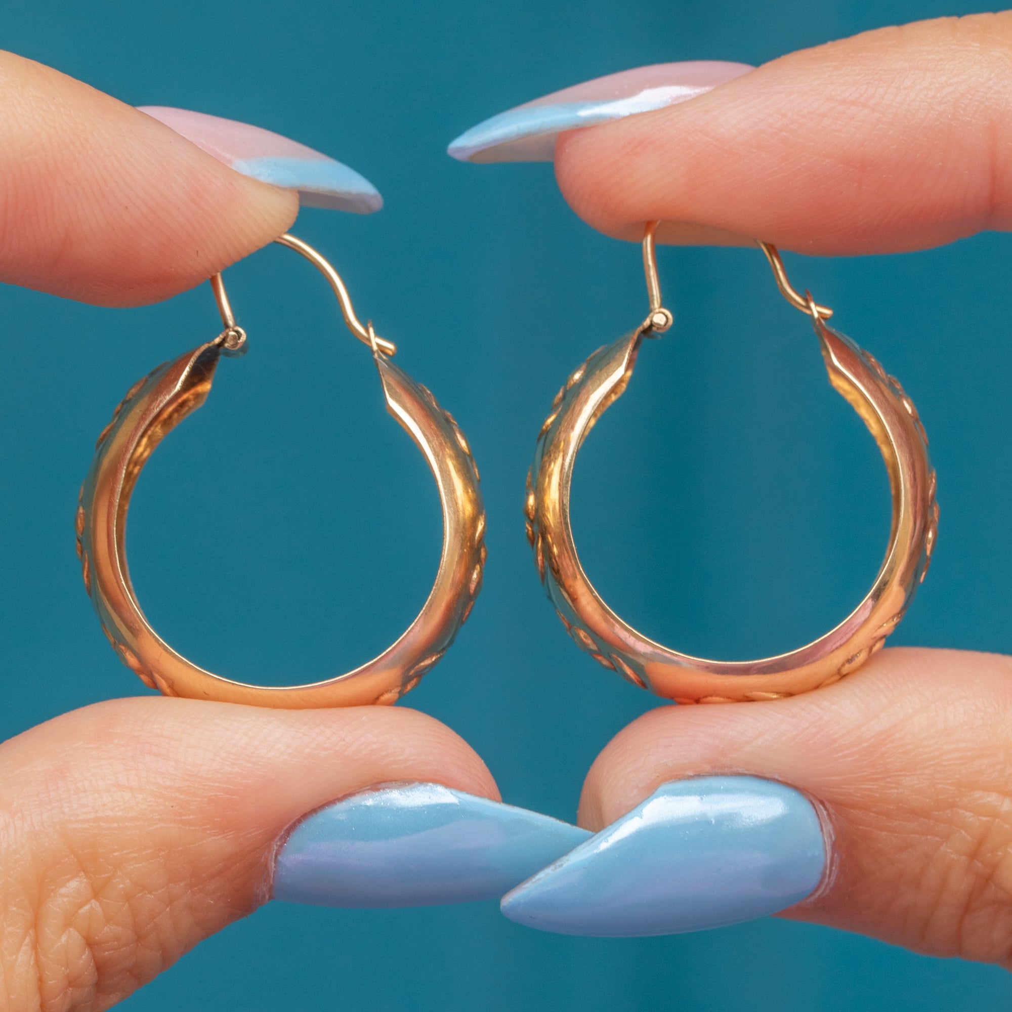 The sweetest pair of vintage Gold hoop earrings! These chubby Gold hoops have repoussé forget-me-not detailing running through their centre, giving them a unique edge that makes them stand out from the rest.