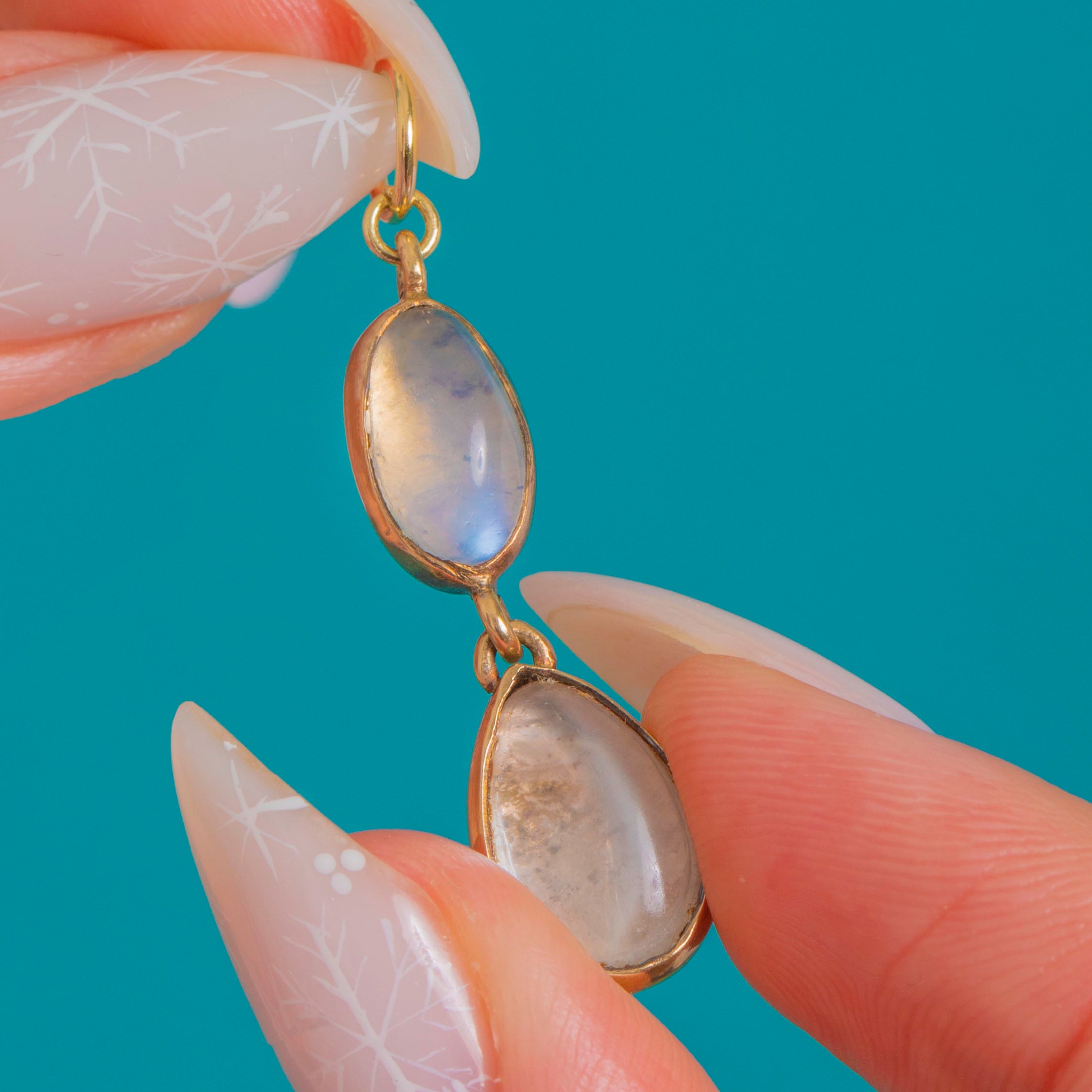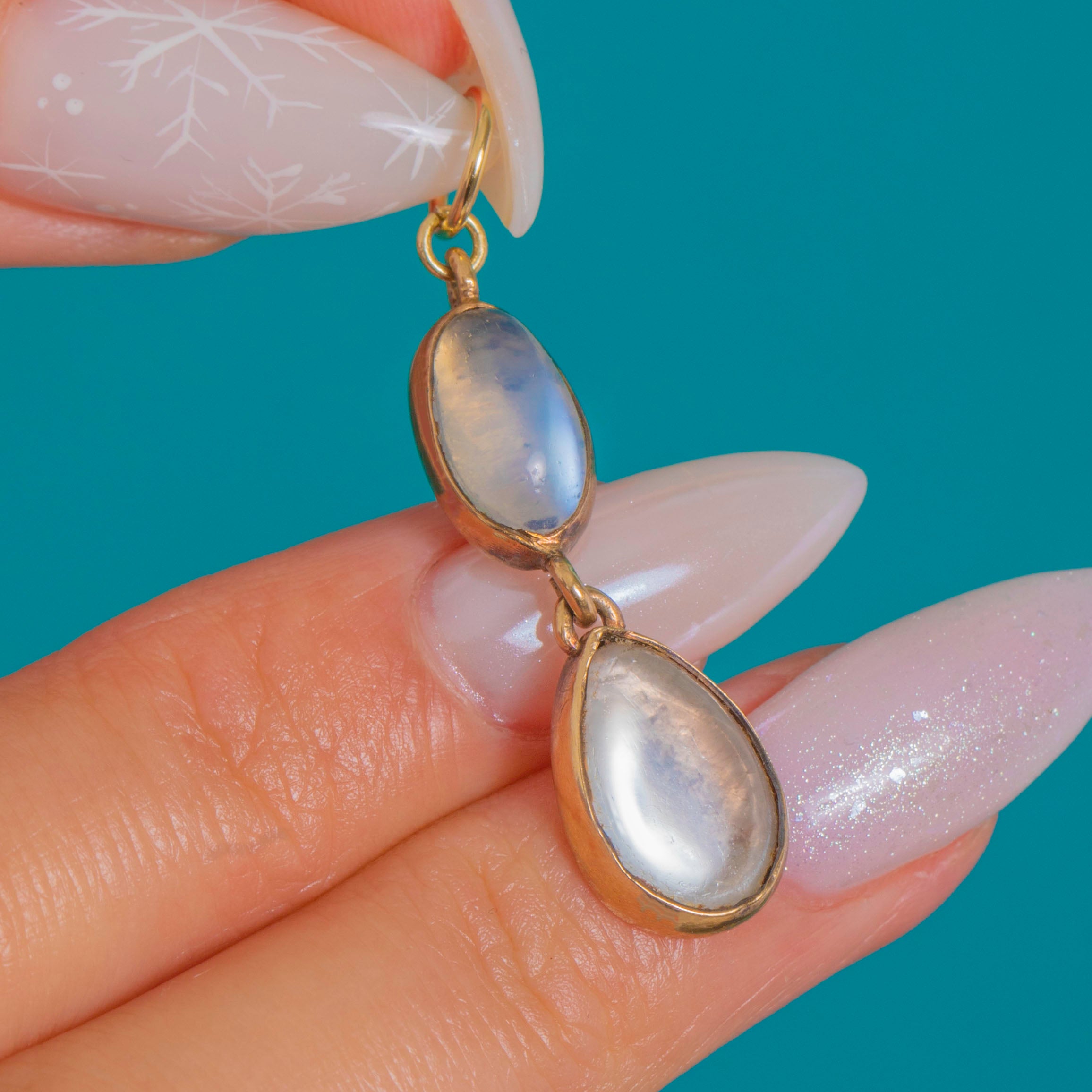 This elegant Victorian Moonstone pendant is crafted in warm 9ct Gold and features a beautifully balanced double drop design. The upper oval cabochon suspends a gently articulated pear-shaped Moonstone, allowing the pendant to move fluidly with the wearer.