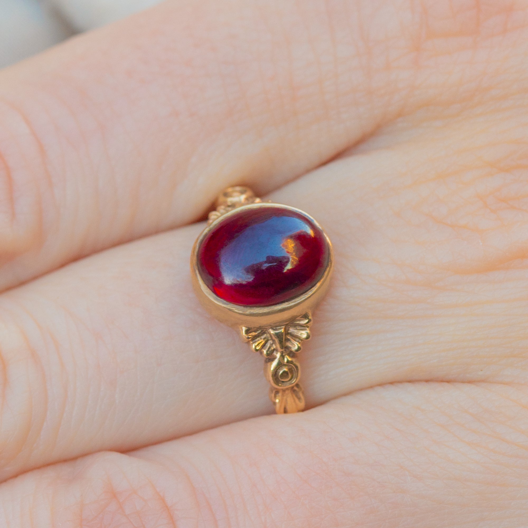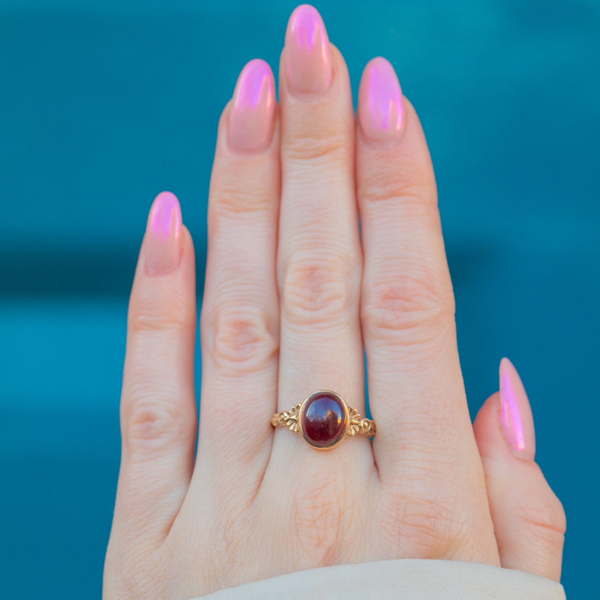 9ct Gold Garnet Cabochon Ring, Ornate Shoulders