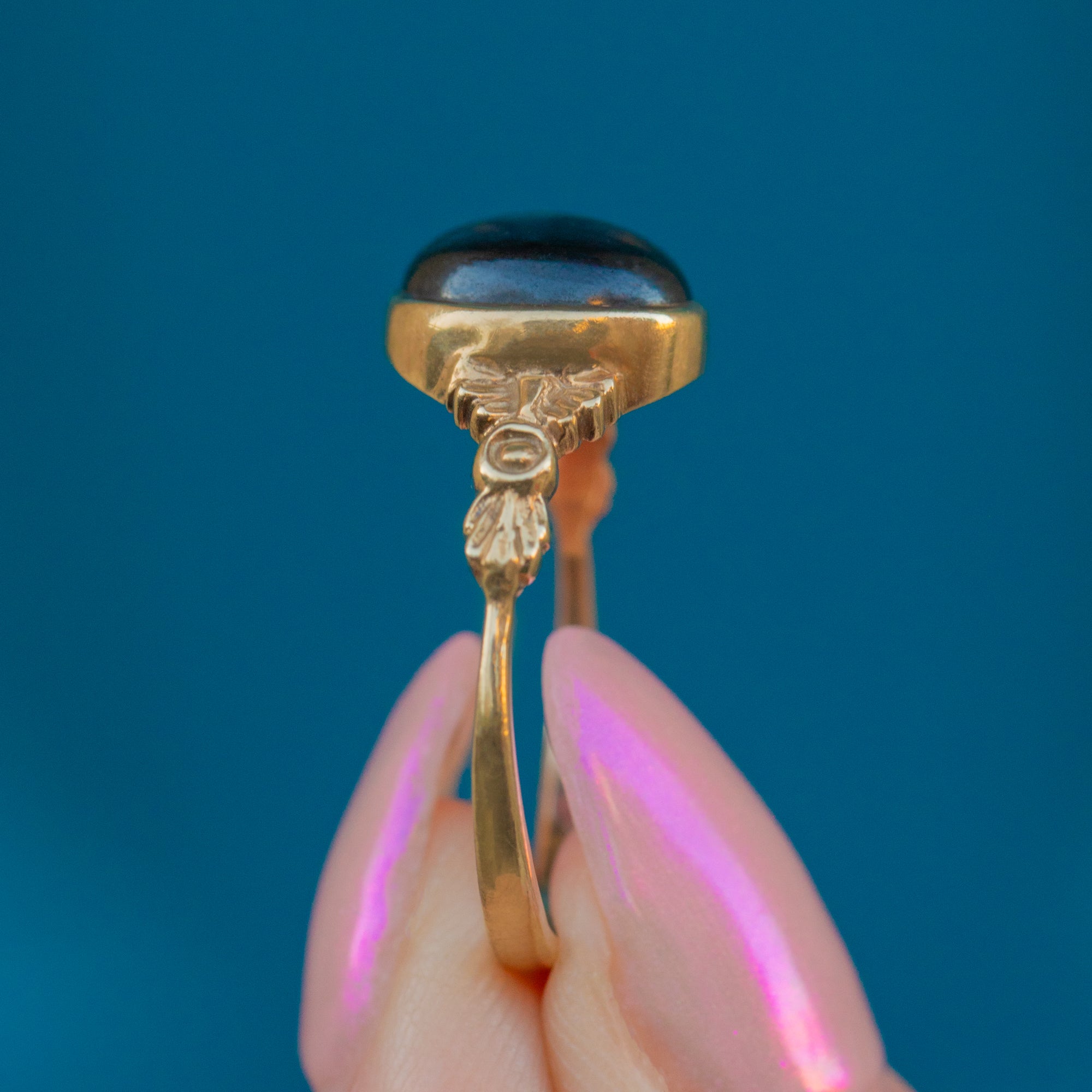 Just in time for the gifting season comes this 9ct Gold Garnet cabochon ring! With ornate shoulders, a juicy red cabochon cut Garnet sits snugly at the centre emanating rich berry red hues.