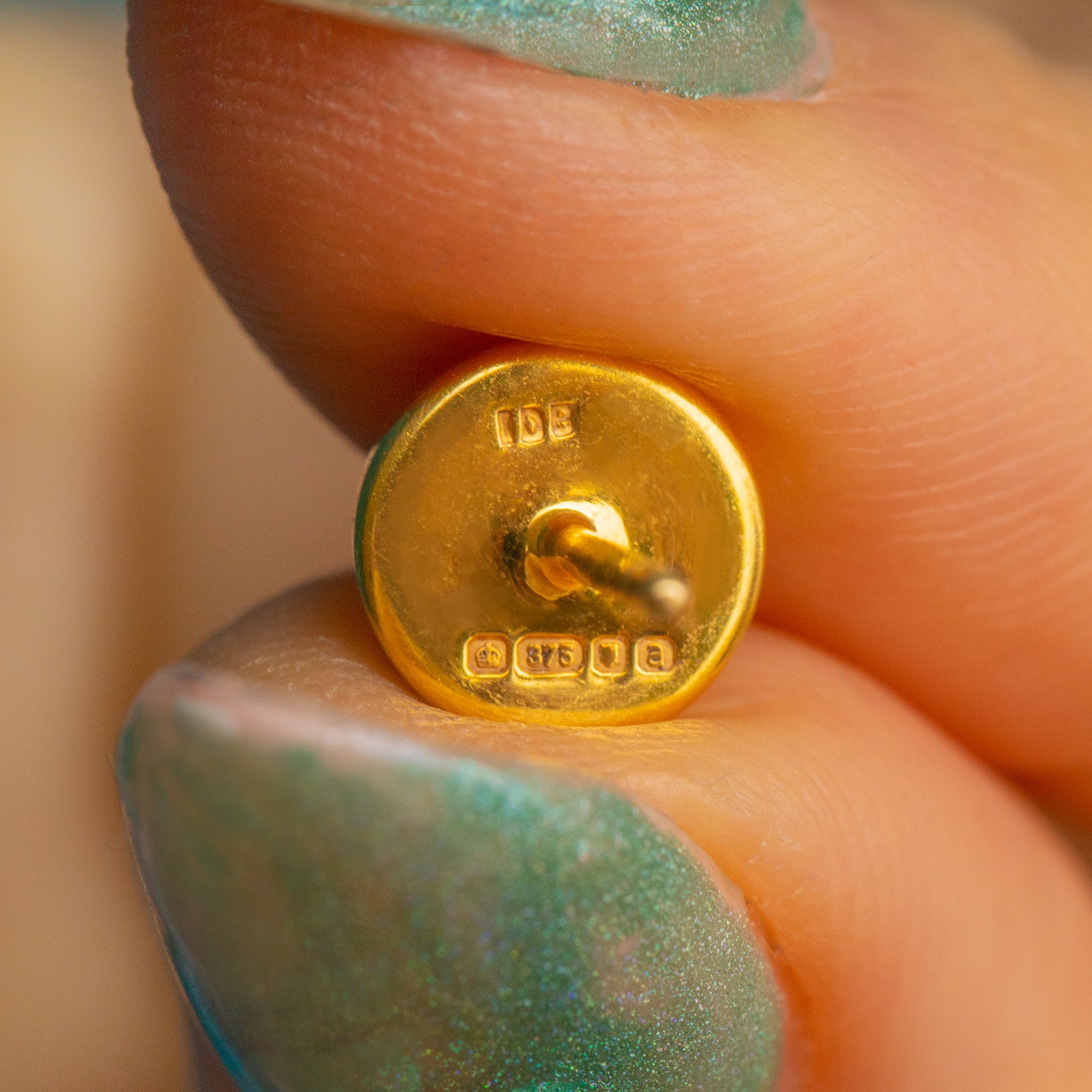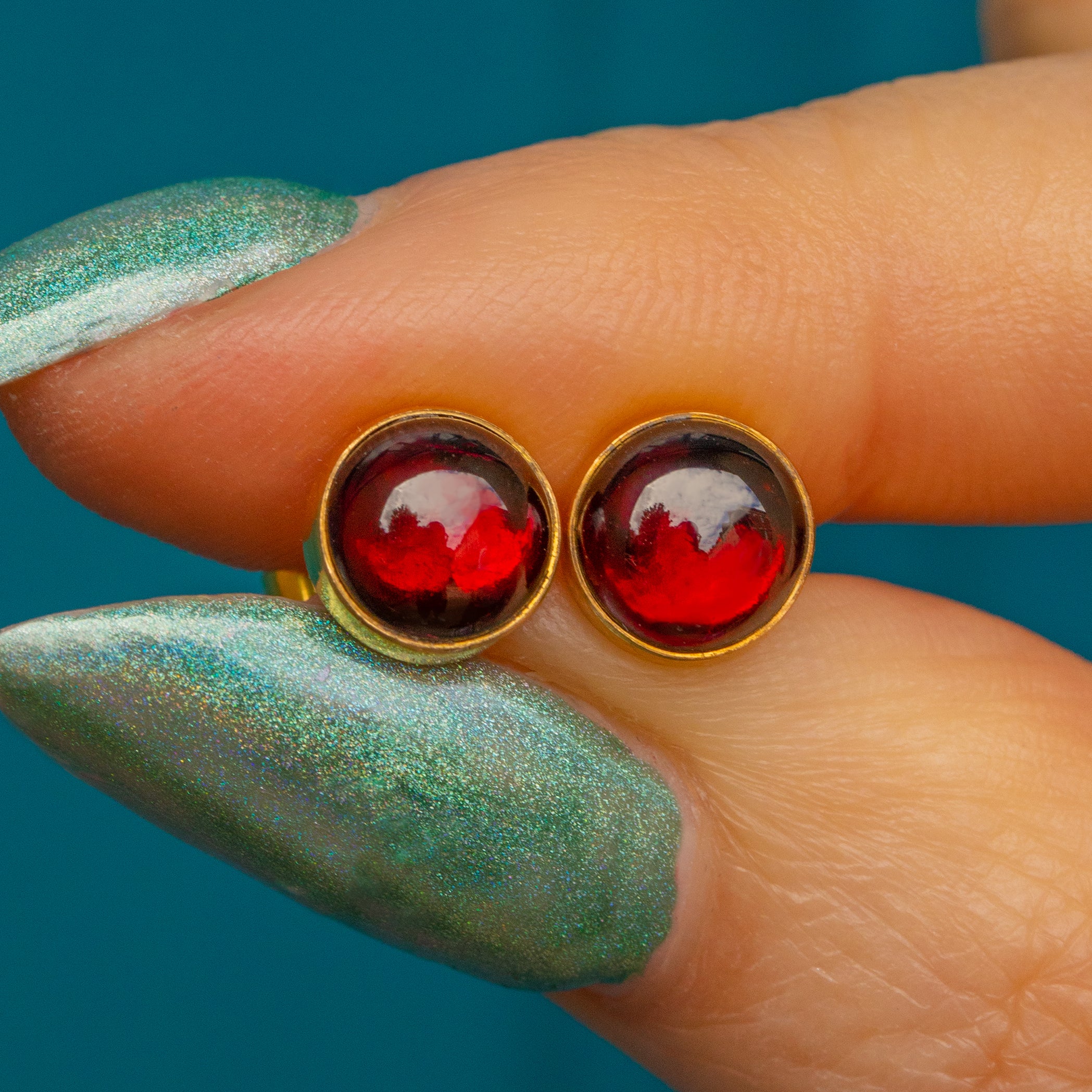 Add a touch of Vintage elegance to your ensemble with these exquisite 9ct Gold Garnet cabochon stud earrings! Deep berry red hues seep from the depths of the smoothly cut Garnet cabochons, revealing flashes of crimson as they catch the light.