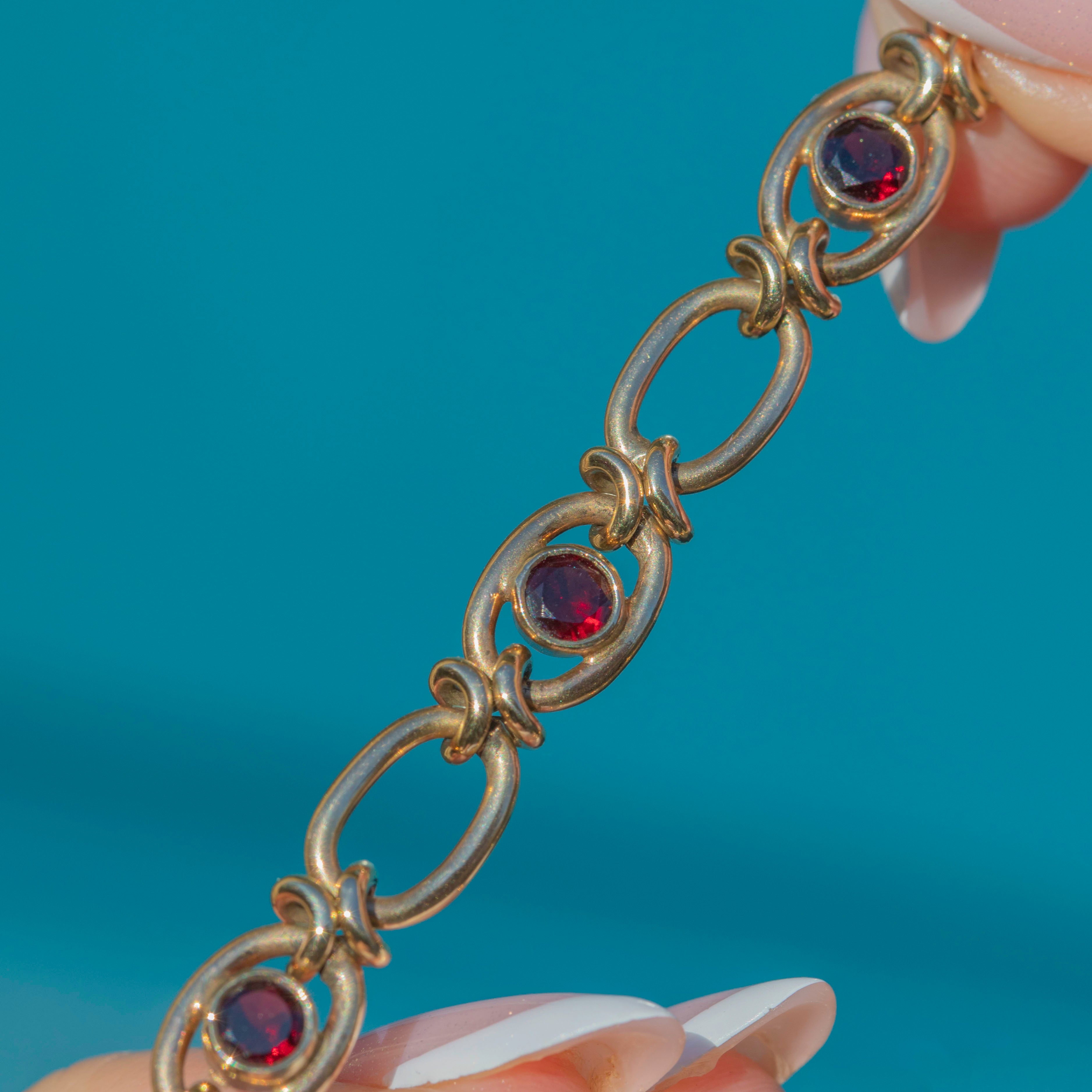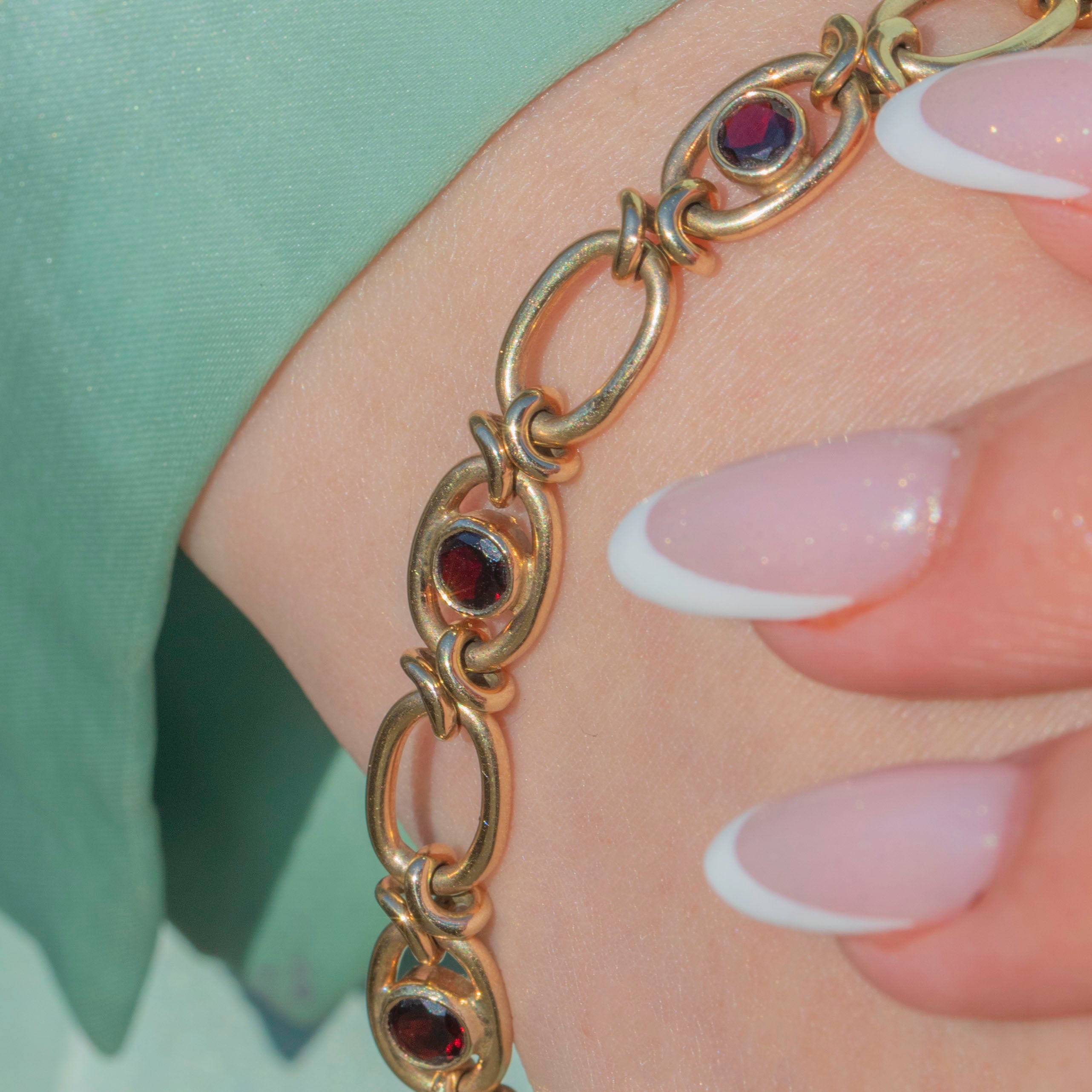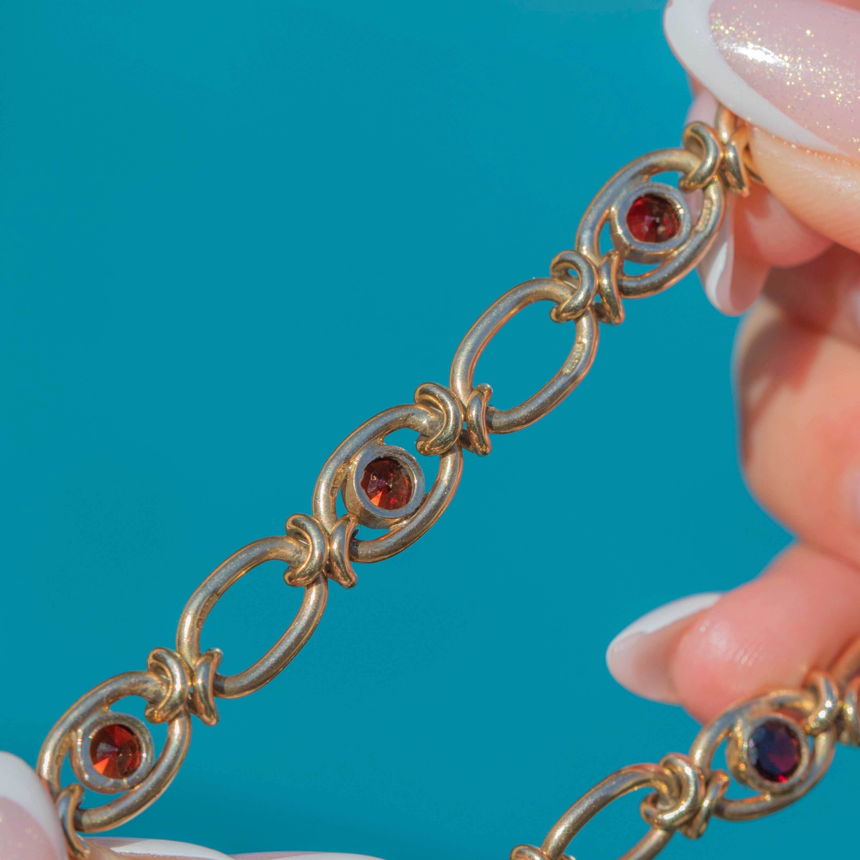 EXCELLENT: This 9ct Gold Garnet fancy link bracelet is in excellent condition. Each of her links is uniform and secure, and her Garnets are radiant with no chips or scuffs. With a safety chain for added security, this vintage Garnet bracelet can be worn with the utmost confidence!