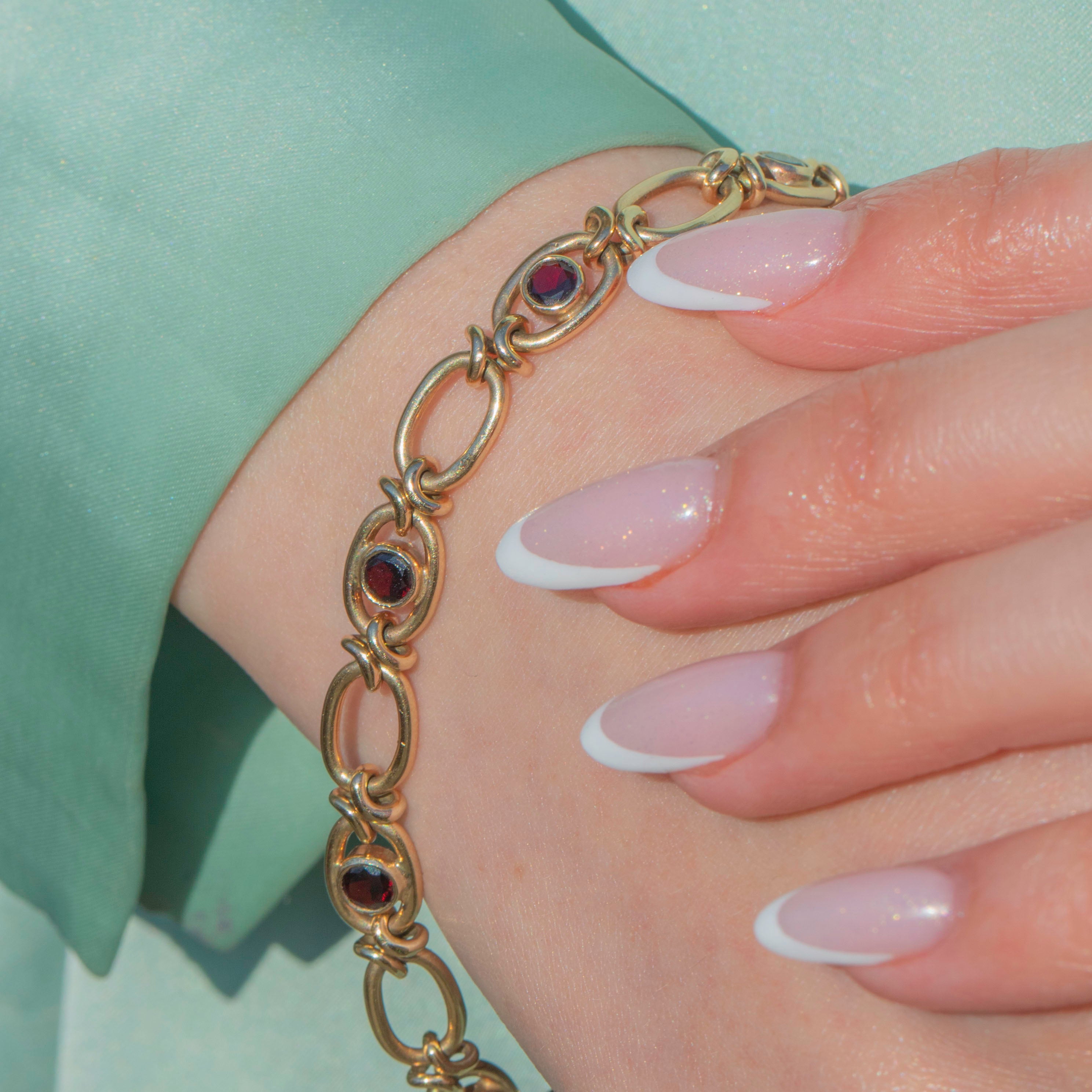 At 7.5" in length, her curvaceous links sit comfortably against your wrist and with each one embellished with a radiant Garnet, she will add the perfect pop of colour to every outfit. This vintage bracelet is bound to become your newest go-to piece!