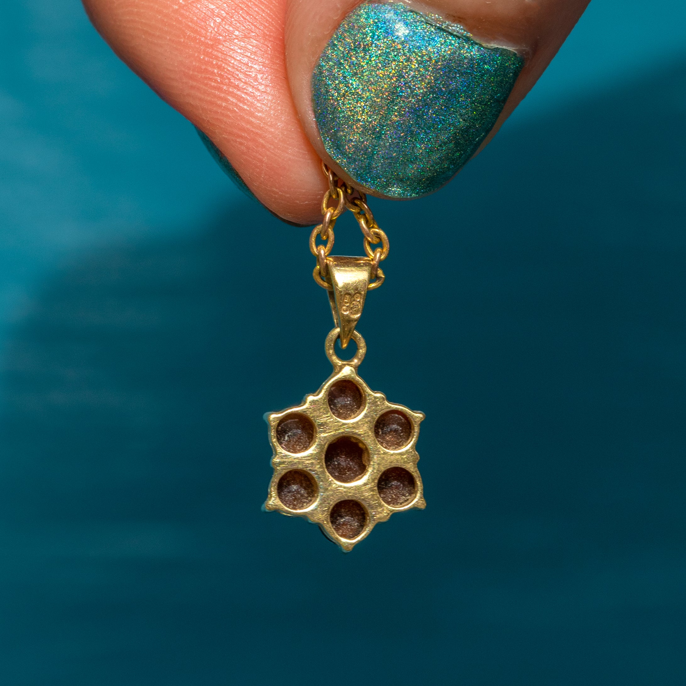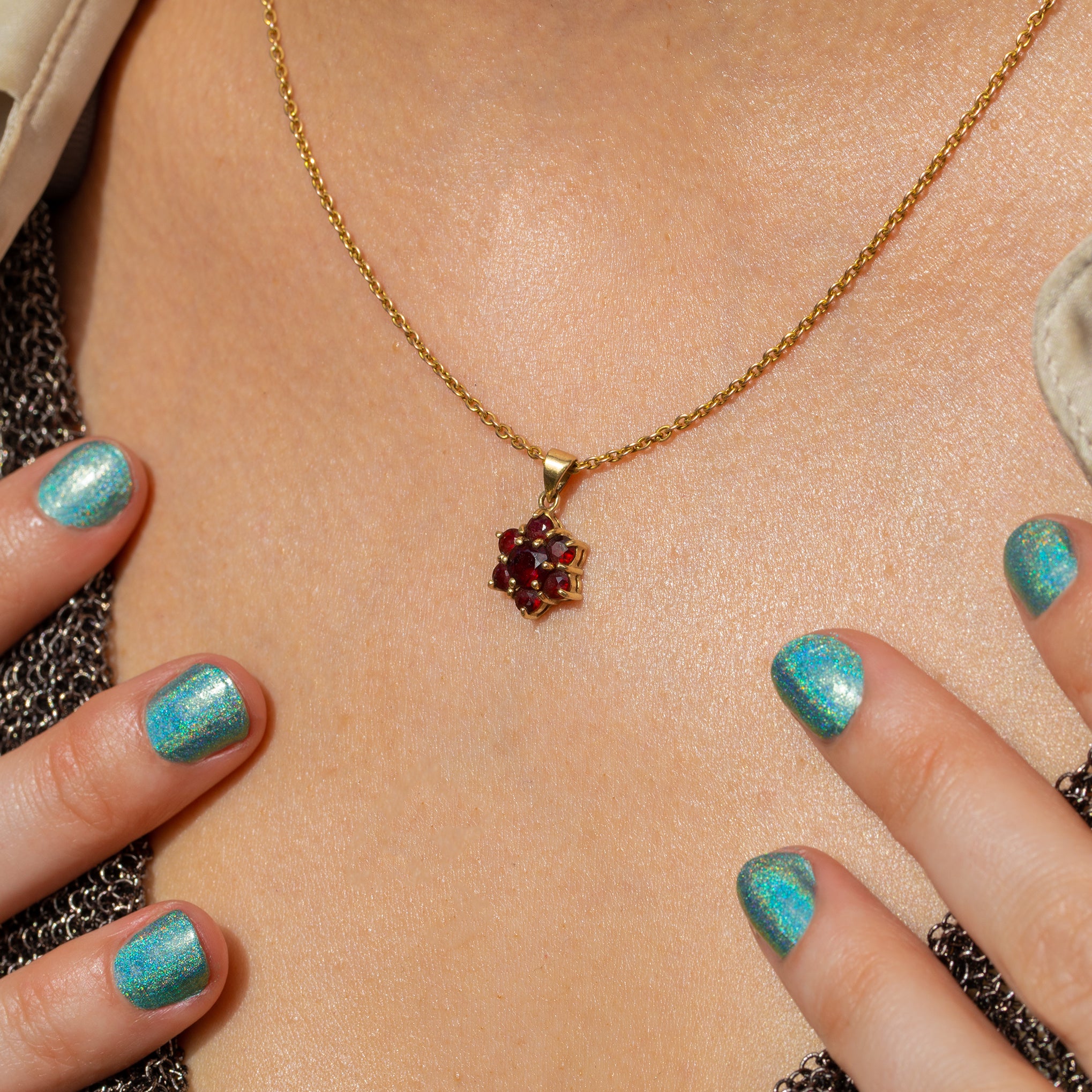 This 9ct Gold Garnet flower charm is sure to steal the heart of Capricorn, Aquarius or lover of this sensational Gemstone! Inlaid with 7 juicy Garnets flaunting deep sangria hues, her floral formation makes for a fun addition to any neck stack.