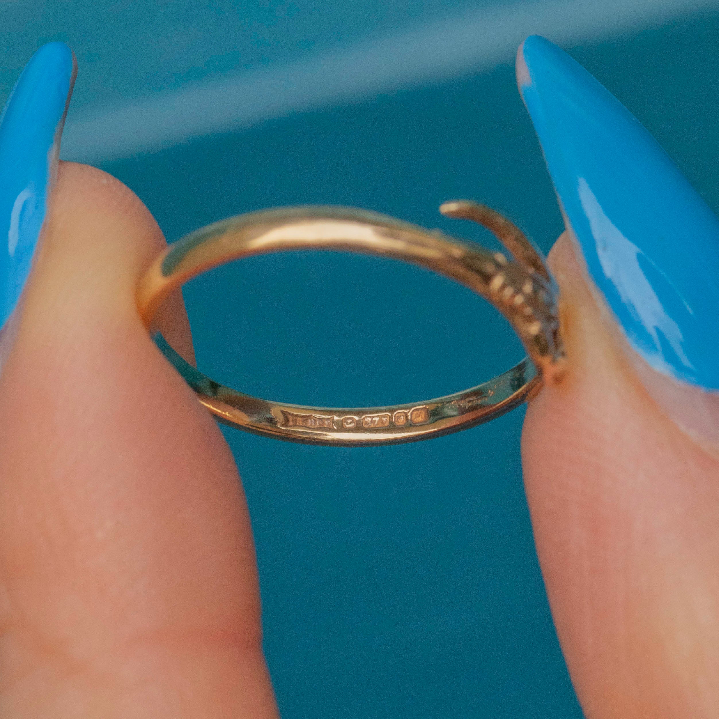 The head of the snake displays lovely engraved details bringing it to life, inlaid with a single Garnet adding a seductive crismon red hue. With a full set of English hallmarks inside the band, we can accurately date this retro Gold snake ring to 1986!