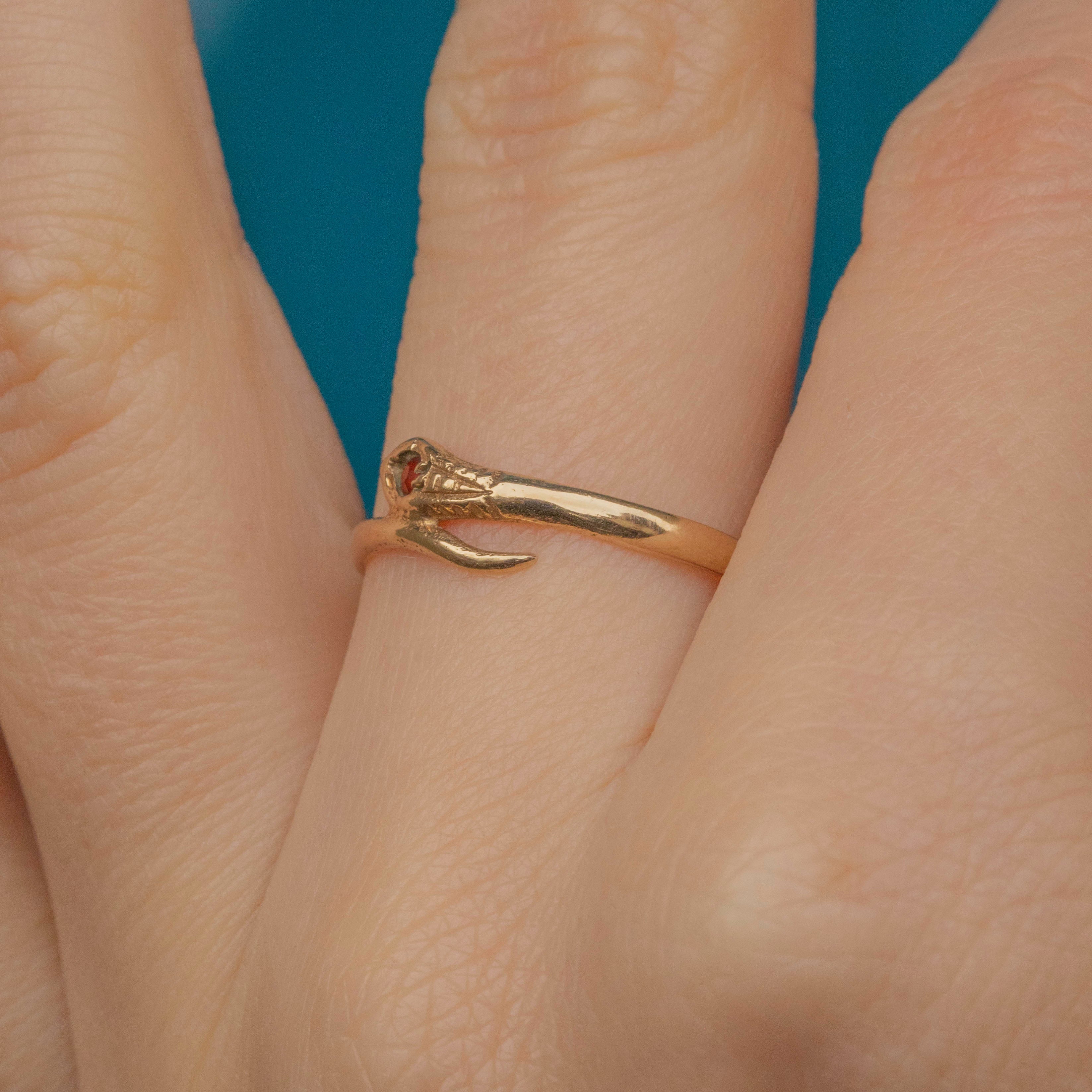 This characterful 9ct Gold Garnet snake ring will make a unique addition to your ringstack! Lightweight and comfortable to wear, the serpentine form of this vintage ring is crafted from solid 9ct Gold and will wrap around your finger with undeniable luxury.