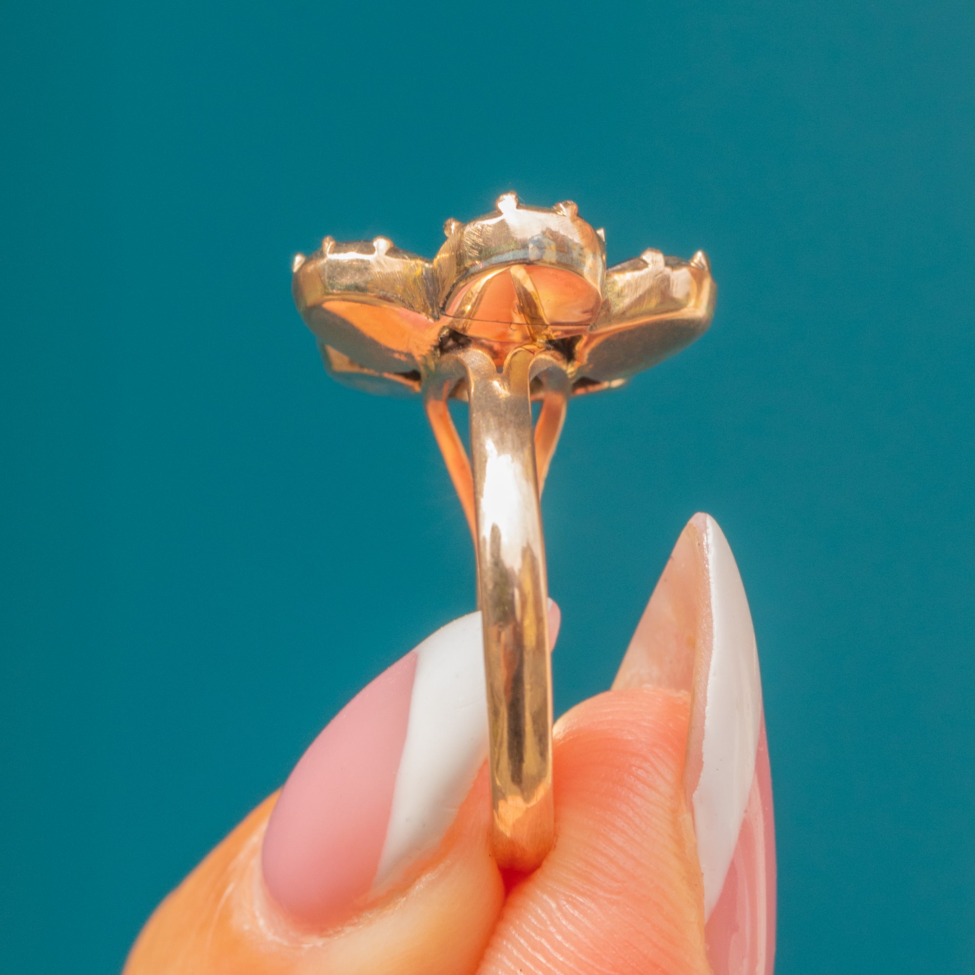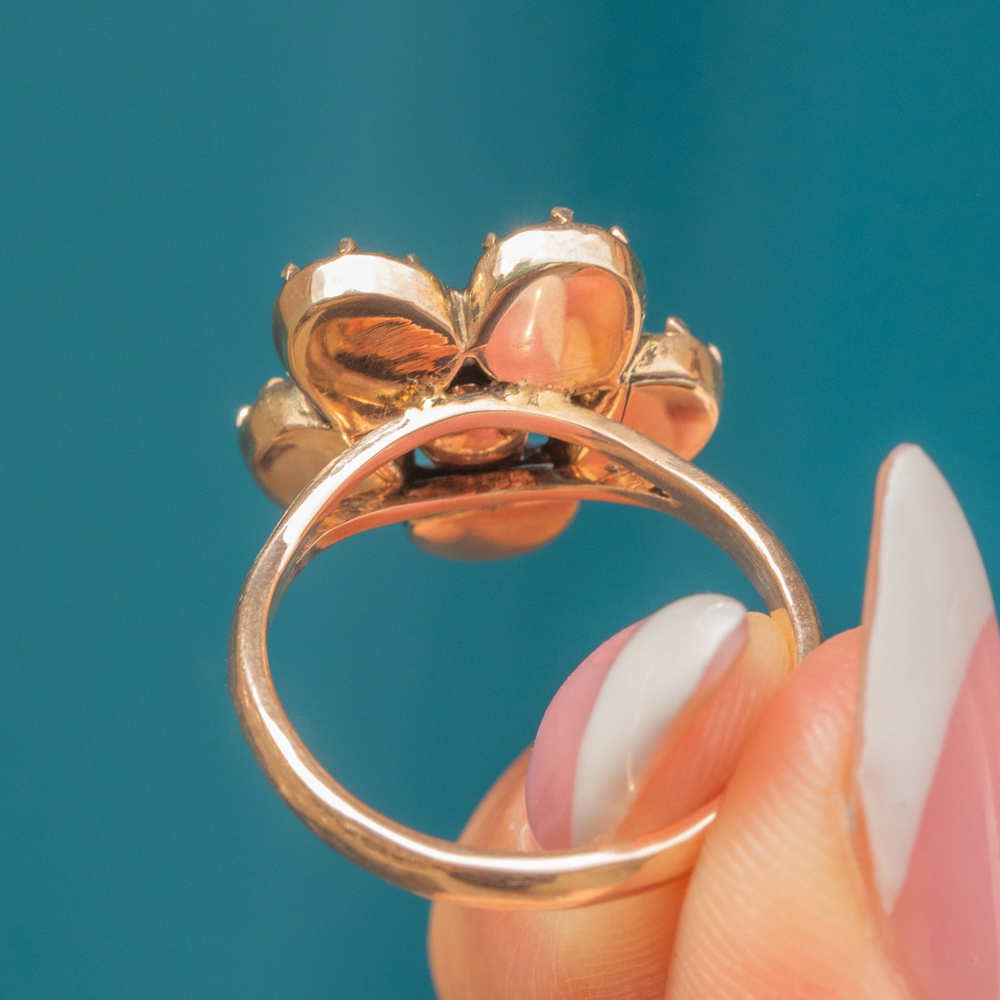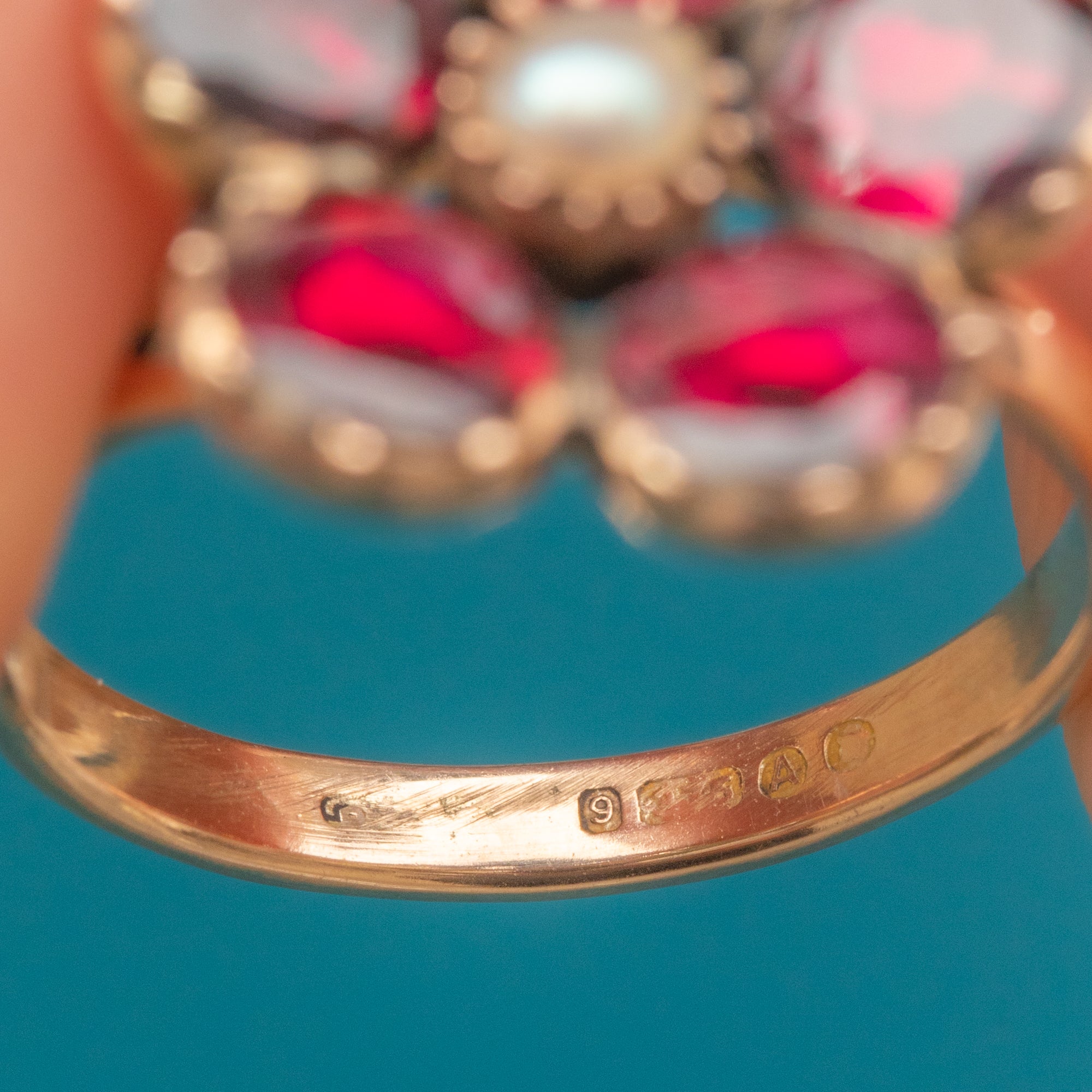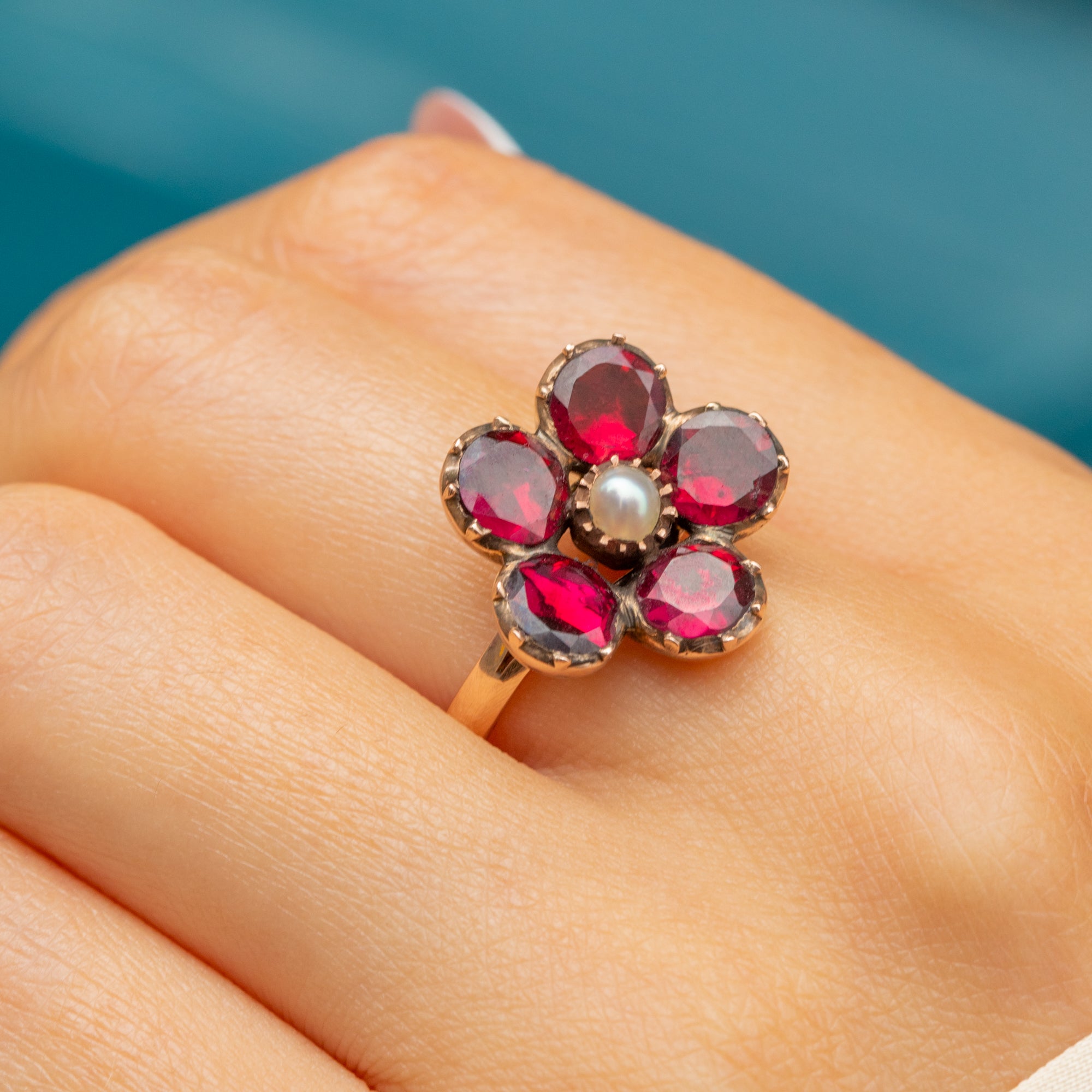 A charming Georgian pansy ring in 9ct Gold, set with five glowing Garnet “petals” around a creamy Pearl.