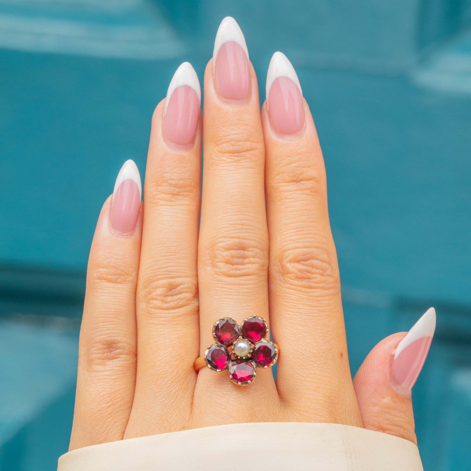 The classic floral motif sits low on the finger for effortless, everyday elegance, with rich colour contrast between the deep red Garnets and the luminous central Pearl.