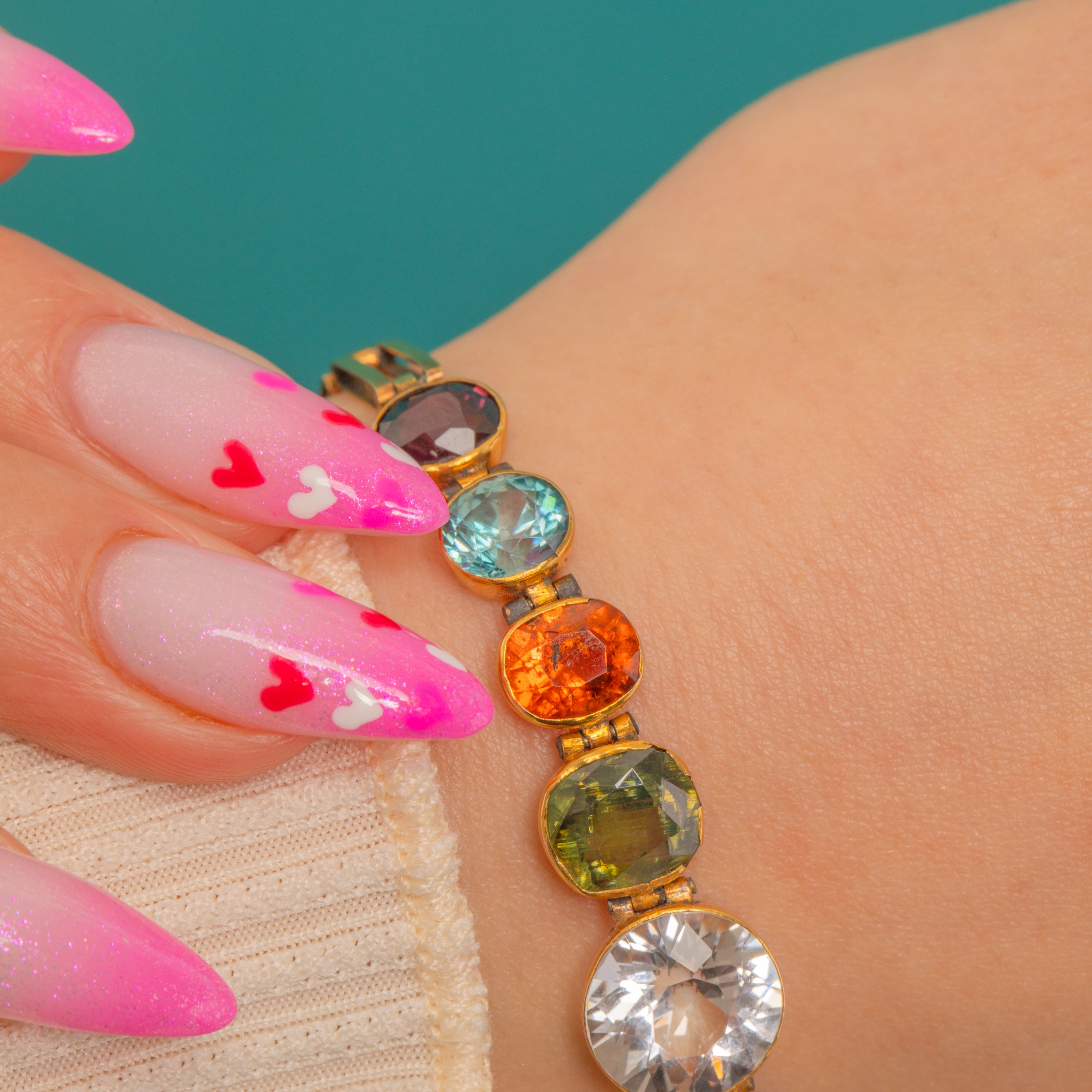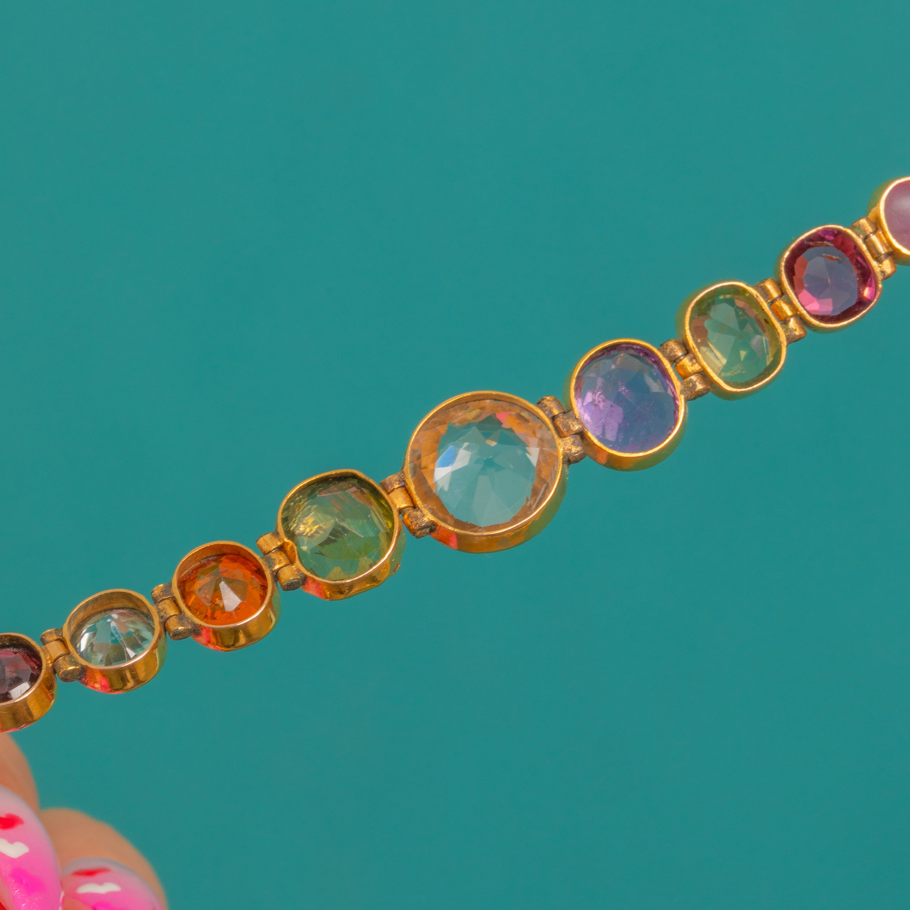 A joyous Victorian “harlequin” line bracelet in 9ct Gold, set with a kaleidoscope of coloured gemstones. At its heart sits a luminous White Topaz of approximately 3.60ct, framed by a vibrant parade of Star Ruby cabochon, Emerald, Amethyst, Pink and Green Tourmaline, Citrine, Aquamarine and Spinel. The smooth bezels and articulated construction create a refined, wearable silhouette that lies beautifully on the wrist.