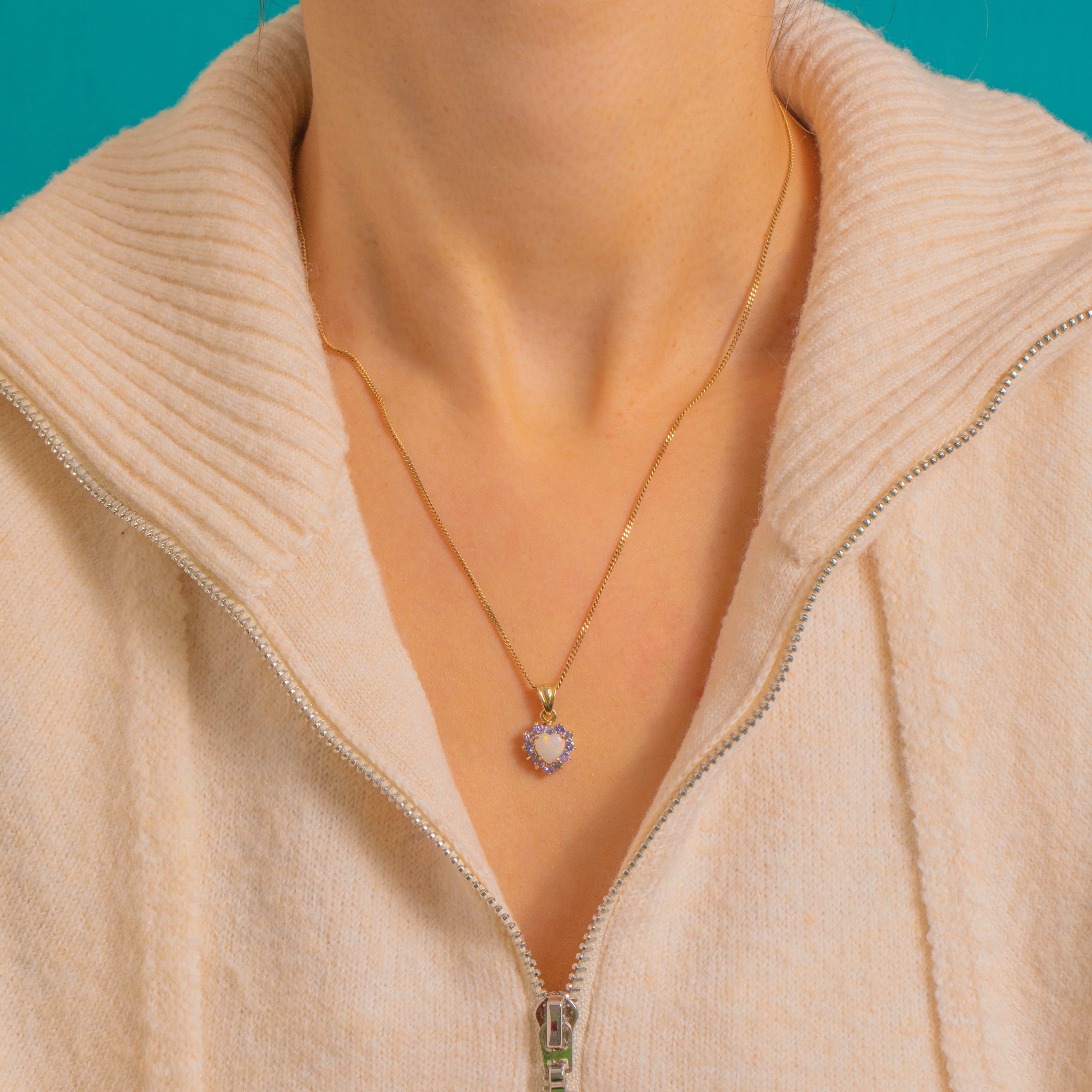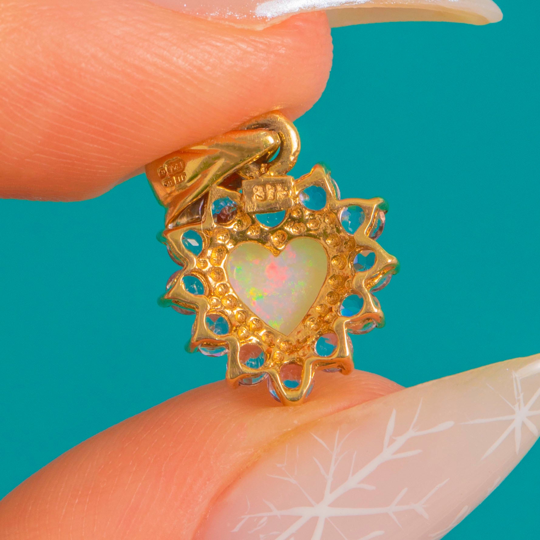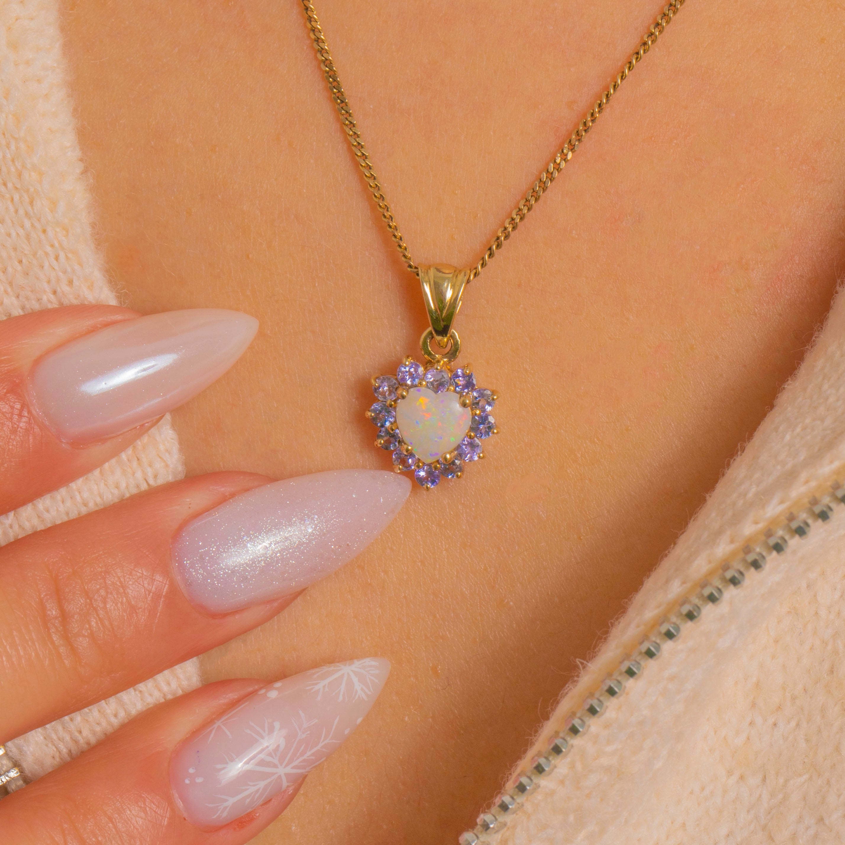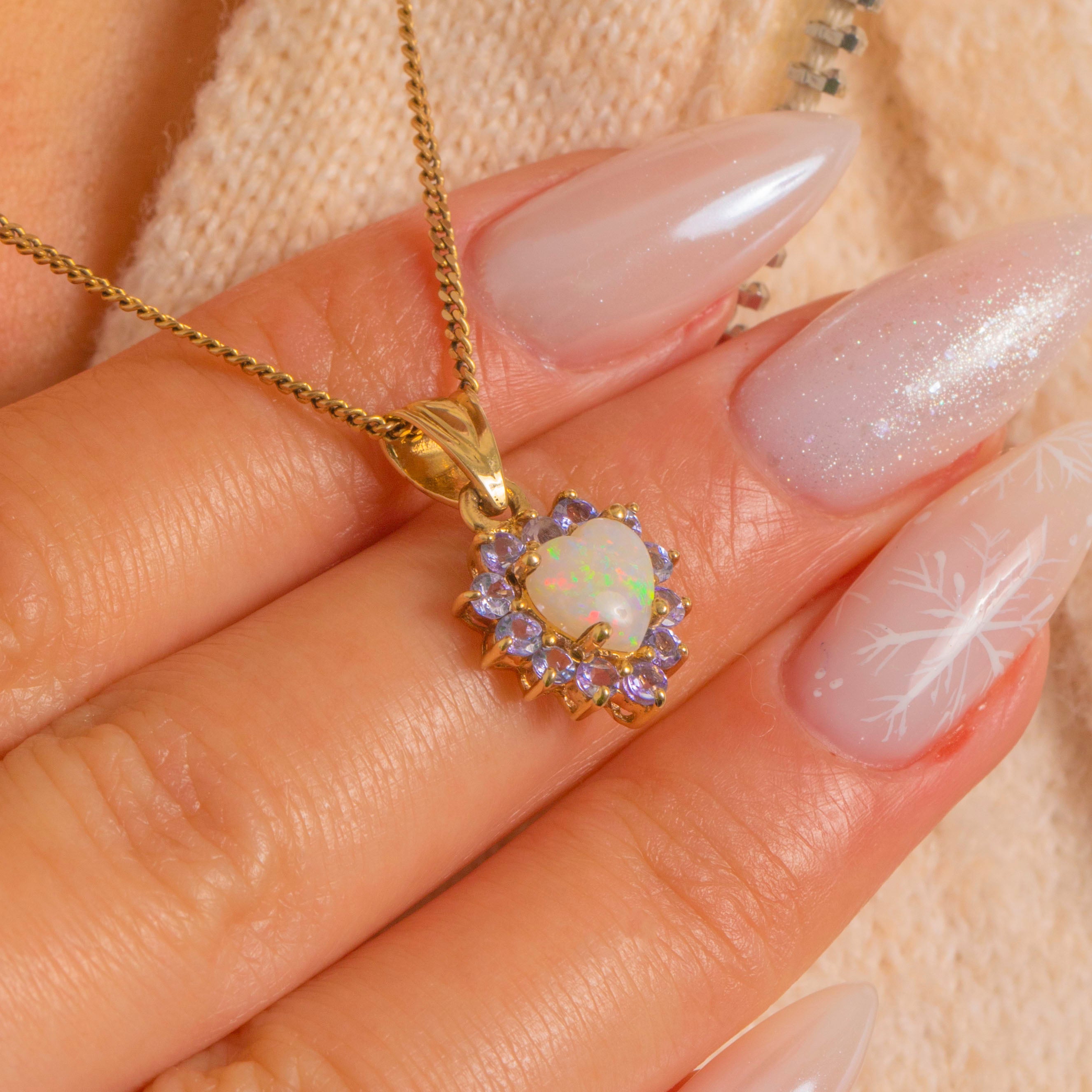 Romance in miniature, this Vintage pendant centres a glowing Opal heart cabochon alive with playful flashes of green, orange and pink. A delicate halo of lilac-violet Tanzanites encircles the heart, their fine sparkle beautifully complementing the Opal’s ethereal sheen. All crafted in warm 9ct Gold, the cluster is finished with a polished split V-shaped bail for a refined, graceful drop.