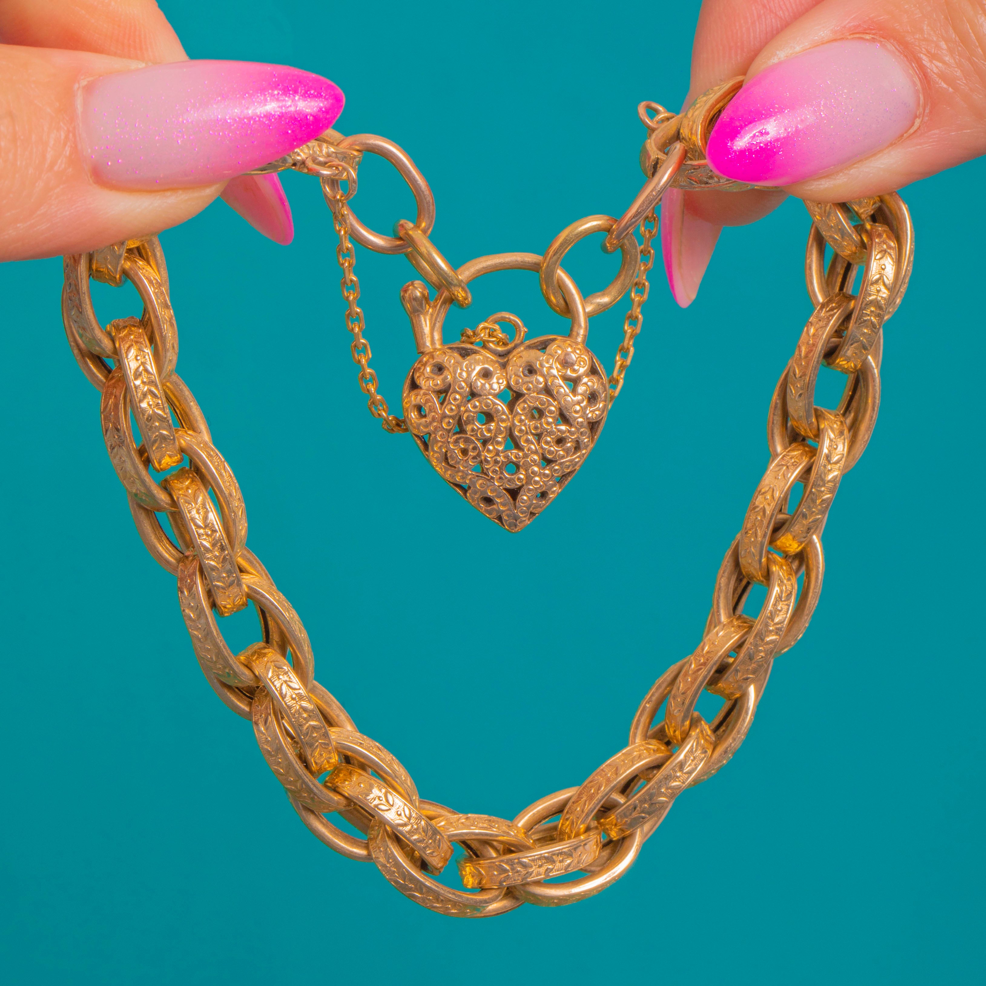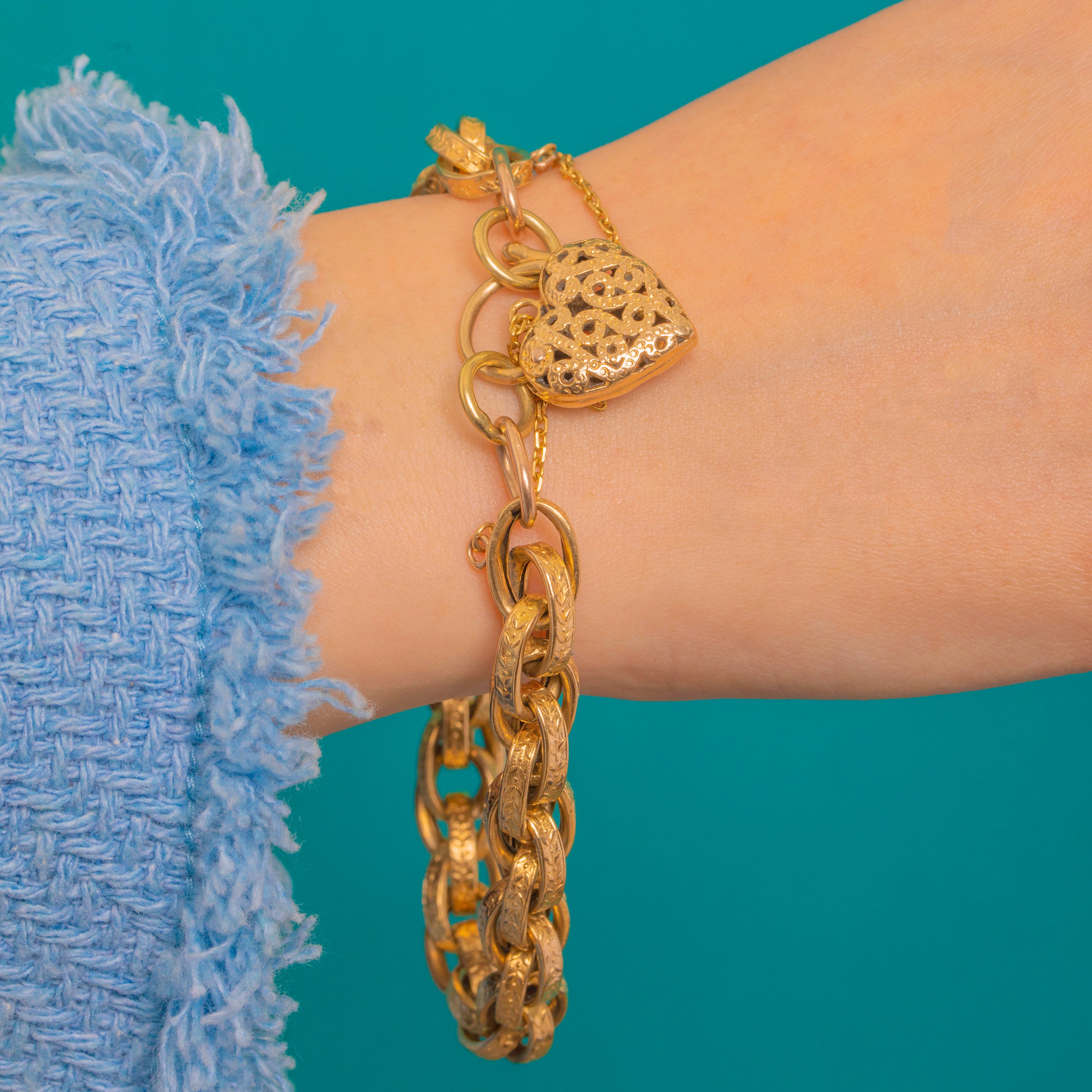 Richly romantic and wonderfully substantial, this Victorian 9ct Gold heart padlock bracelet is a timeless classic. The bracelet is composed of bold, flattened oval links intricately engraved with scrolling foliate motifs, culminating in an ornate heart-shaped padlock clasp with pierced detailing. At 20.5g, it has a deliciously weighty feel and a graceful drape on the wrist, complete with a short safety chain for that quintessential period touch.