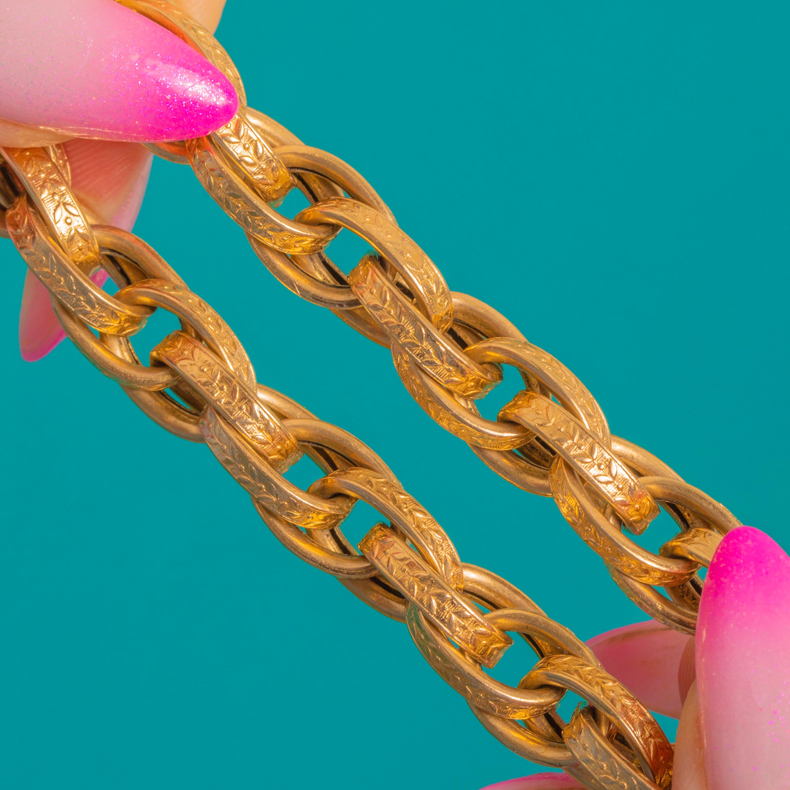 EXCELLENT: The Gold is bright and buttery with only light surface wear and fine scratches to the links and padlock commensurate with age, with a pleasing patina in the recesses that accentuates the engravings. Links are strong and the padlock and safety chain are present, with secure joints throughout. No obvious repairs or alterations observed.
