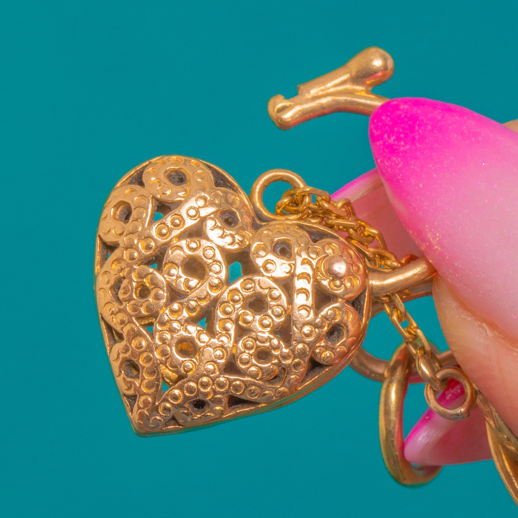 9ct Gold Heavy Engraved Link Heart Padlock Bracelet, 20.5g