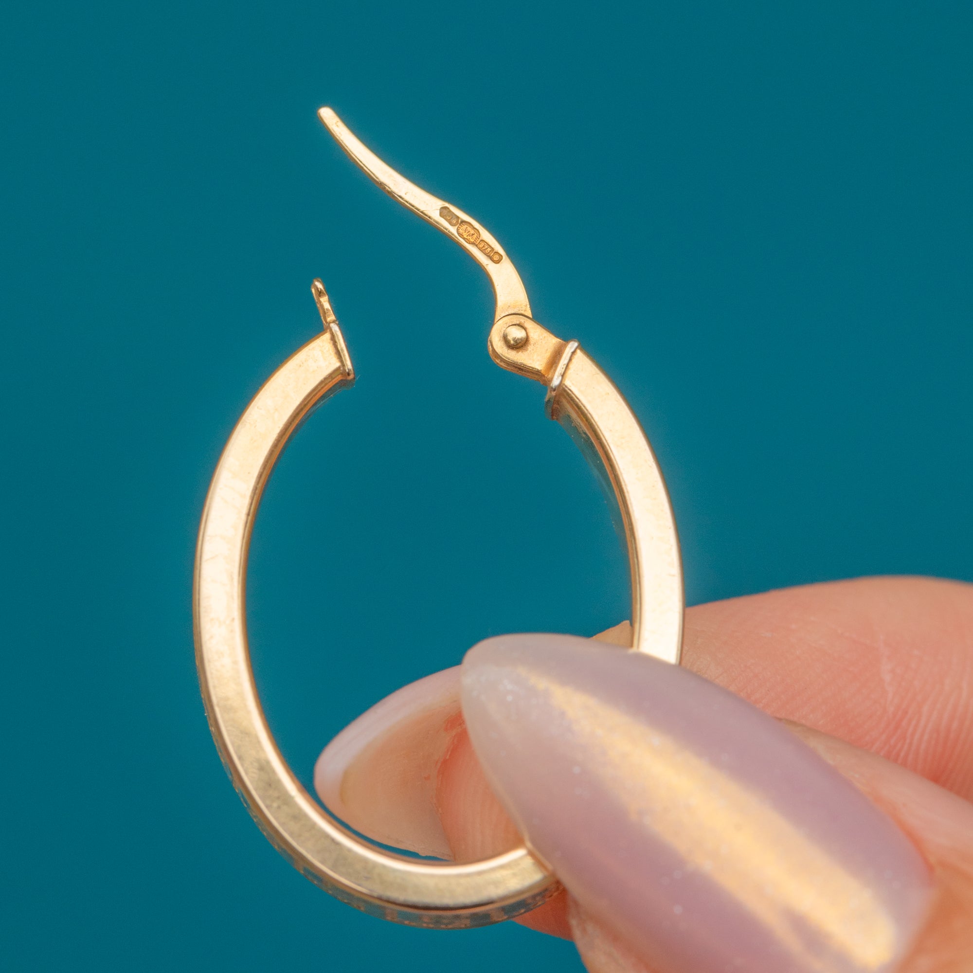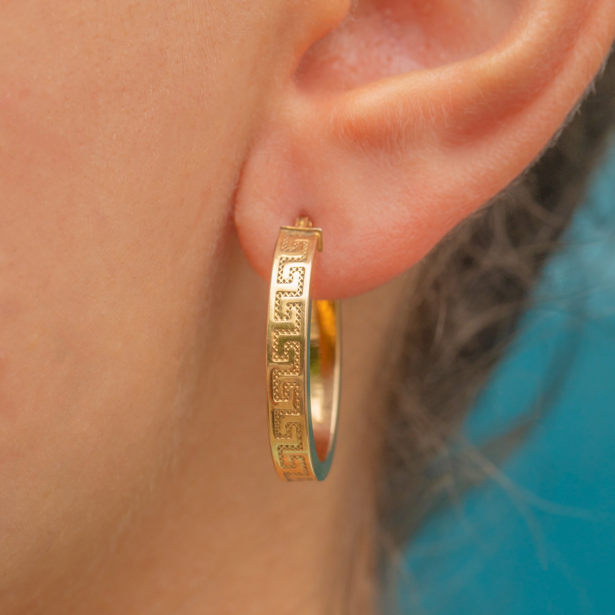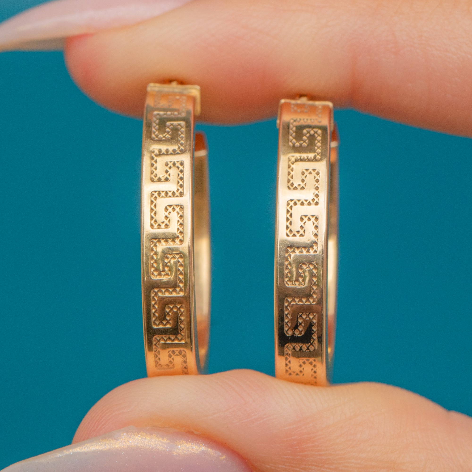 Crafted from glossy solid 9ct Gold, these oval earrings are engraved with an ornate Greek key design, providing a wonderful texture and depth.