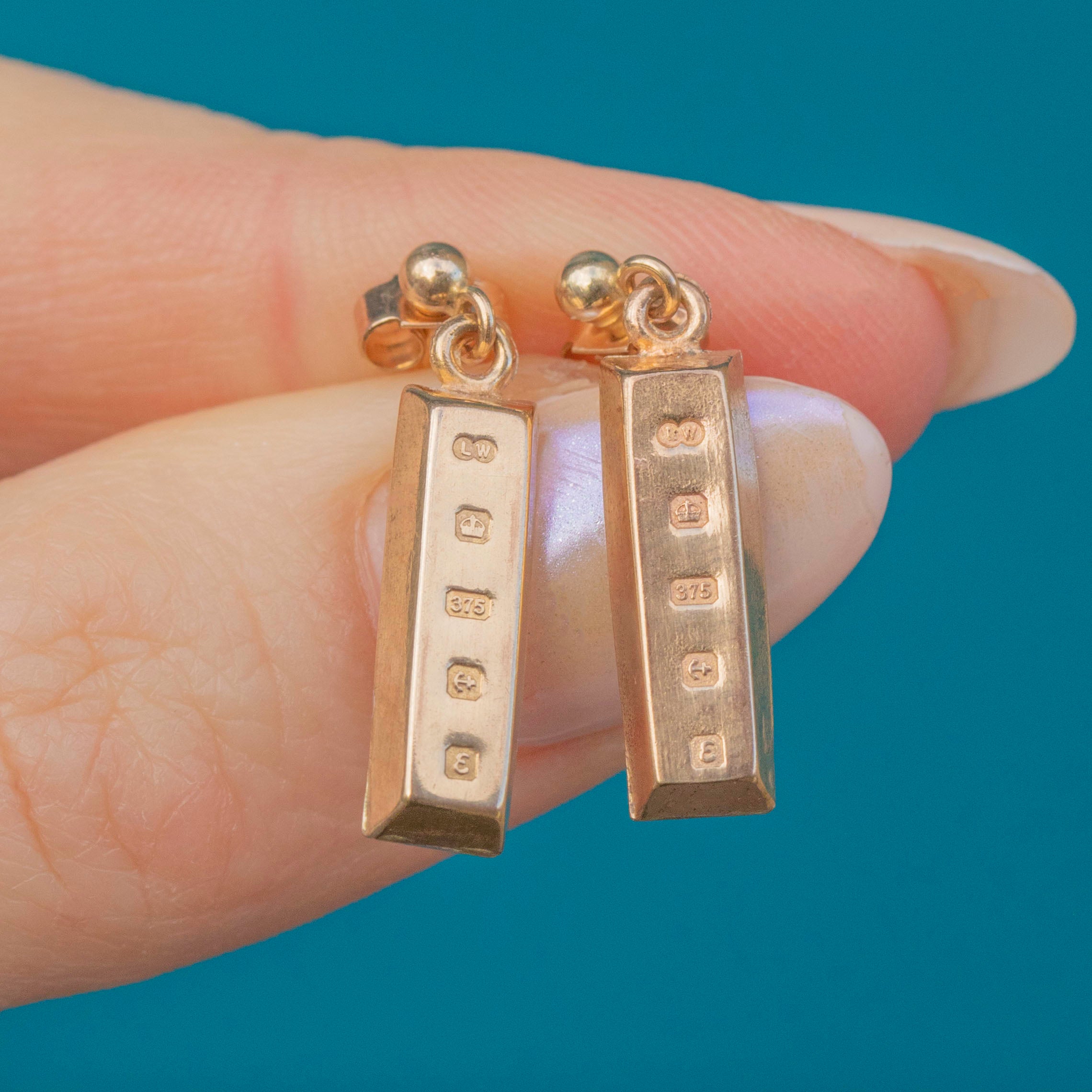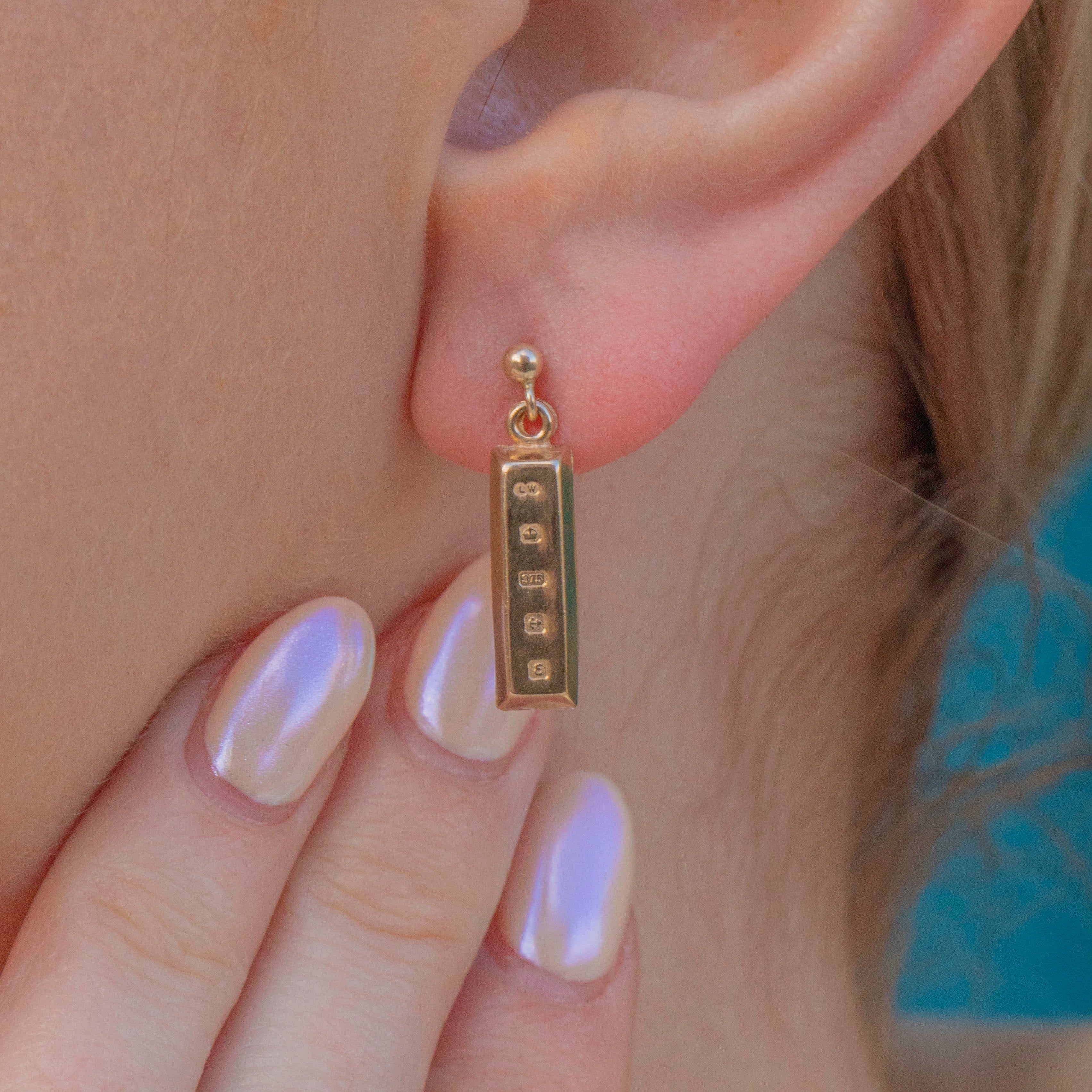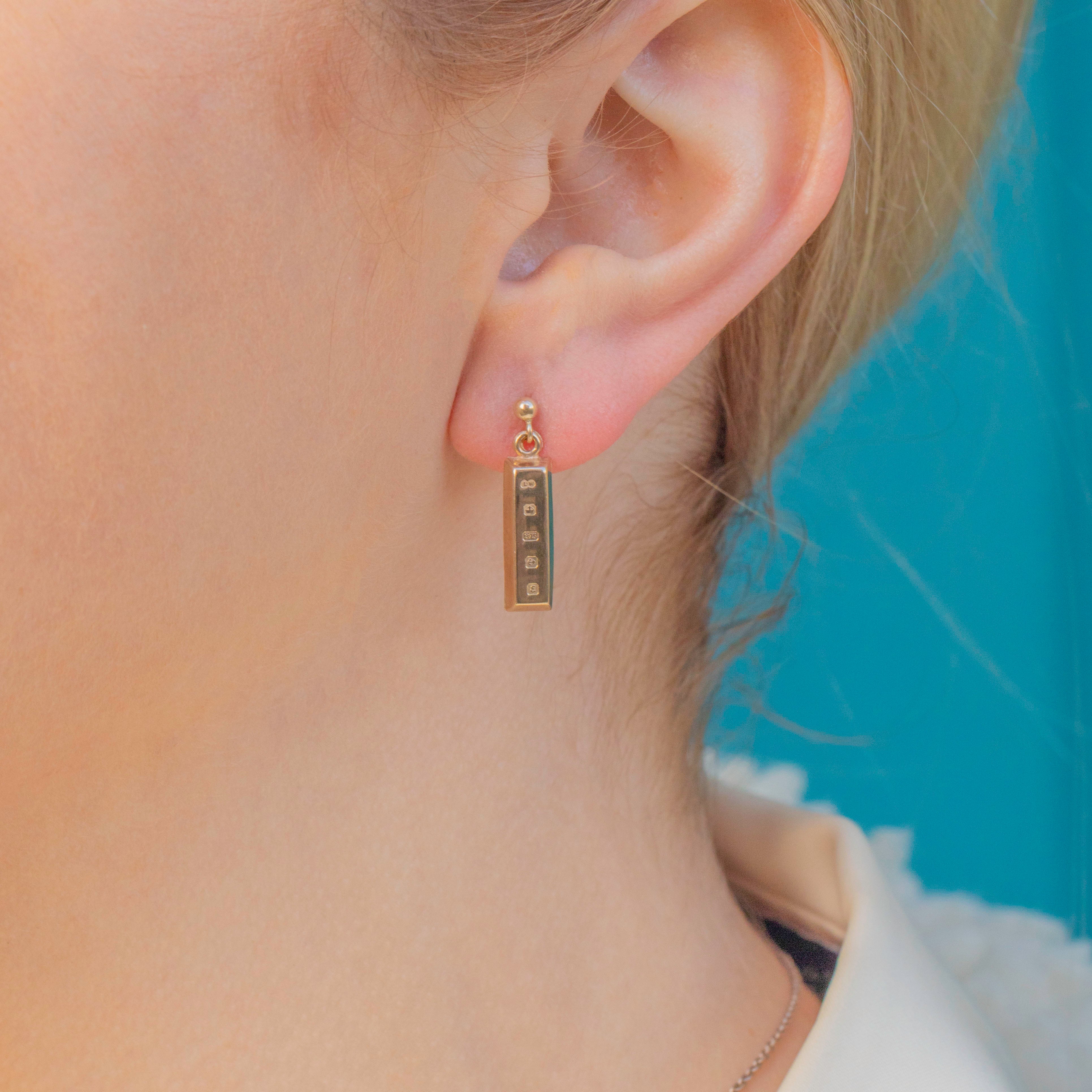 This pair of 9ct Gold ingot earrings will be the perfect touch of Gold to your outfit! Their solid ingot forms suspend luxuriously from the lobes, with their bold hallmarks making quite the statement.