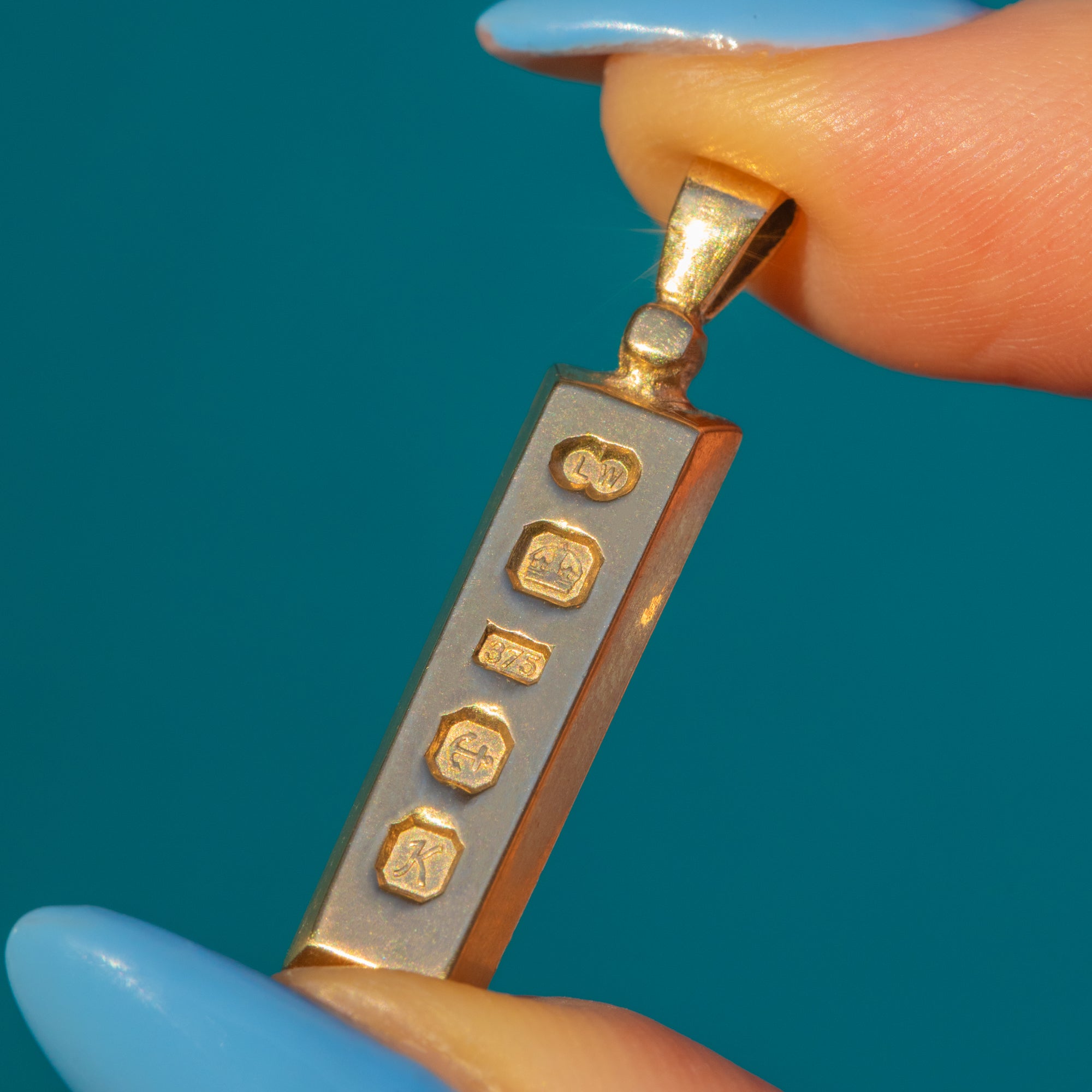 VERY GOOD. This 9ct Gold ingot pendant is in great condition. The hallmarks are crisp which have allowed us to accurately date her to 1984. There is some light surface wear on the back of the pendant, but this cannot be seen when she is worn. The large bale allows you to suspend this vintage Gold ingot from a chain with confidence.