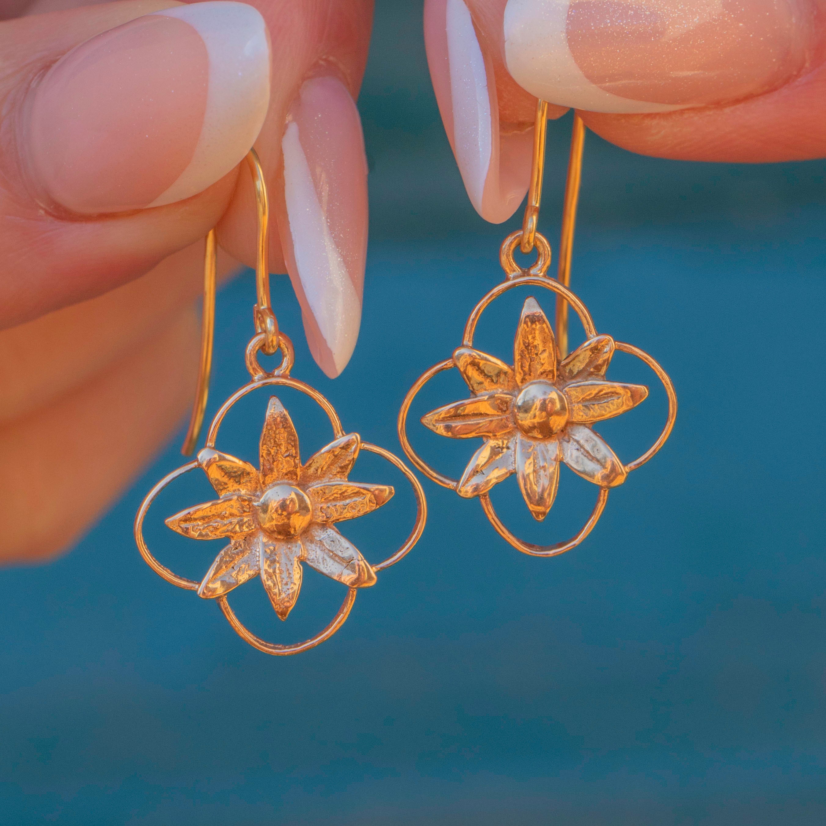 Crafted from buttery 9ct Gold, each earring features a dainty lily motif in her centre, encircled by fine, curvaceous lines. These vintage drop earrings dance with movement as they suspend from your lobes; they are the perfect lightweight and versatile pair for everyday and occasion wear.