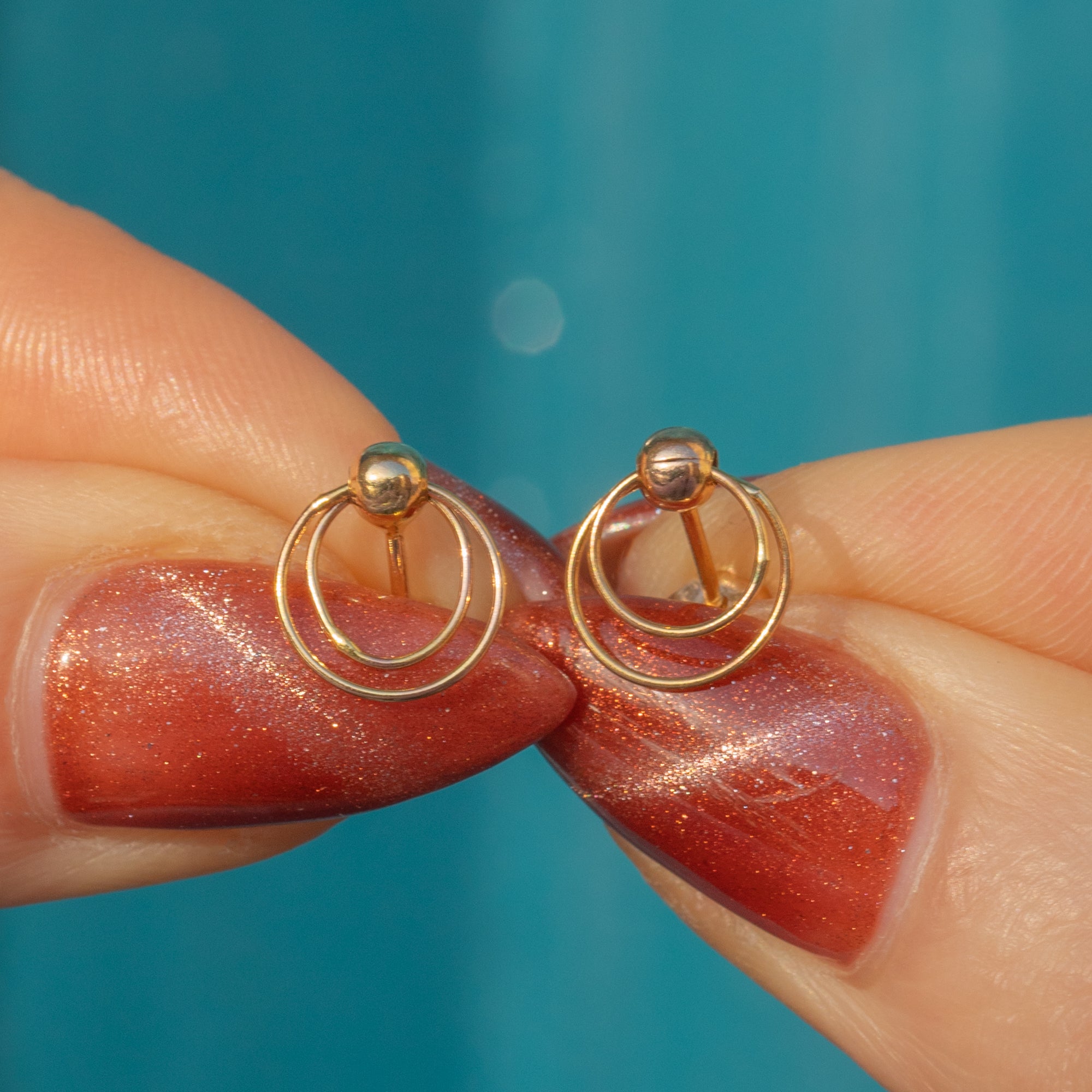 Crafted from warm 9ct Gold, these vintage earrings feature a small hoop encircled by a larger one creating an eye-catching design. They are suspended from Gold pins, giving them a lovely subtle movement as they suspend from your lobes.