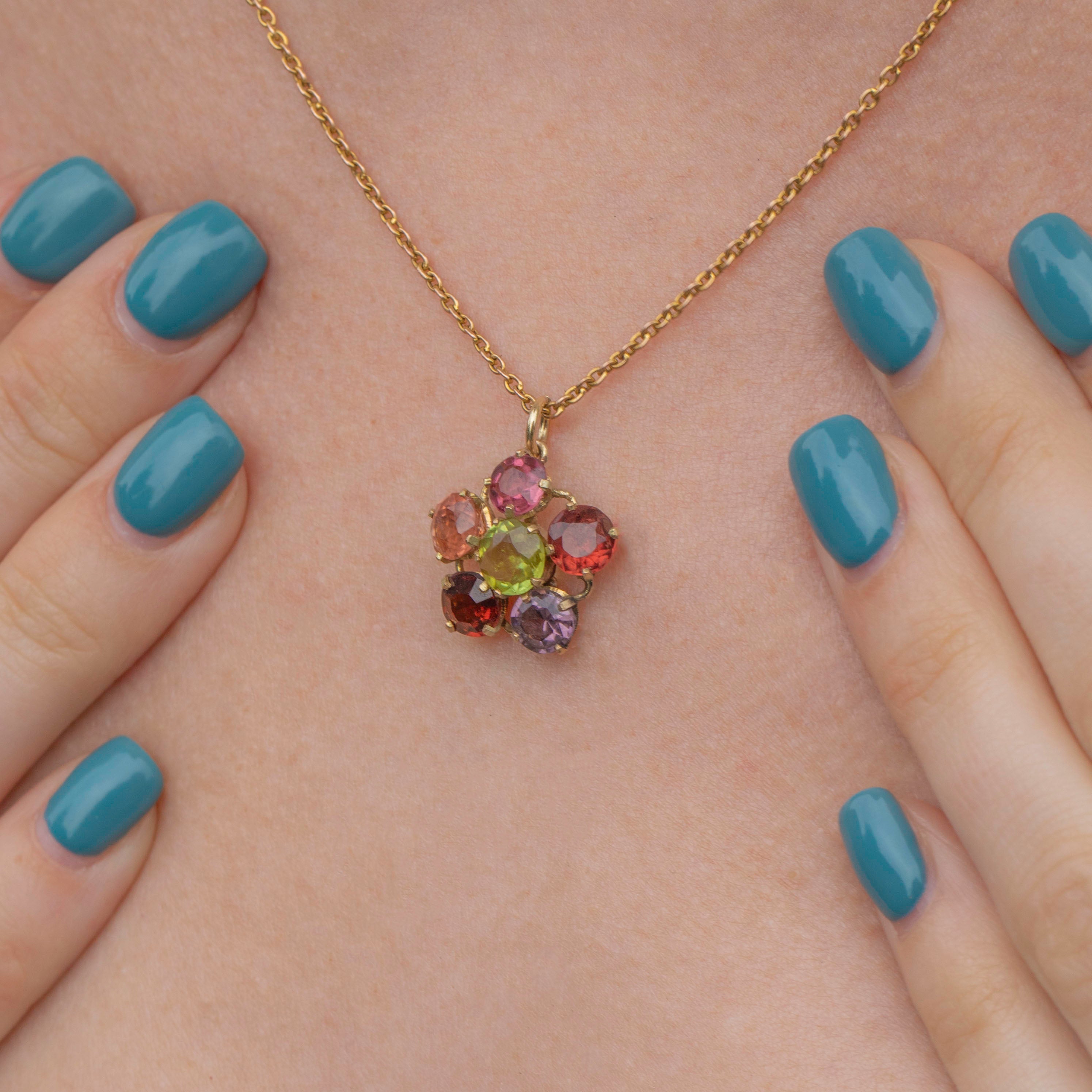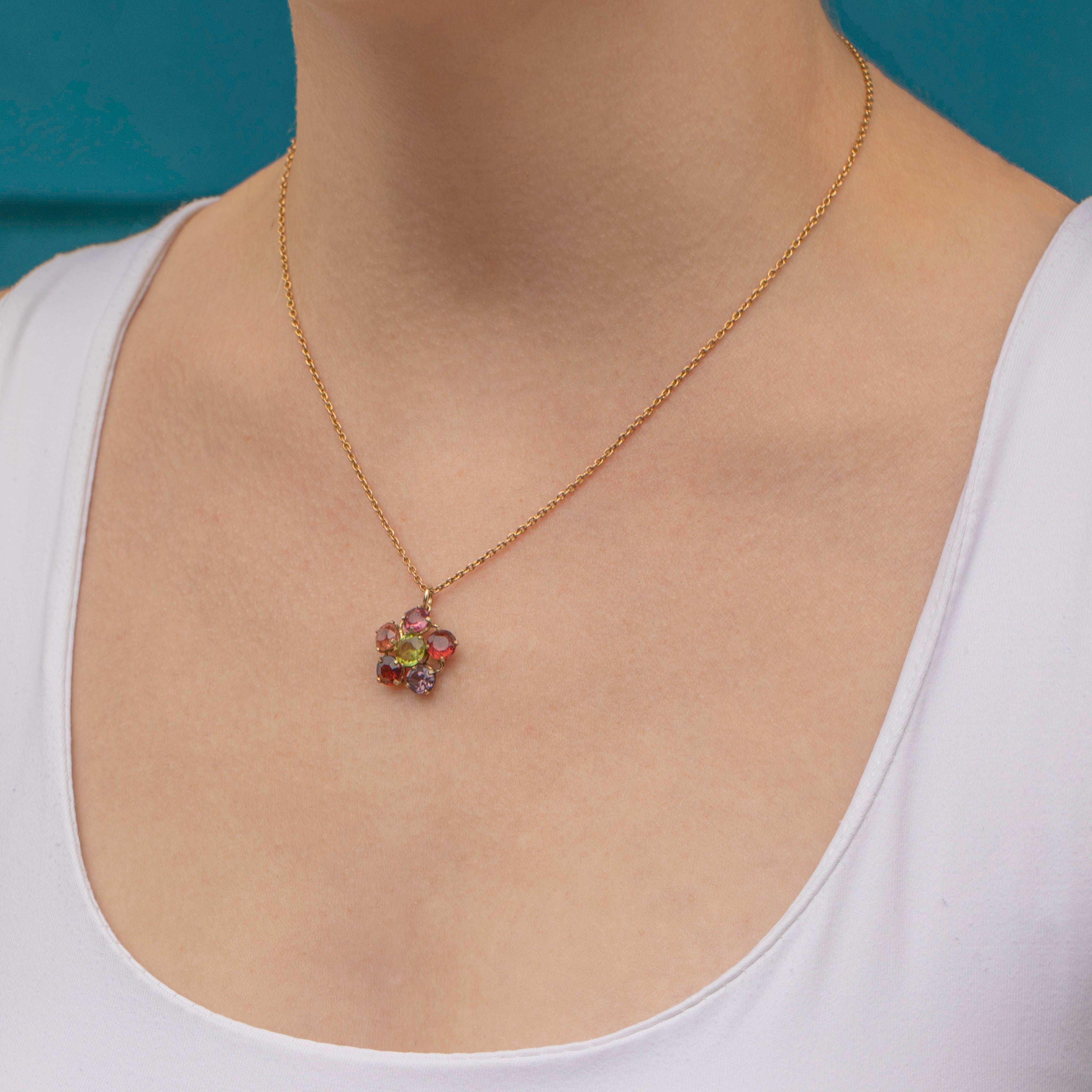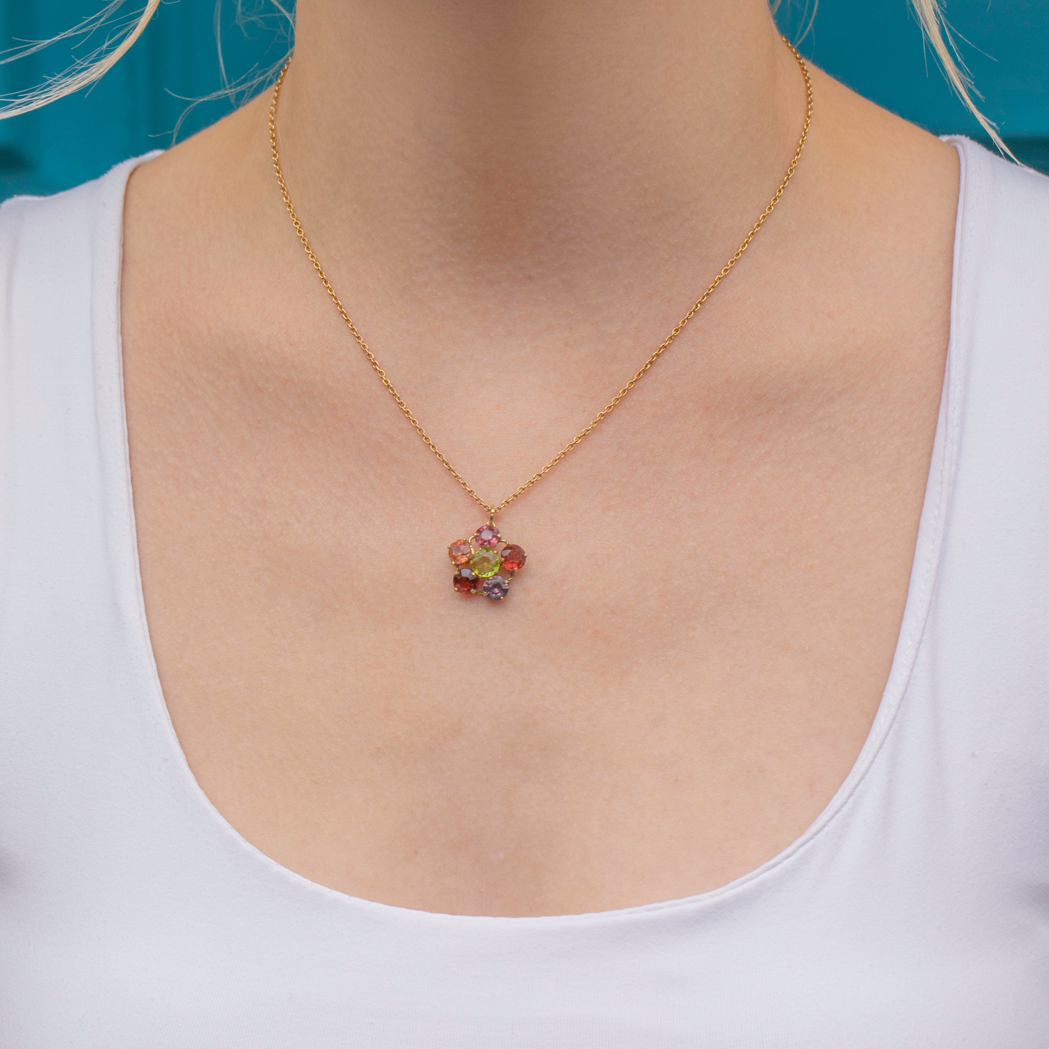 At the heart of the flower is a vibrant Peridot, radiating a fresh verdant hue, surrounded by petals of dazzling Sapphires, exuding a harmonious mix of deep purple, oranges and pretty pink, alongside a deep radiant Ruby.