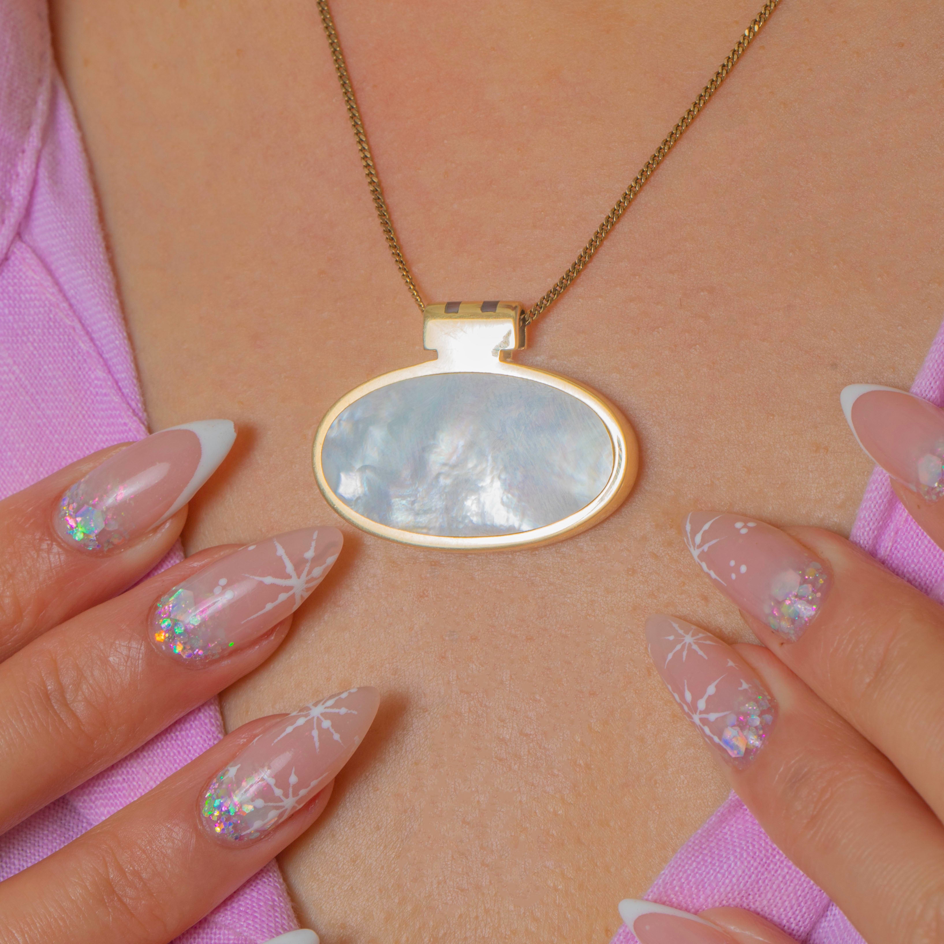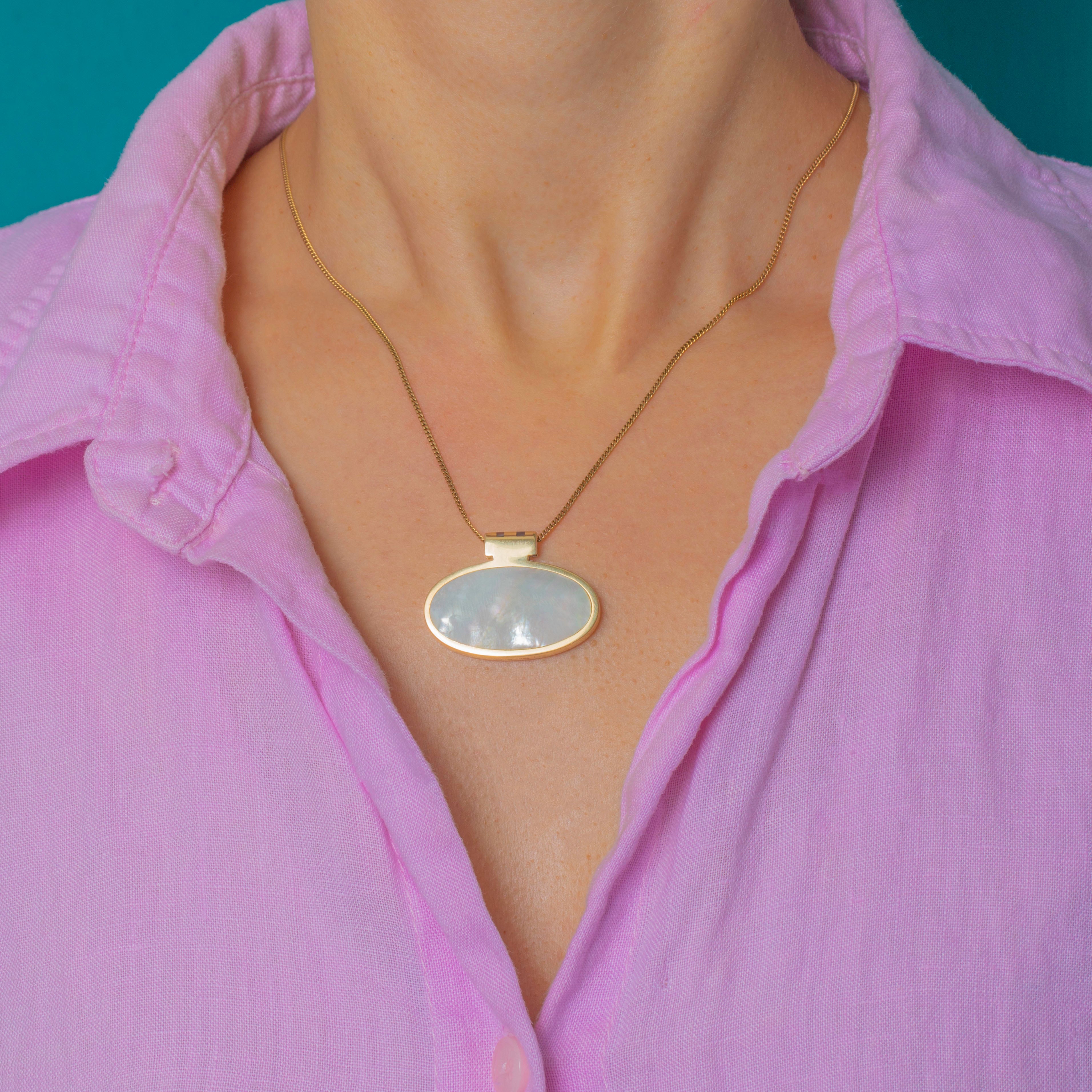 Each smooth, oval Mother of Pearl is framed in a sleek 9ct Gold bezel, giving the pendant a bold, sculptural silhouette. Stylish and easy to wear, it looks fantastic on a simple chain or a modern ribbon.