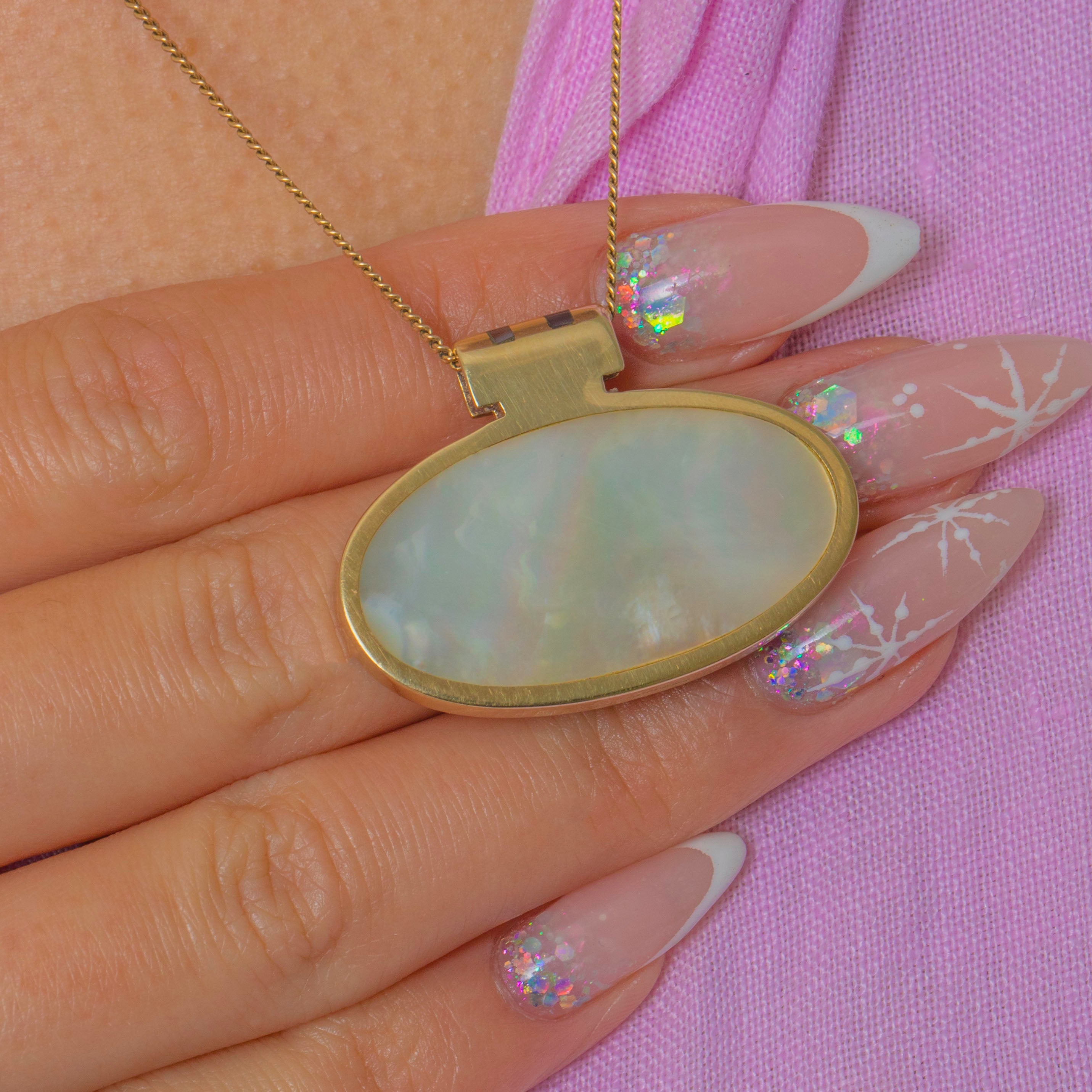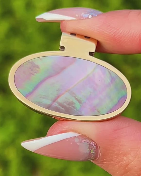 This vintage Mother of Pearl pendant, dated 1997, is a striking and contemporary piece with a beautiful double-sided design. One side displays a soft white iridescence, while the reverse shows a dreamy purple tone with flashes of green and pink, each side offering its own unique character and sheen.