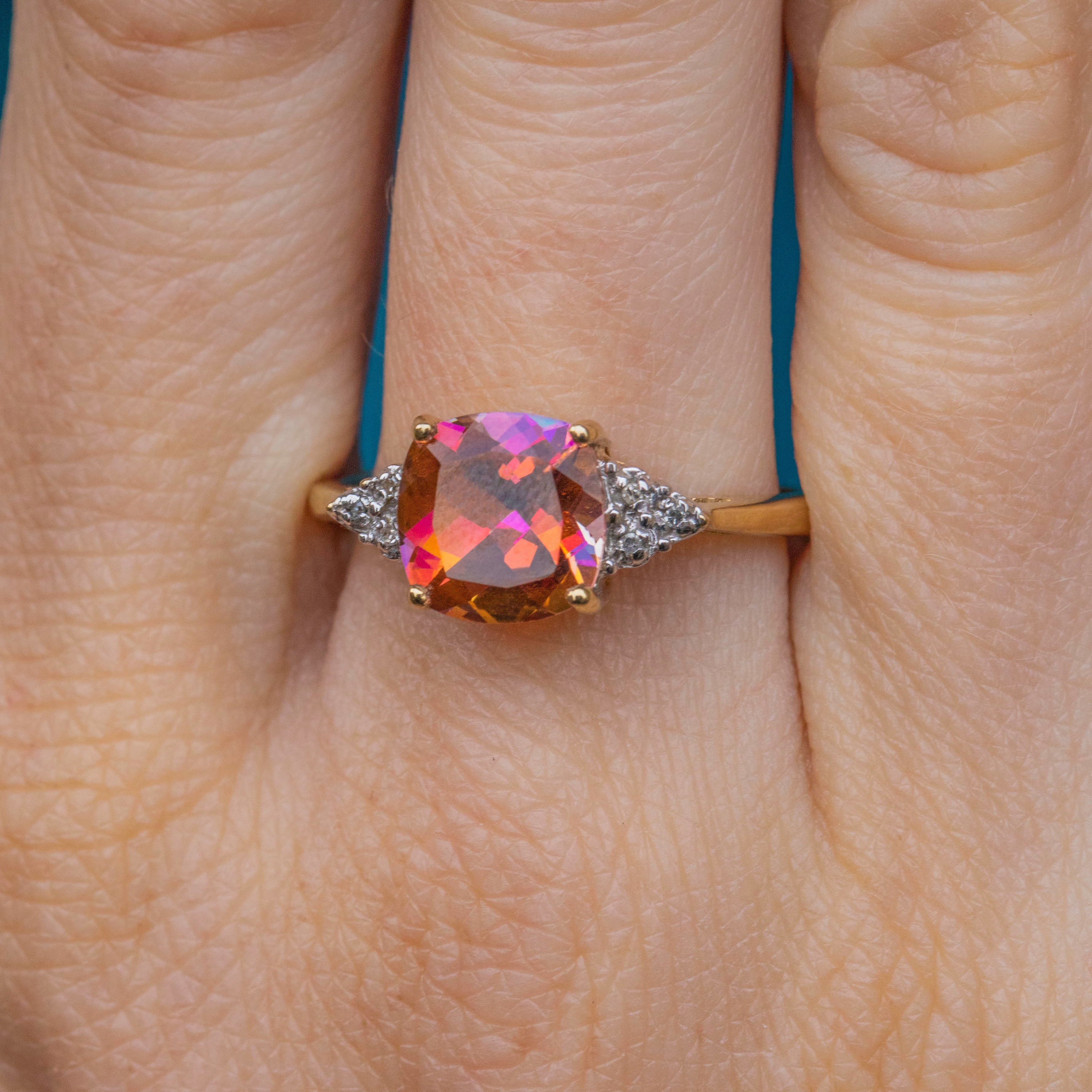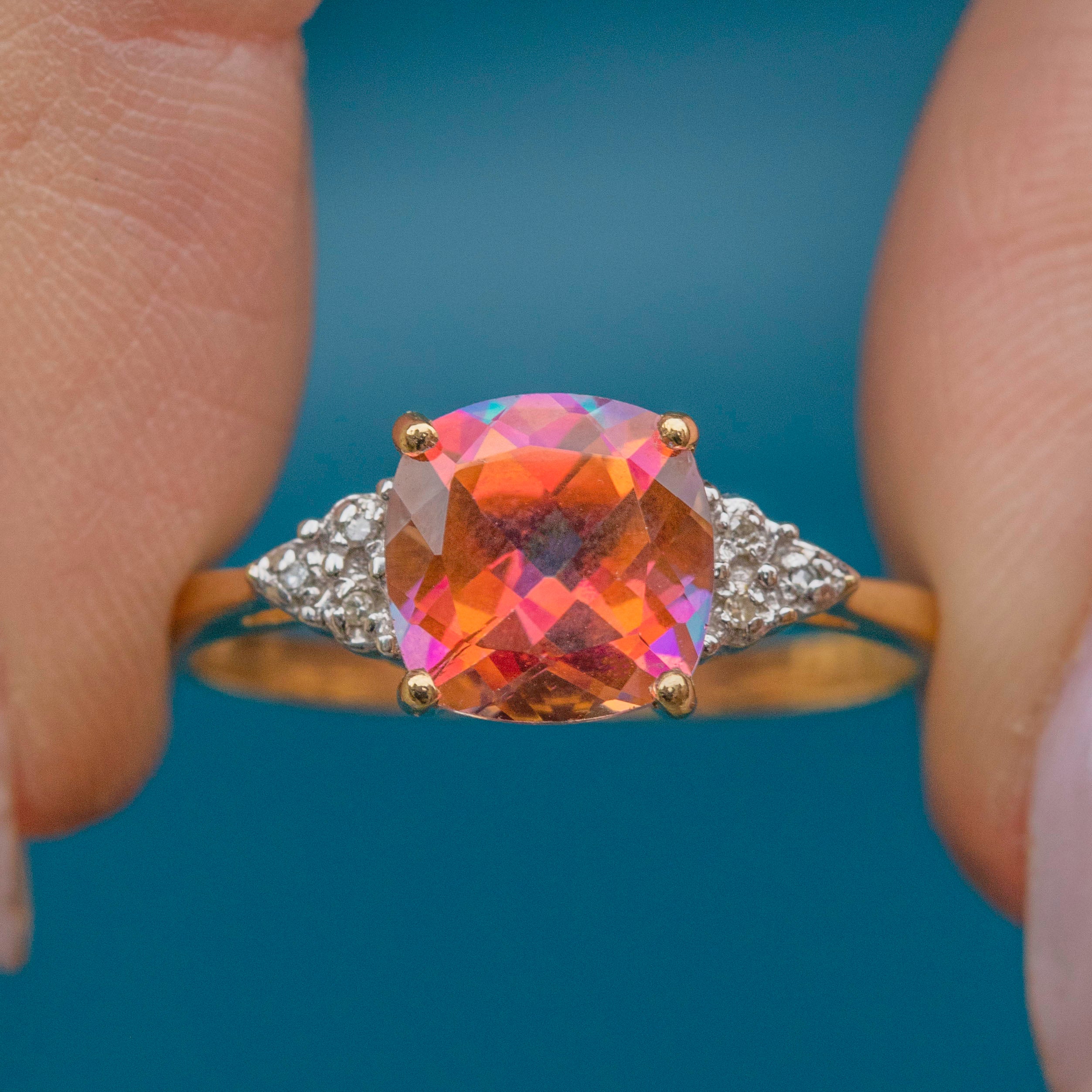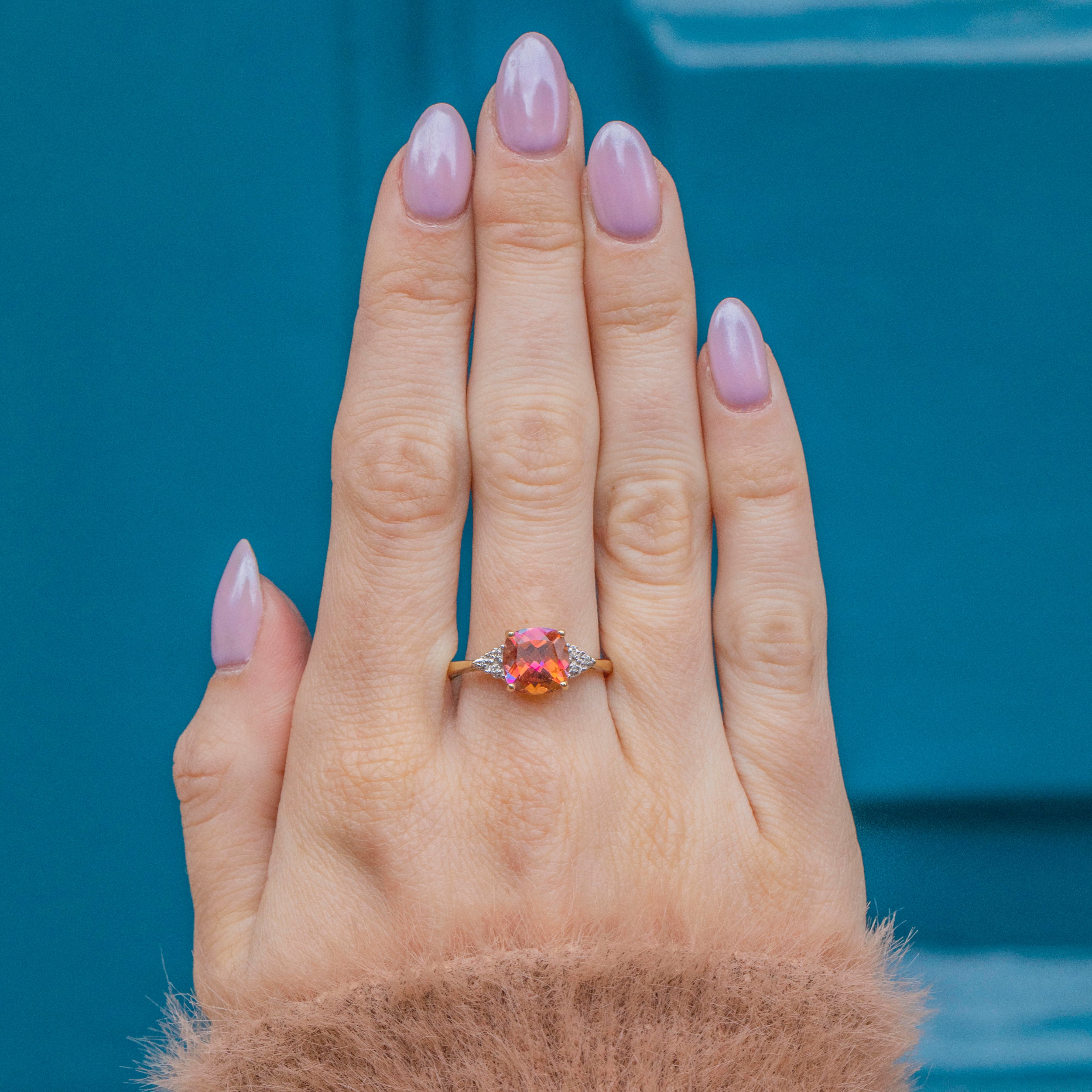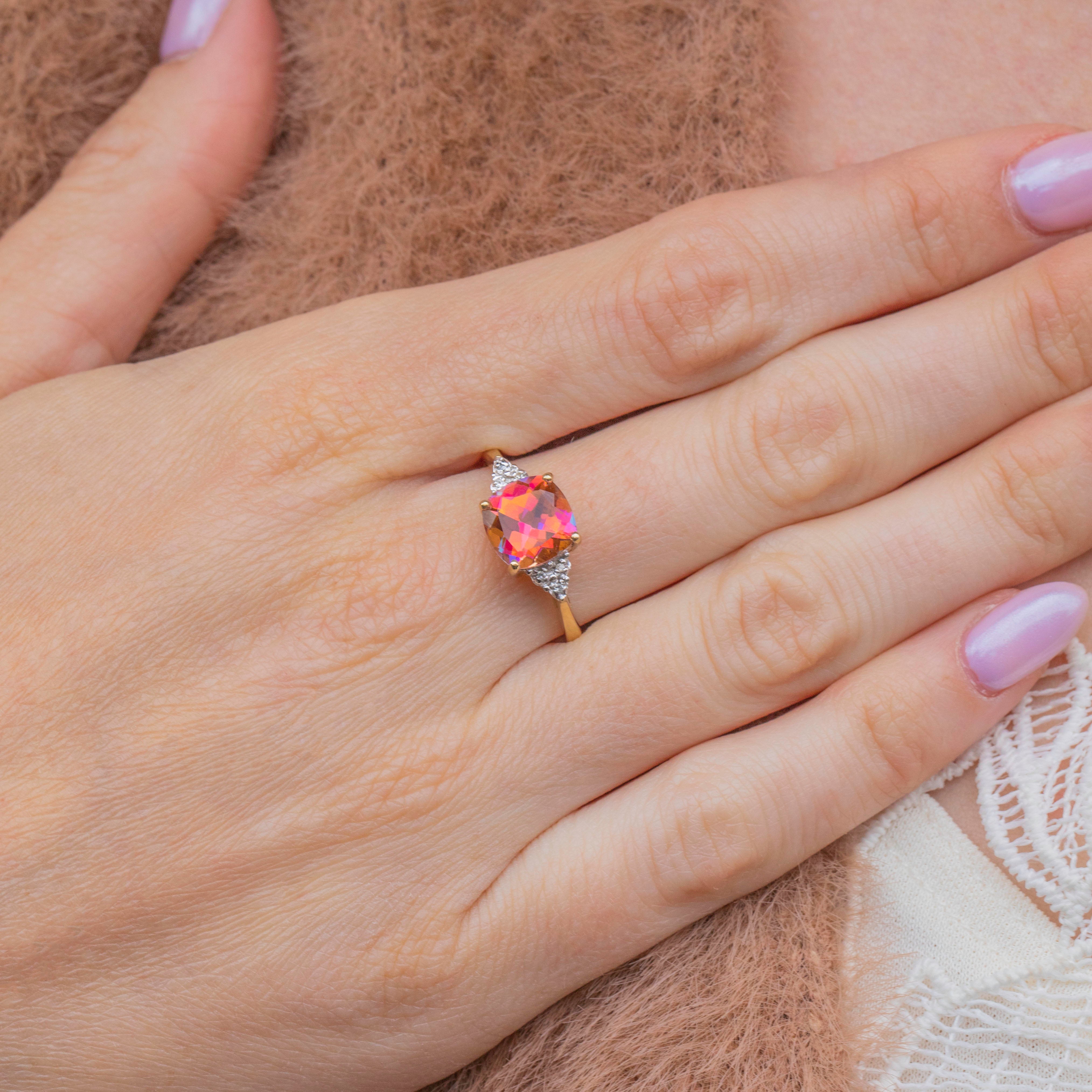 This peachy pink 9ct Gold Mystic Topaz Diamond cluster ring is simply adorable! Boasting a magnificent 2.85ct Mystic Topaz with rainbow flecks of hot pink, oranges, and a few flashes of blue, she will make a mesmerising addition to your growing jewellery collection!