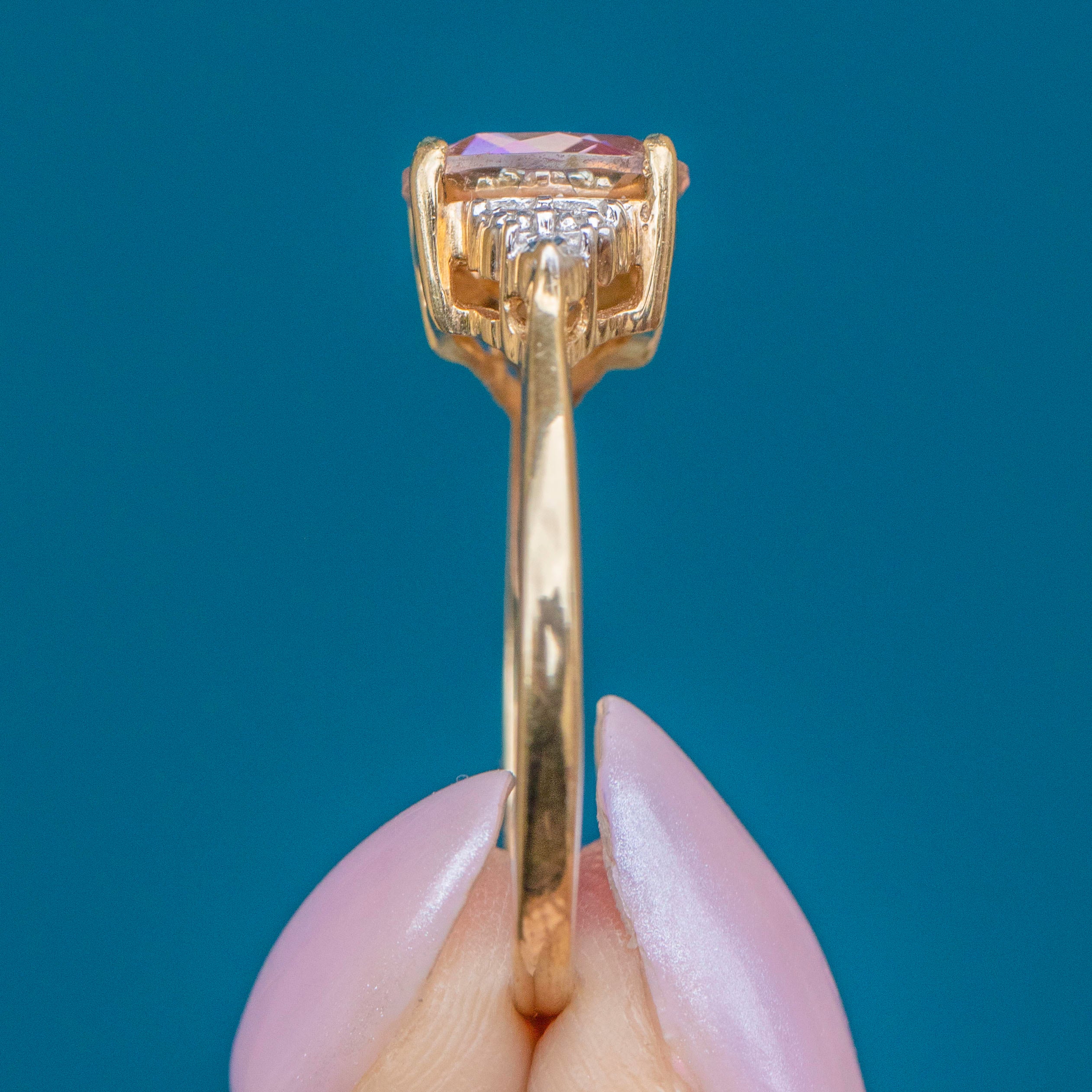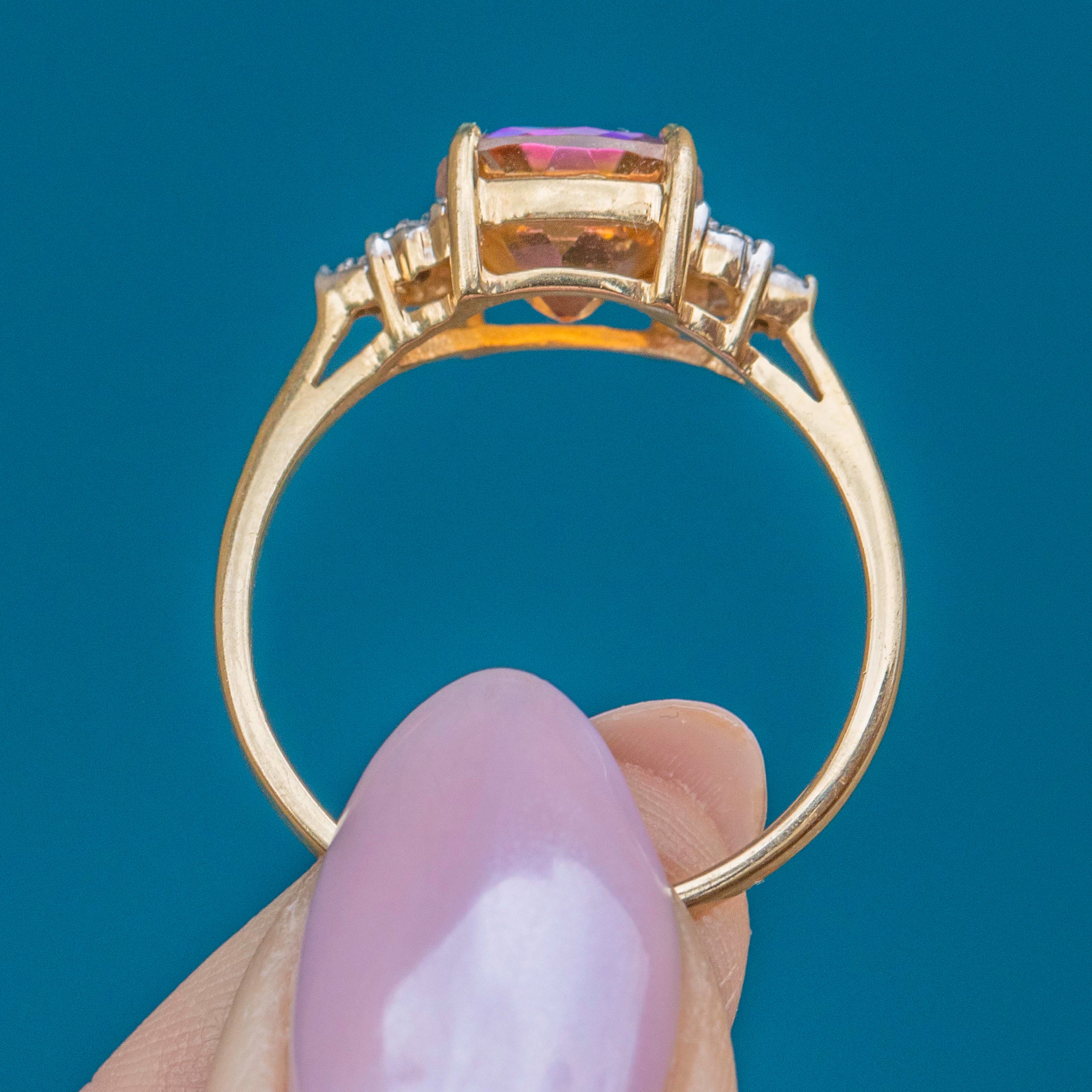 Her Mystic Topaz is accompanied by scintillating Diamond encrusted shoulders adding a sparkling accent. Not only is this Vintage Gold ring endlessly pleasing to look at, but she is also super comfortable to wear. The colour of that Mystic Topaz just melts into her sumptuous 9ct Gold band- how could you resist her?!