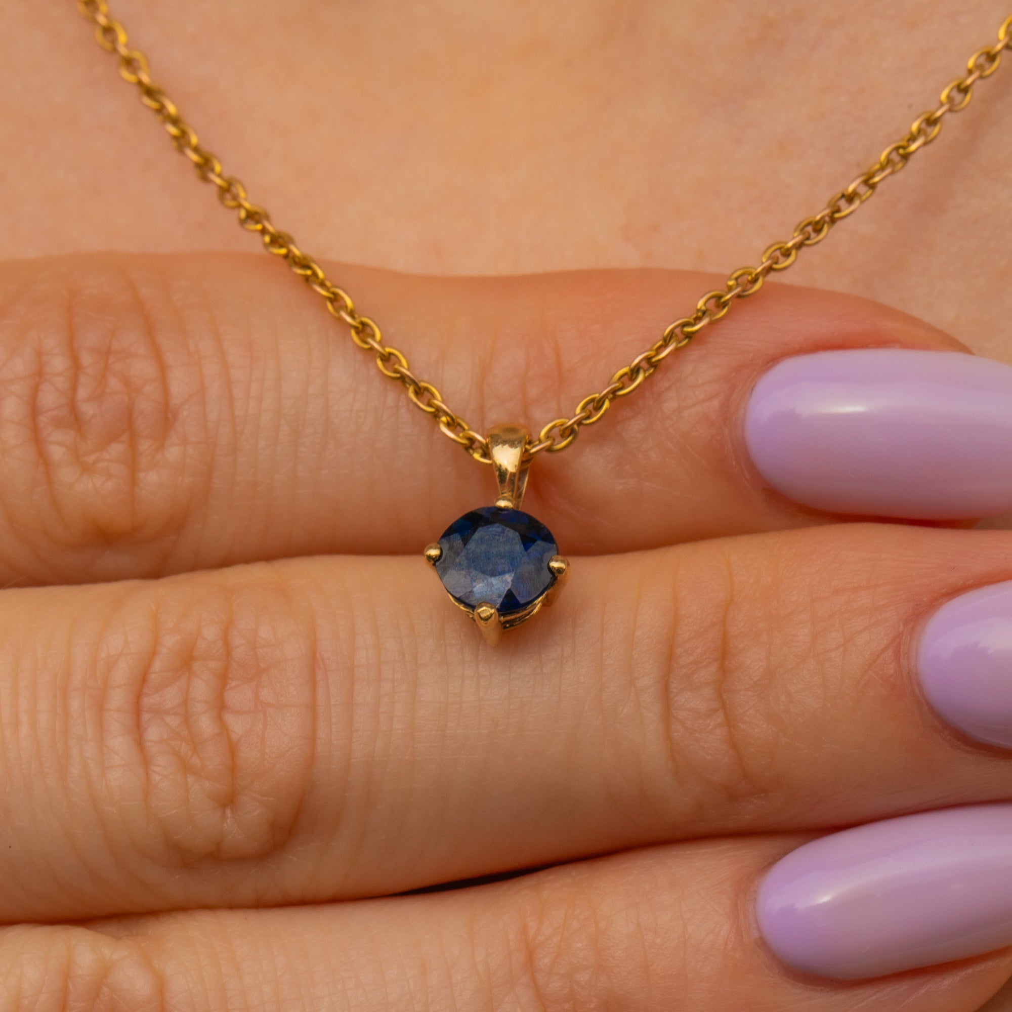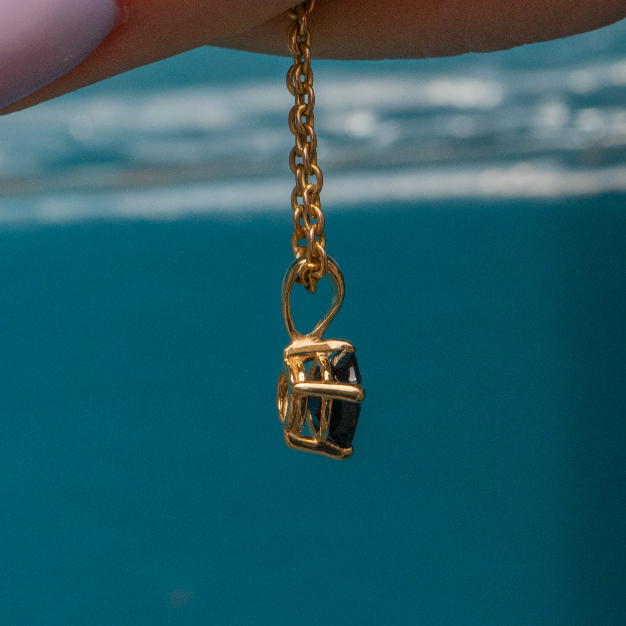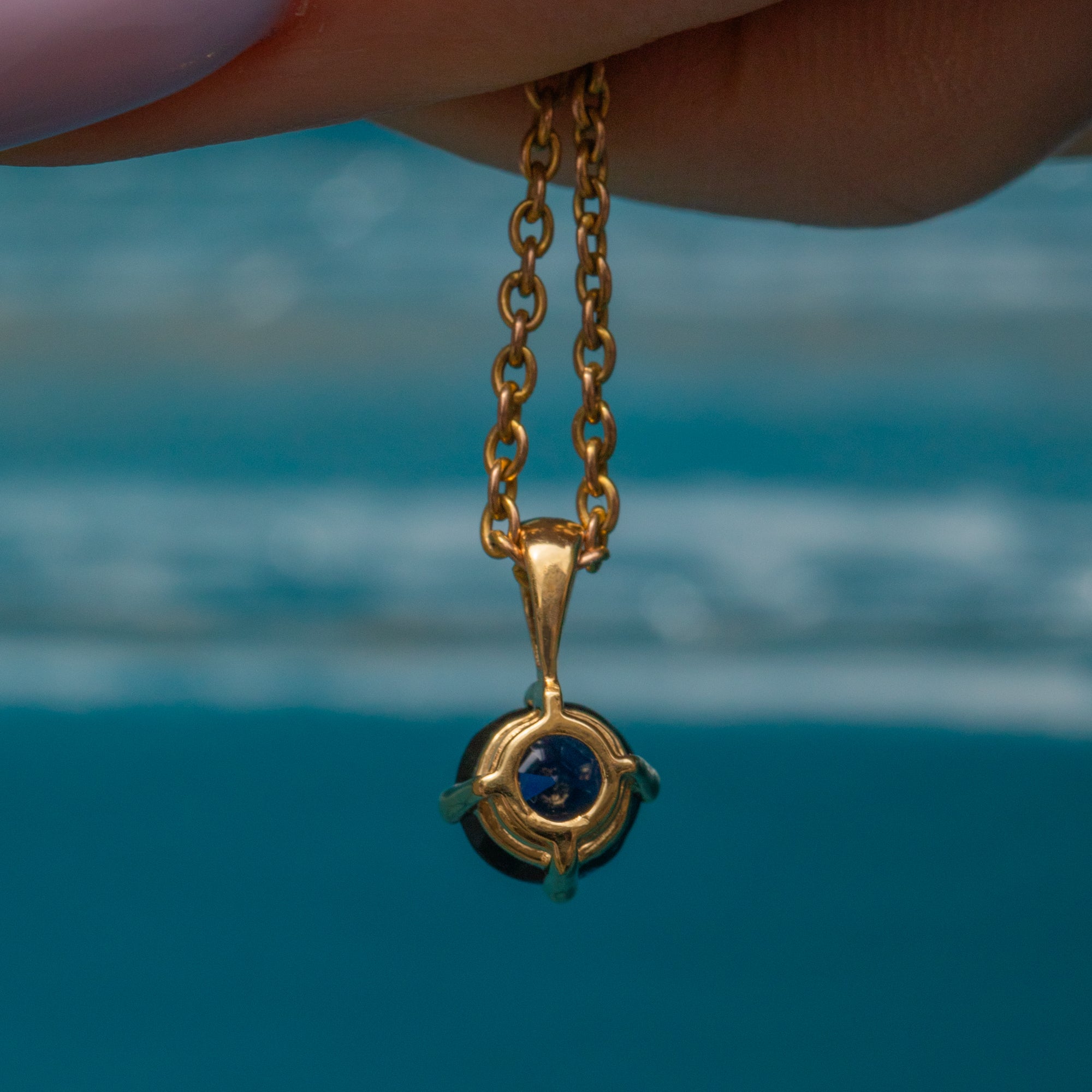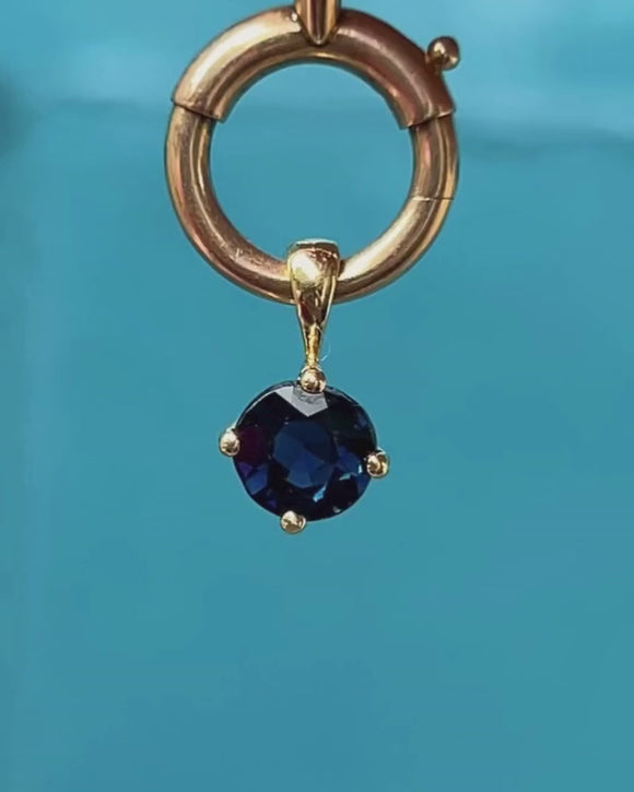 Her rich, buttery 9ct Gold bezel setting hugs her natural Sapphire tightly as this Vintage charm is suspended from a dainty Gold chain. She will look at home affixed onto a bolt ring nestled between your other dainty charms, or wear her alone to add an accent of colour to any outfit.