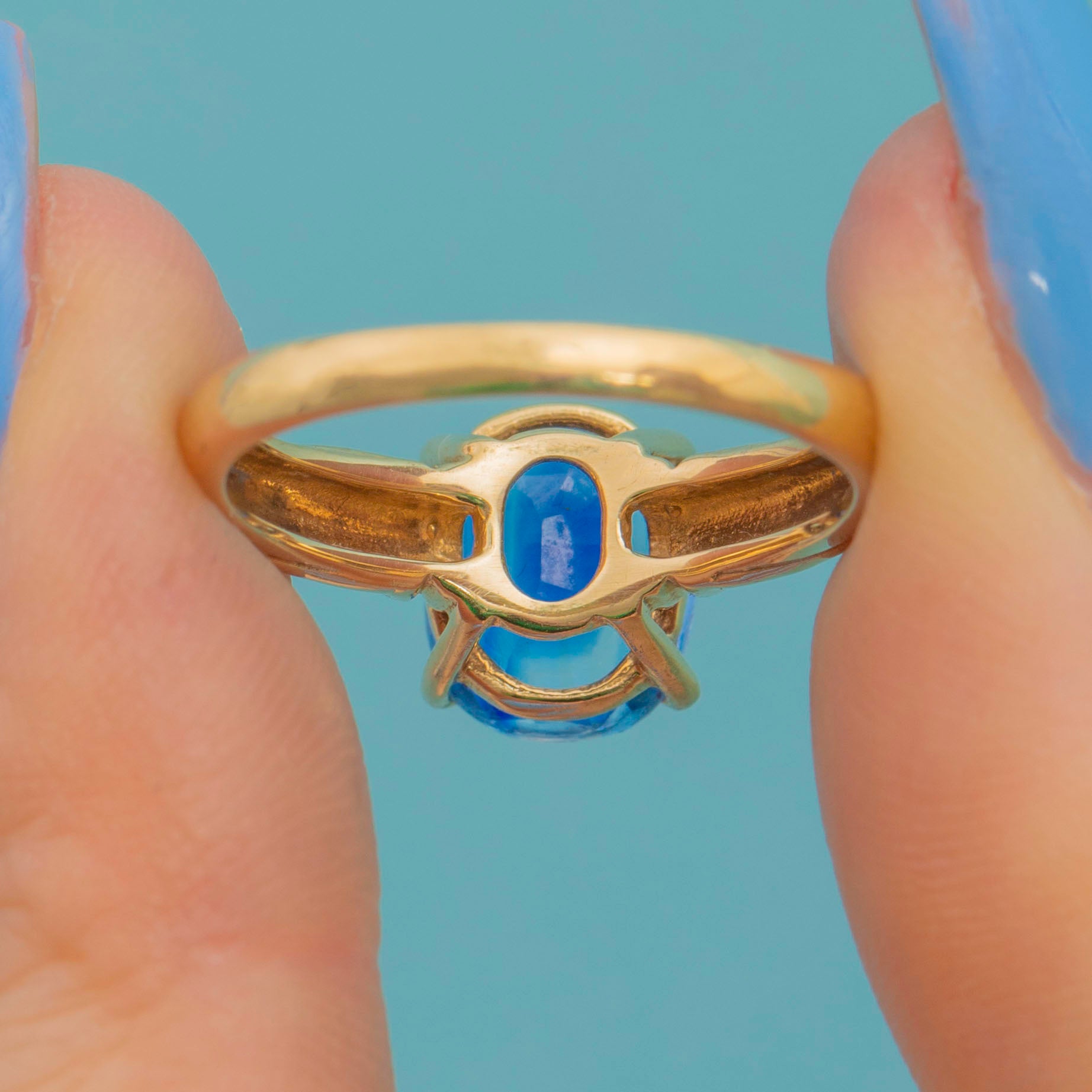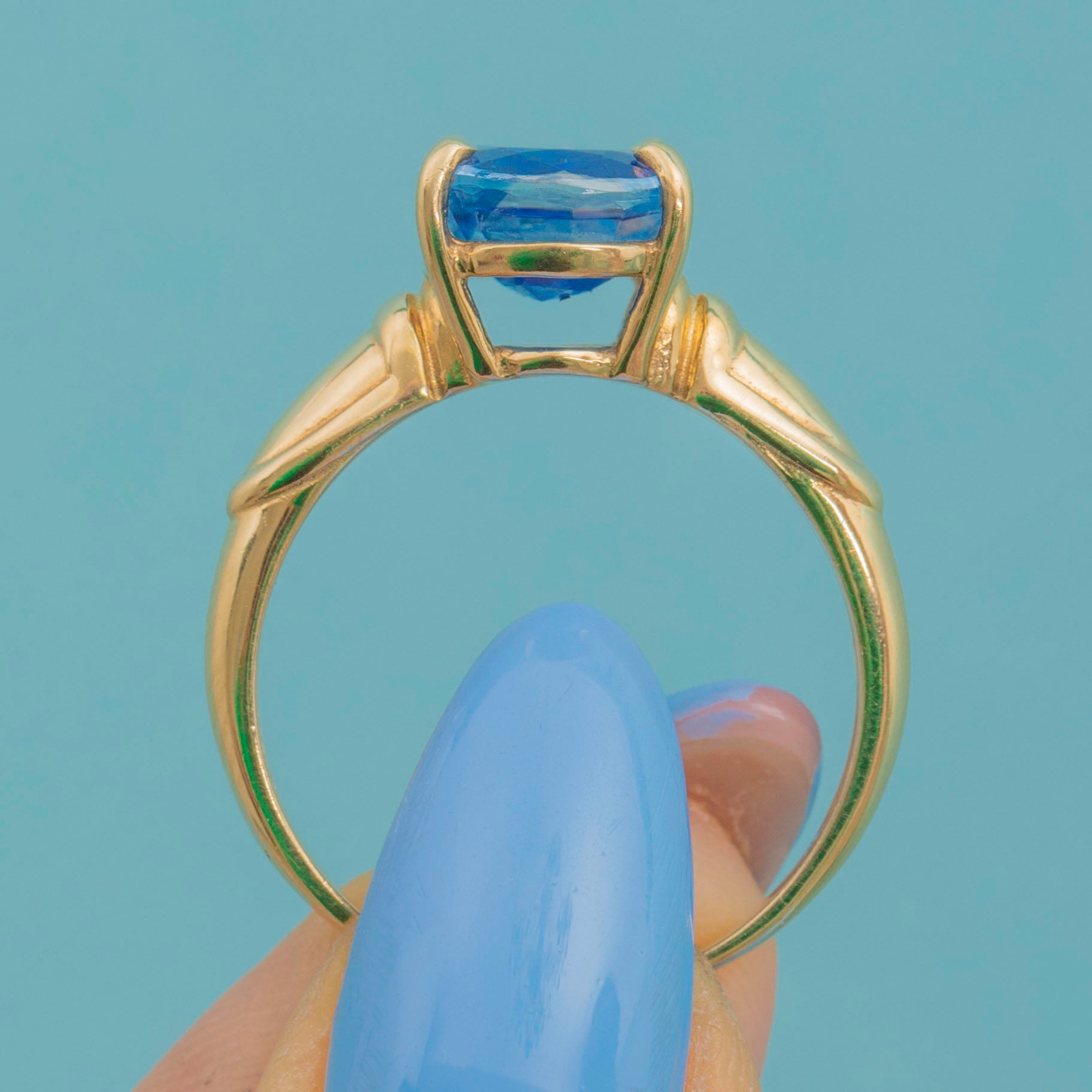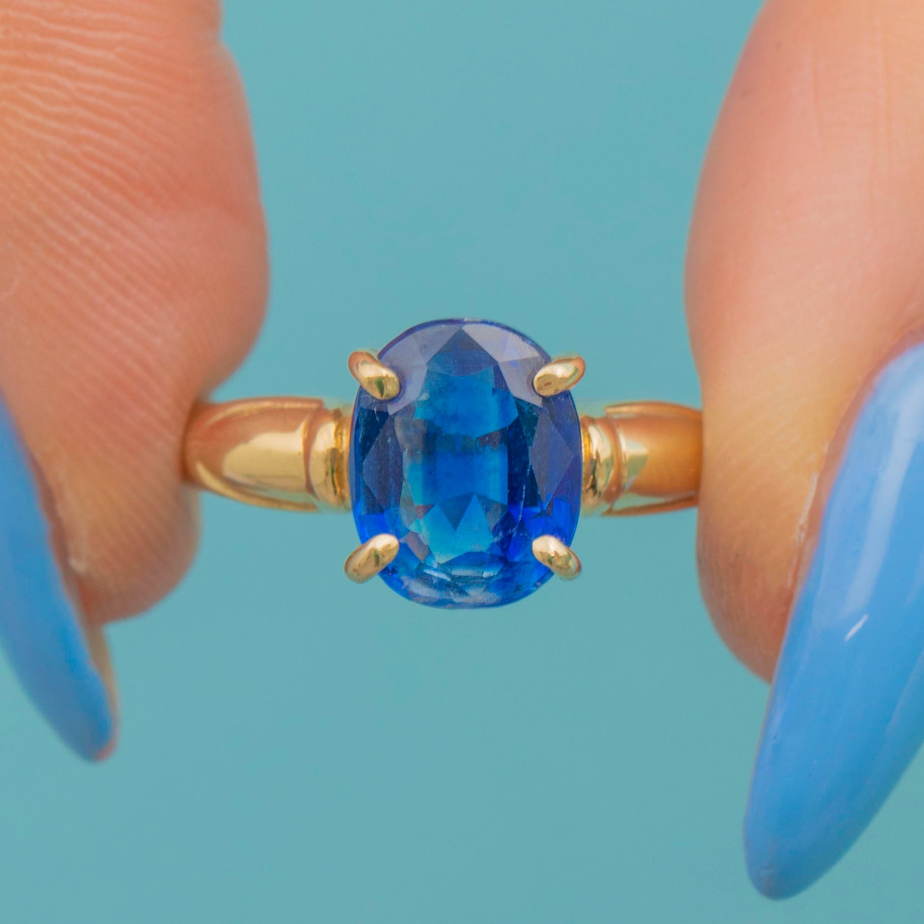 The chunky 9ct Gold band wraps around your finger with undeniable luxury, holding the Sapphire proudly from the finger in a double basket setting that allows the light to stream through from every angle. Guaranteed to turn heads, this vintage Sapphire ring will make an impact wherever she goes!